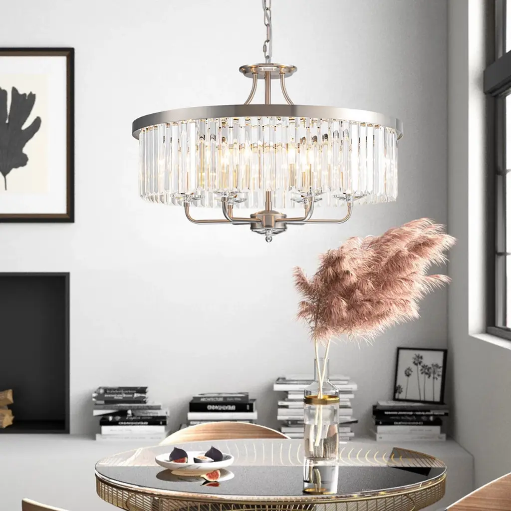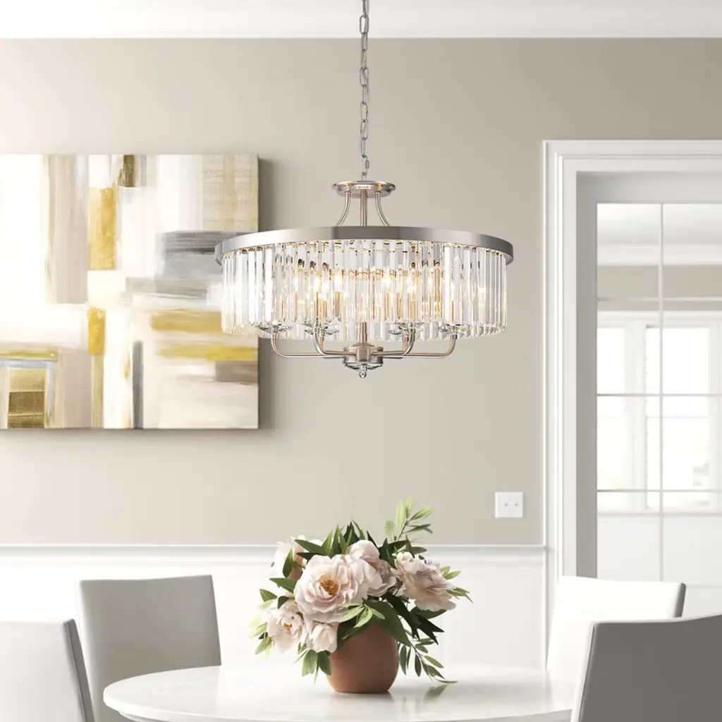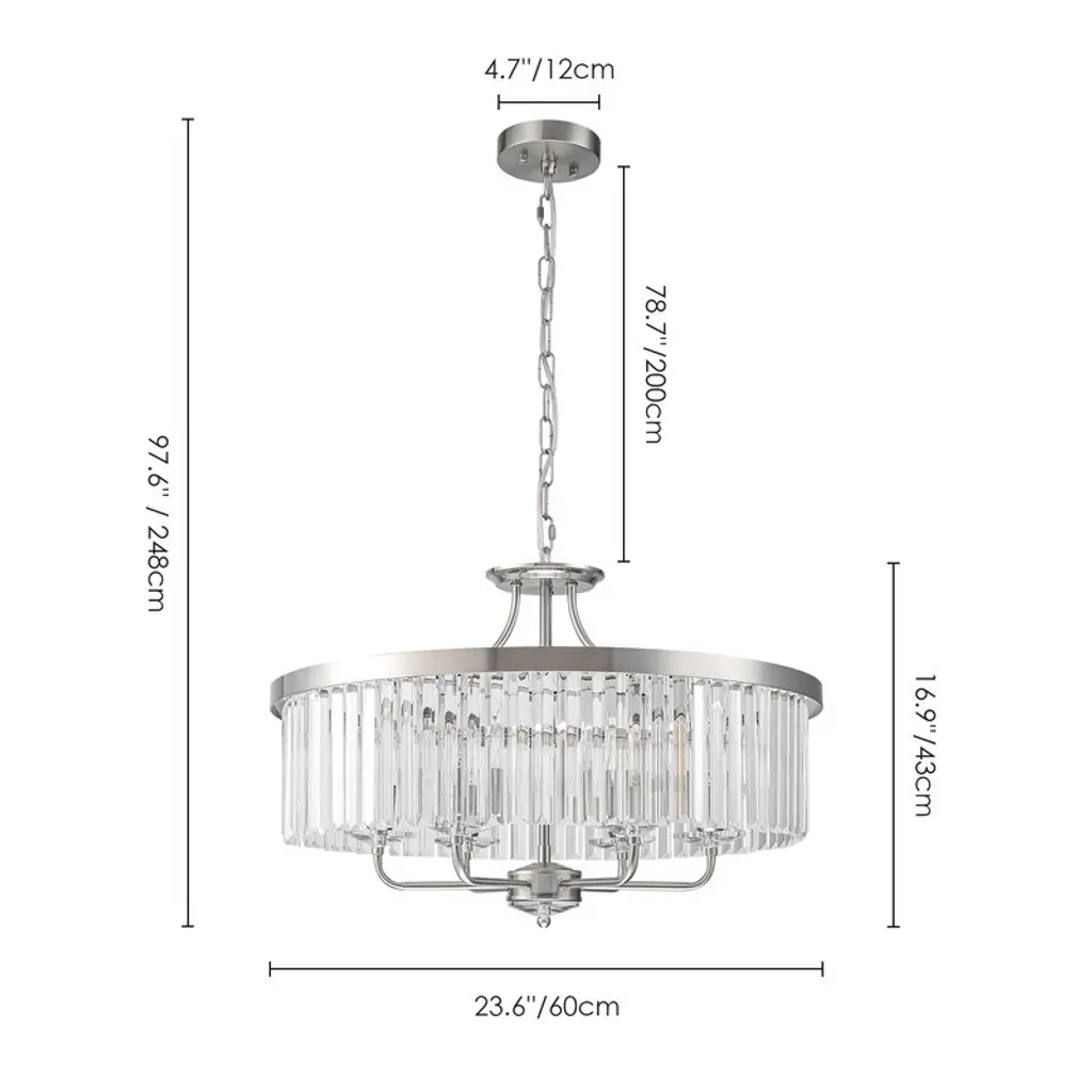 Illuminate your space with this 23" classic transitional chandelier featuring dazzling crystal prisms. Its multi-faceted crystals create sparkling rainbow refractions, casting vibrant light patterns on walls and ceilings. Perfect as a focal point, this dimmable fixture adds luxurious ambiance and dynamic lighting to any room. Easy to install and compatible with E12 bulbs up to 60W (bulbs not included), it enhances farmhouse and Mediterranean charm with eye-catching geometric artistry. Elevate your d¨¦cor with this stunning centerpiece that blends classic style and modern elegance effortlessly.