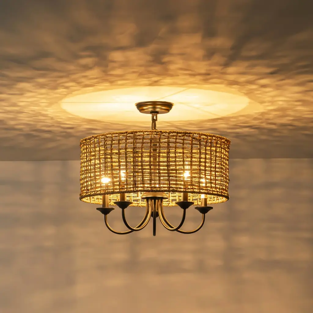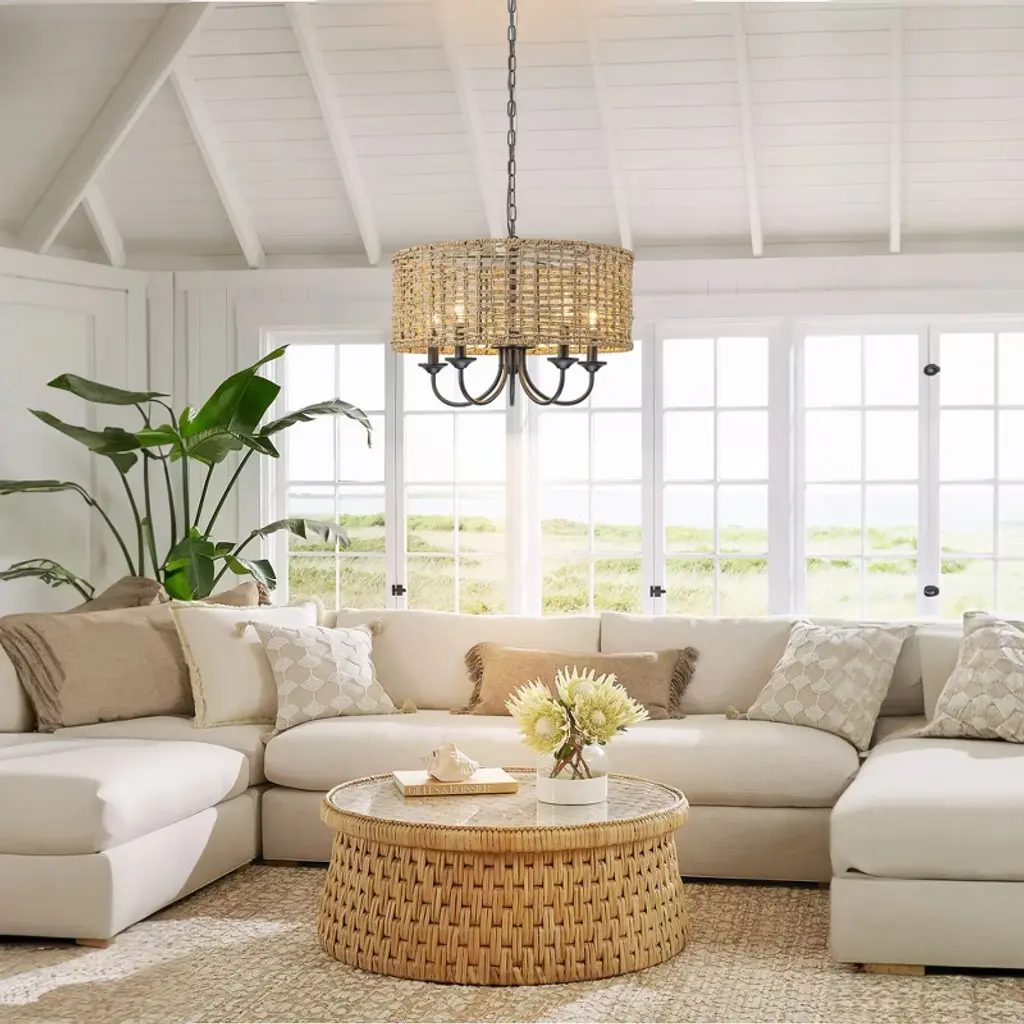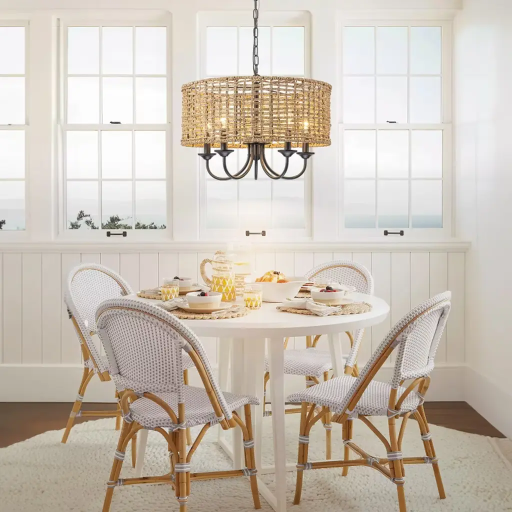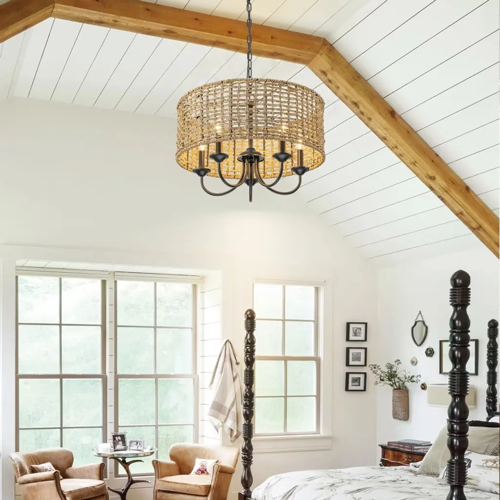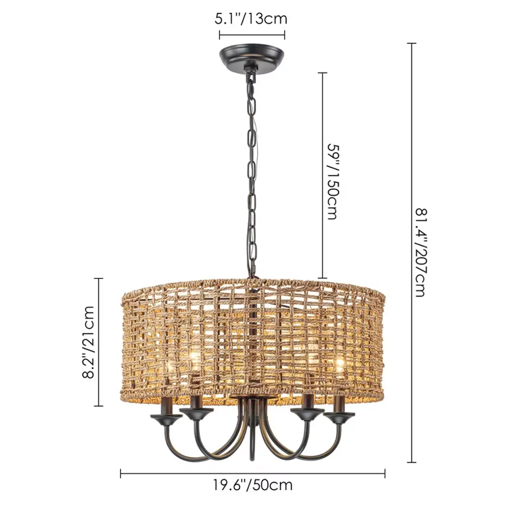 Elevate your home with this 19-inch boho chandelier featuring a natural woven drum shade that softens light and adds texture to any space. Designed with five E12 candle-style sockets, it supports 60W dimmable bulbs (not included), giving you full control over ambiance. The handwoven rattan pattern brings warm, organic charm to dining areas, bedrooms, or entryways. Its neutral tones complement coastal, bohemian, or modern interiors effortlessly. Built for easy installation with all necessary hardware included, this chandelier turns everyday lighting into a statement. Whether you're hosting guests or relaxing at home, it creates a cozy and stylish atmosphere that reflects your taste.