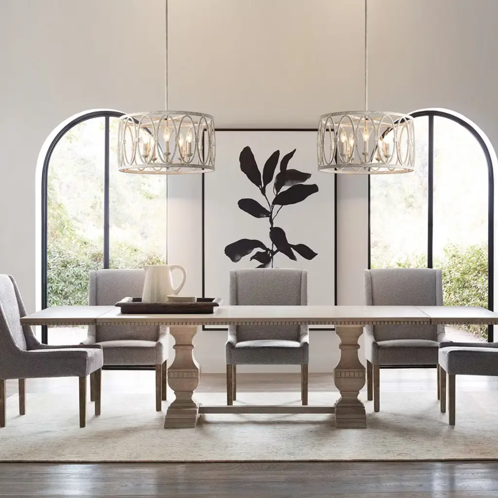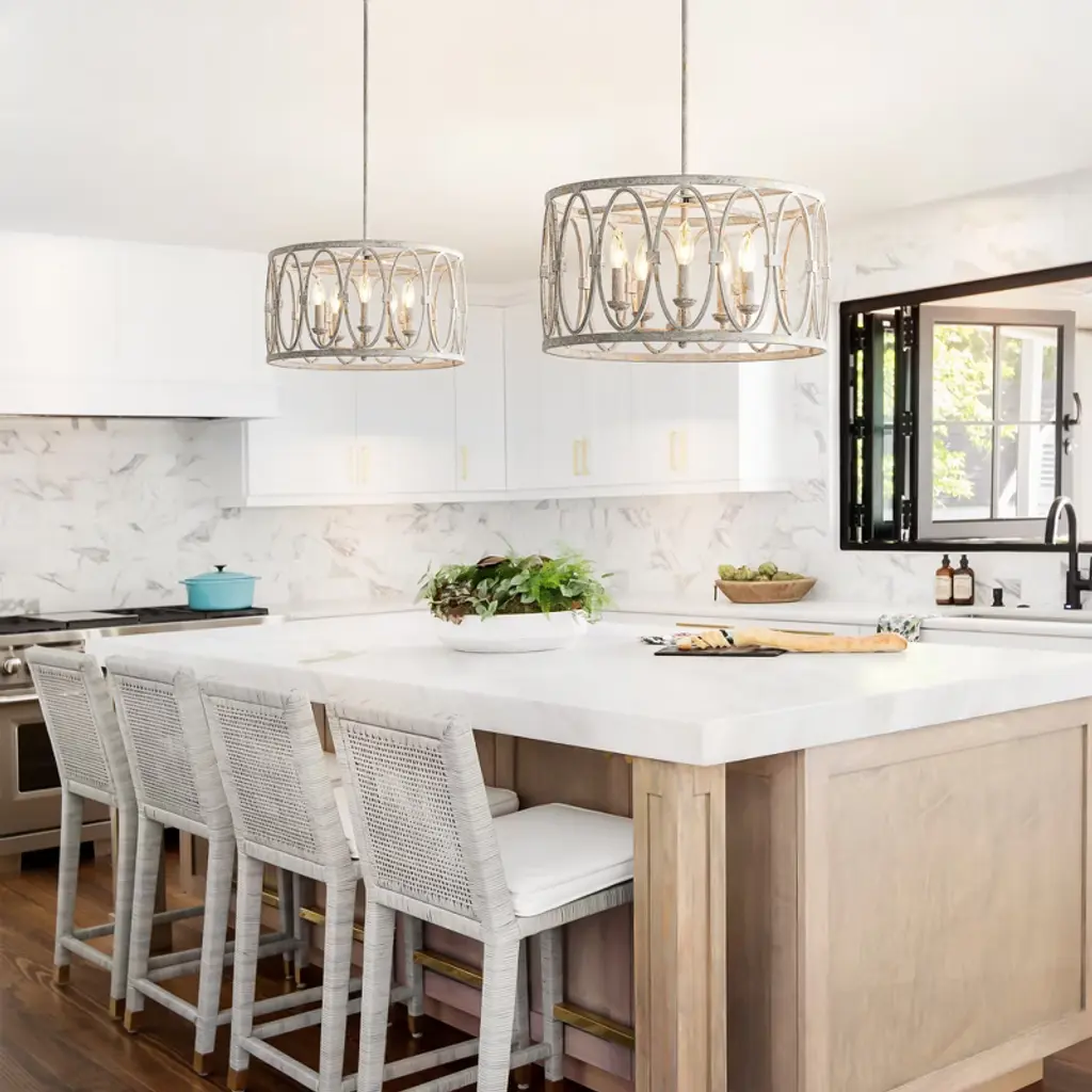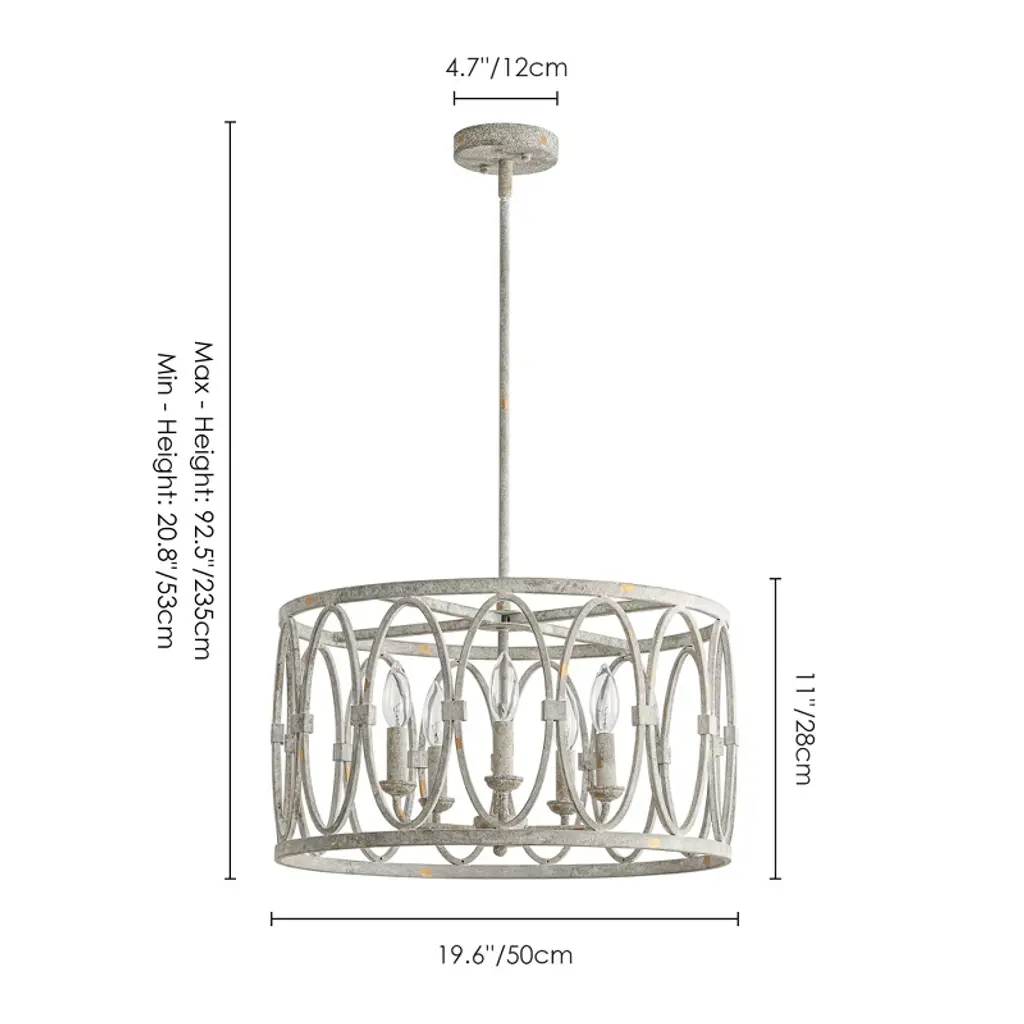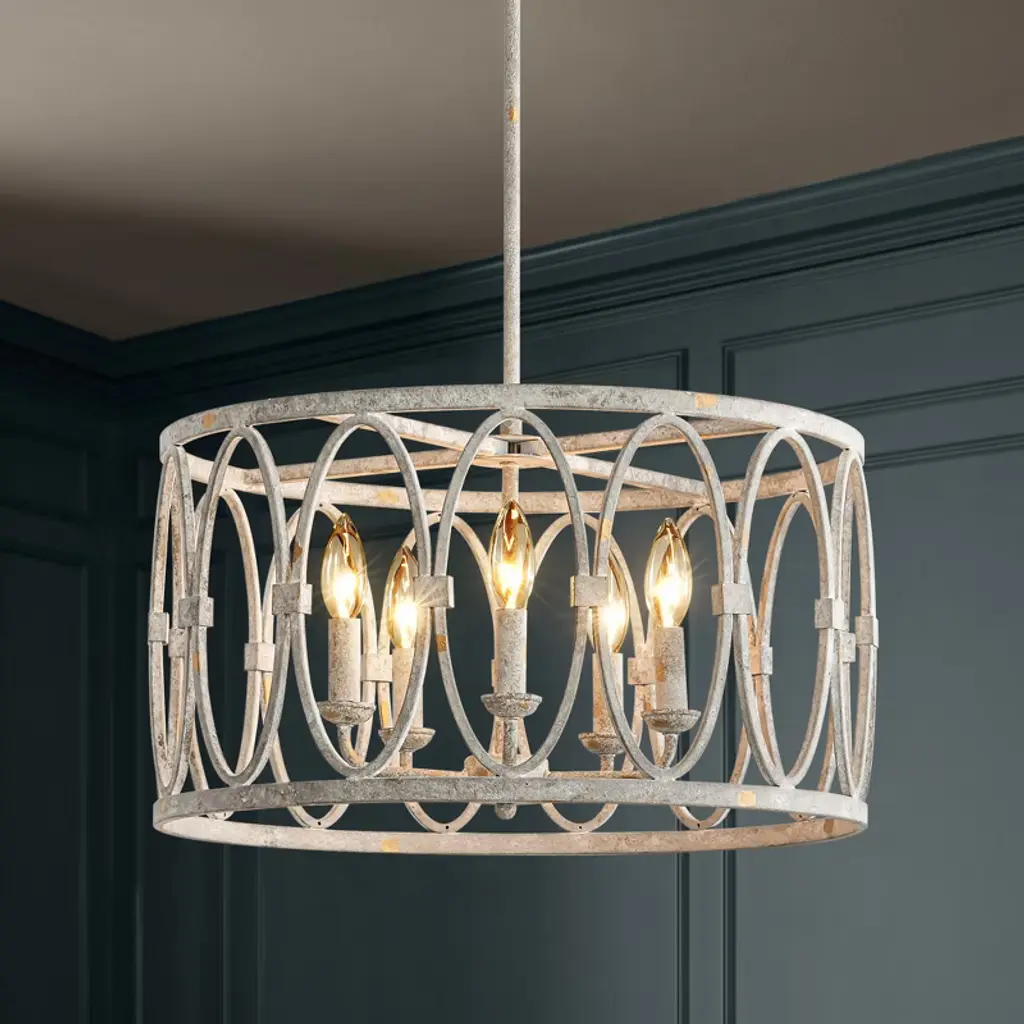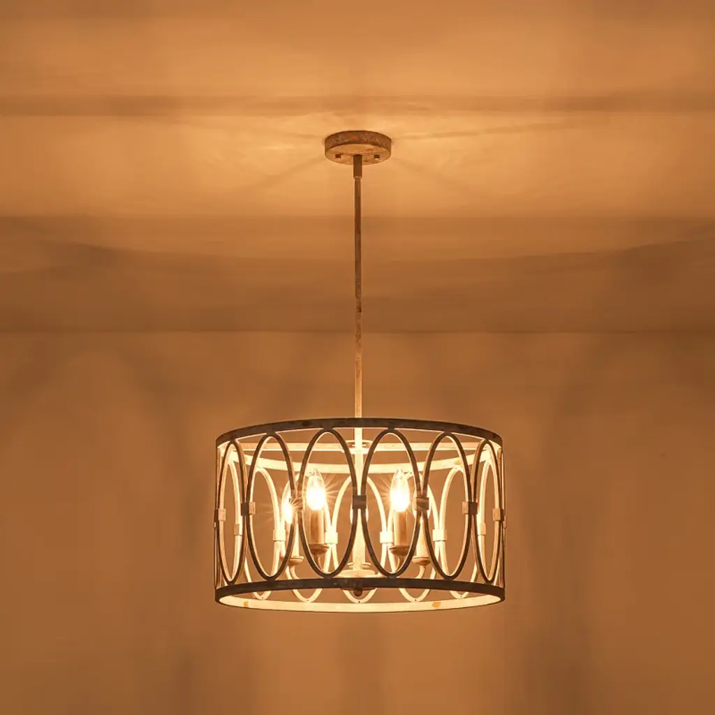 Illuminate your space while enhancing its style with this 5-light 19" rustic industrial drum pendant light, finished in deep abyss for a weathered, shipwreck-inspired look. Showcasing a robust, tactile texture, this chandelier offers a sturdy design with intricate craftsmanship. Its simple yet versatile design, featuring oval motifs, complements a wide range of decor styles. Rated for damp locations, this industrial light fixture works well in both indoor and covered outdoor spaces. It is compatible with E12 bulbs (not included) and creates an intriguing focal point that elevates any room.