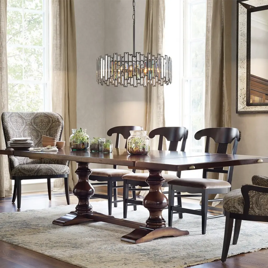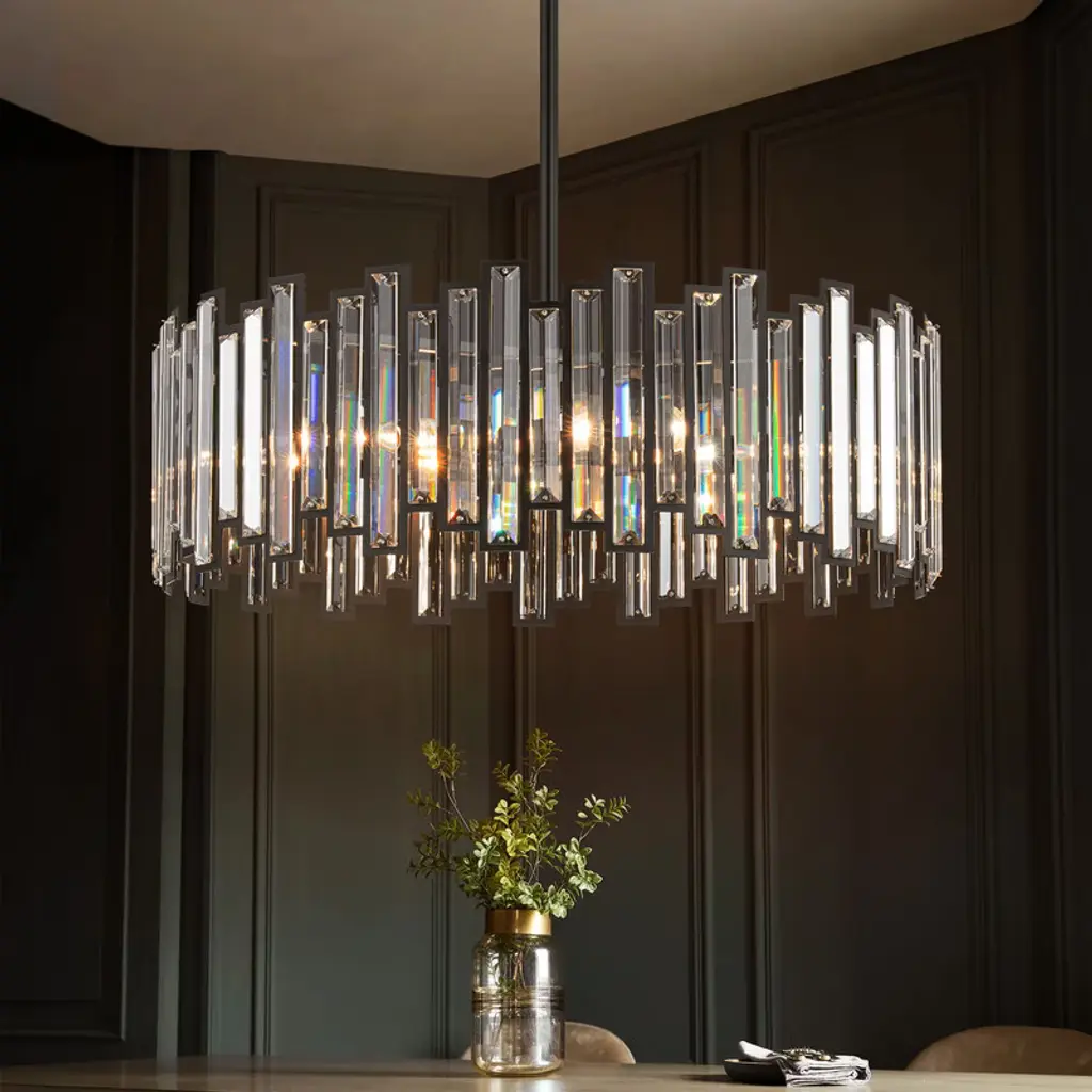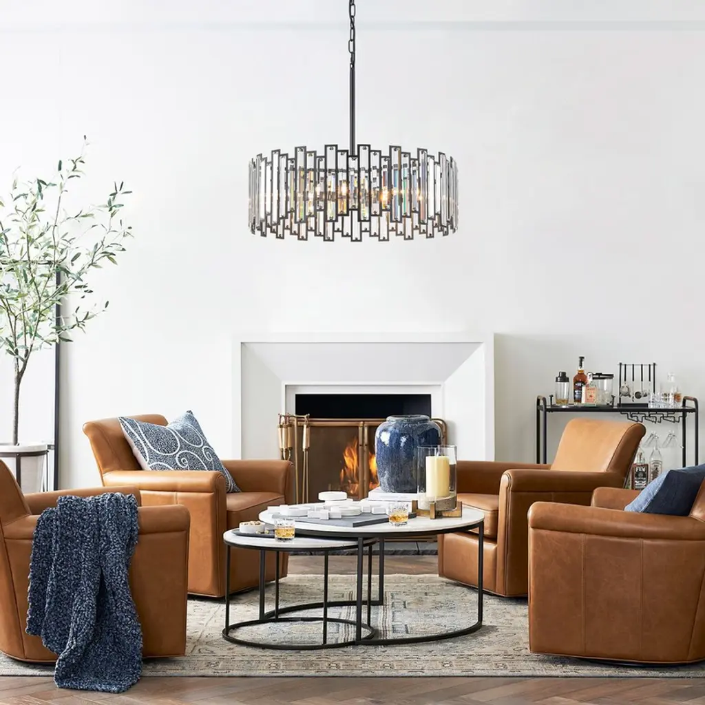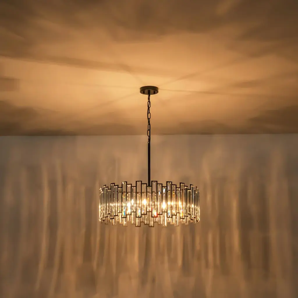 Elevate your space with this 23 inch mid-century modern chandelier featuring a layered crystal panel design and sleek metal frame. Perfect for dining rooms, bedrooms or living areas, this fixture combines retro charm with contemporary elegance. Six E12 sockets support 60W dimmable bulbs (not included), allowing you to create the ideal ambiance. The shimmering crystal accents diffuse light beautifully for a warm inviting glow. With included hardware, installation is quick and easy. Add a statement piece that blends timeless design with functional brilliance.