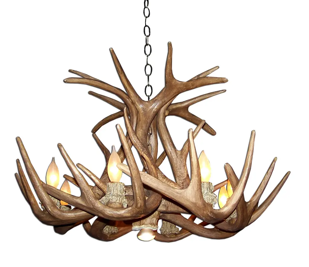 Reproduction Antler Whitetail Deer Chandelier (25-26"D x 17"H) 6 light sockets, 3 feet of Rustic Bronze ChainHandmade in North America using top quality reproduction antlers. Sockets are made to resemble Real Naturally Shed Antler, each rated up to 40 Watts.Wires are all seamlessly threaded through the antlers, hidden from view.CSA/UL Approved.Bent Tip Candelabra Bulbs included.Certified in U.S & Canada (CSA listed to comply with UL 1598)Hardwired
