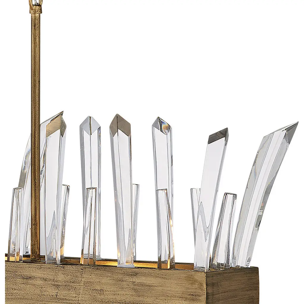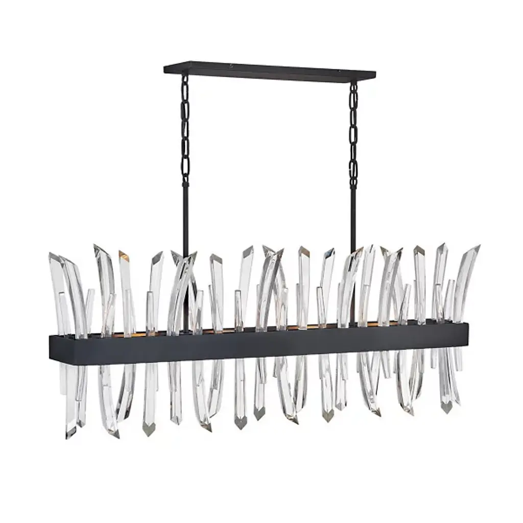 A compelling design that captivates from any angle, the Revel family gleams with sophistication. Luxurious crystal rods are honed into unexpected asymmetrical formations to produce an organic elegance that is both raw and refined. Revel's linear and circular chandeliers are available in both Burnished Gold and rich Black finish options.