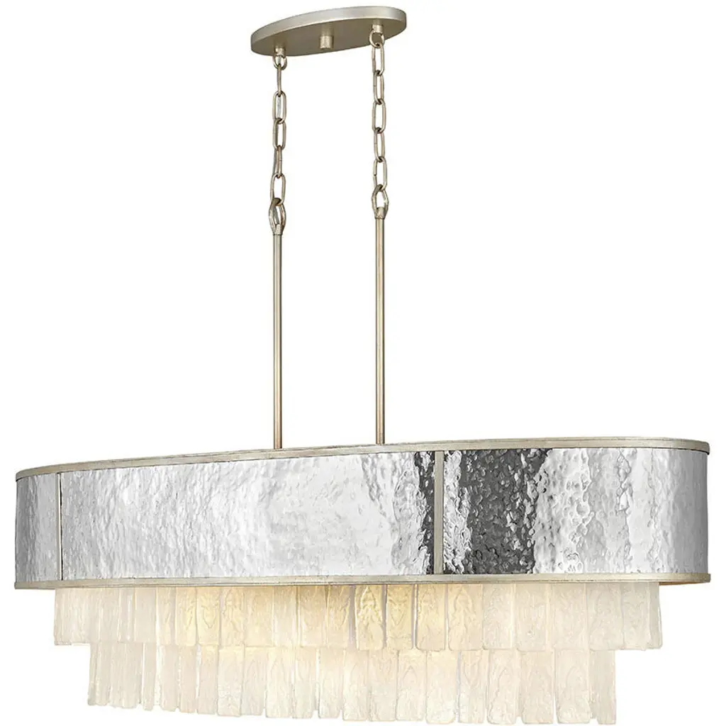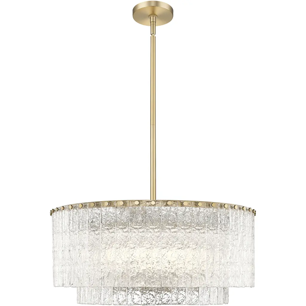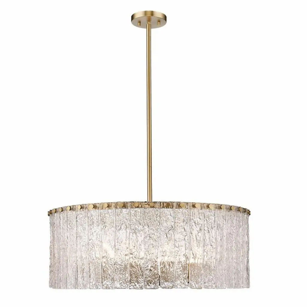 The Reverie Chandelier by Fredrick Ramond is a transitional fixture with a stunning design that’s worthy of a glam-style room. Textured crystals hang from a hammered stainless-steel drum, and a Champagne Gold finish draws in the eye. Available in a 26” or 36” diameter, this chandelier looks marvelous over a dining room table. Features
