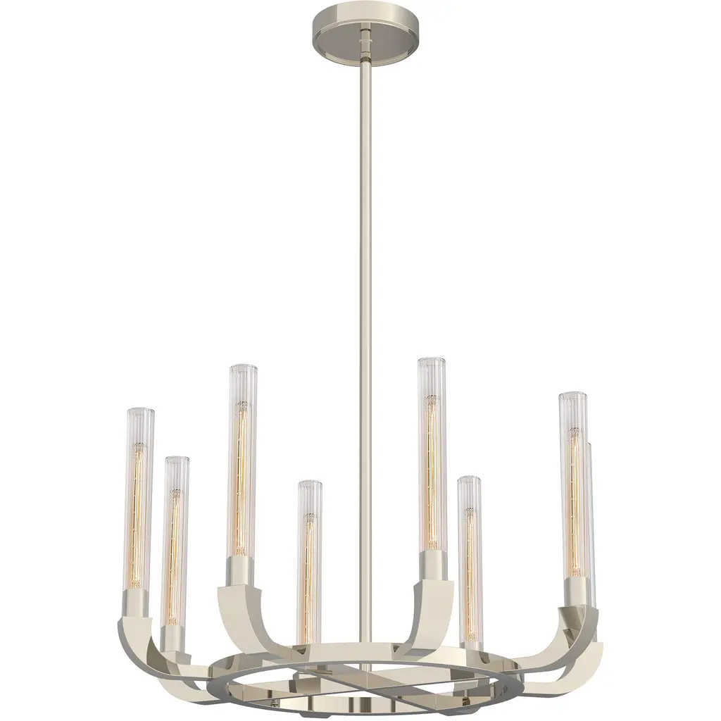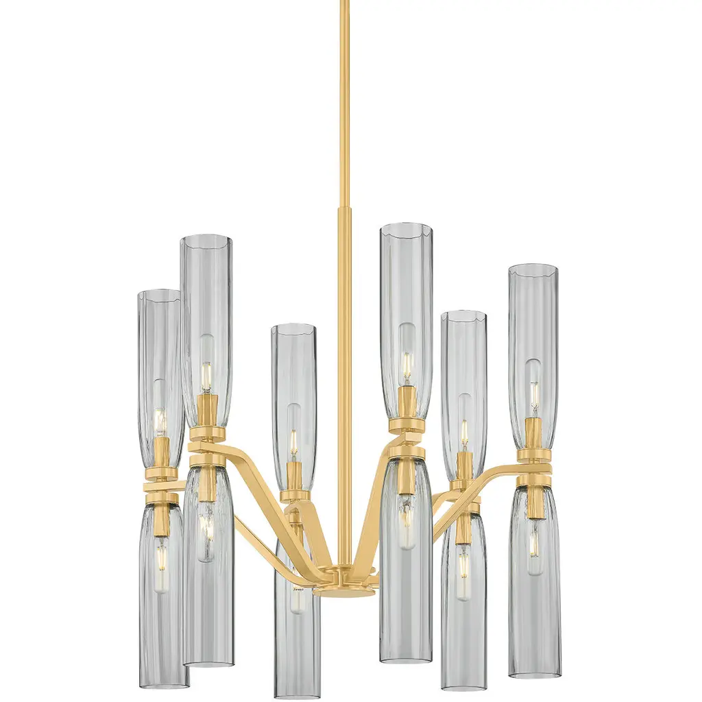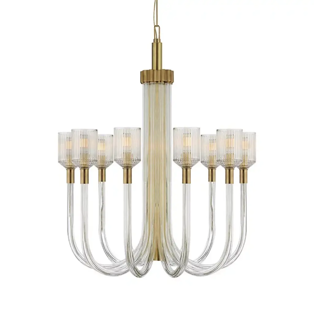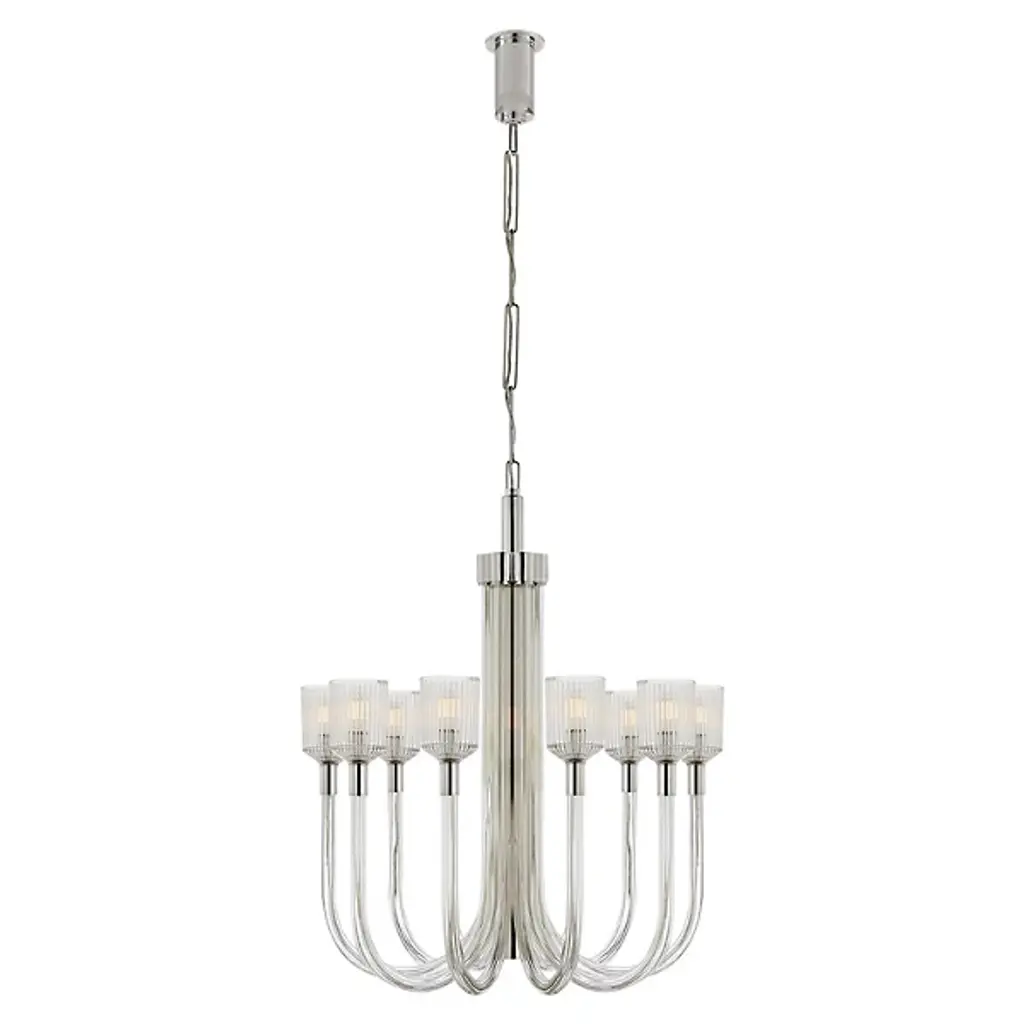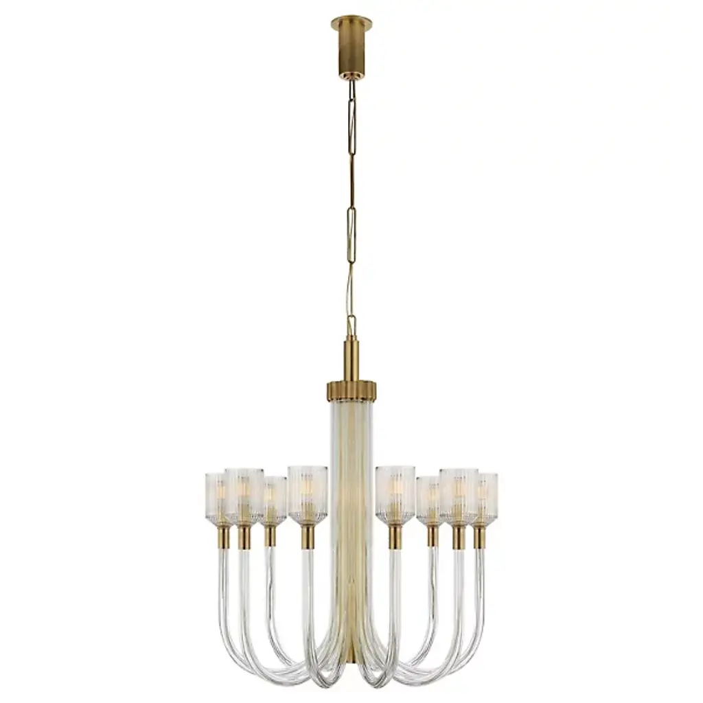 Designed by Kelly Wearstler, Visual Comfort Signature, formerly known as Visual Comfort, presents the transitionally styled Reverie Chandelier. Also drawing from a mid-century modern-inspired aesthetic, the composition of brass and glass along the entire structure provides an alluring focal point. This single-tier luxury light furnishing is suitable for indoor locales, including humid or damp spaces like a bathroom or steamy kitchen. A clear ribbed glass shade detail provides pleasant diffusion of light, while the LED capability provides low energy consumption and a long lifespan.