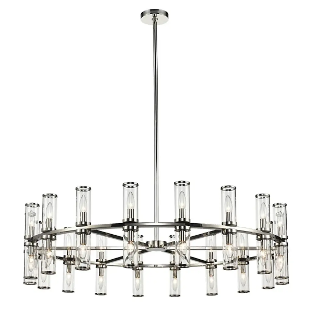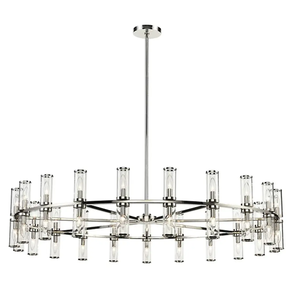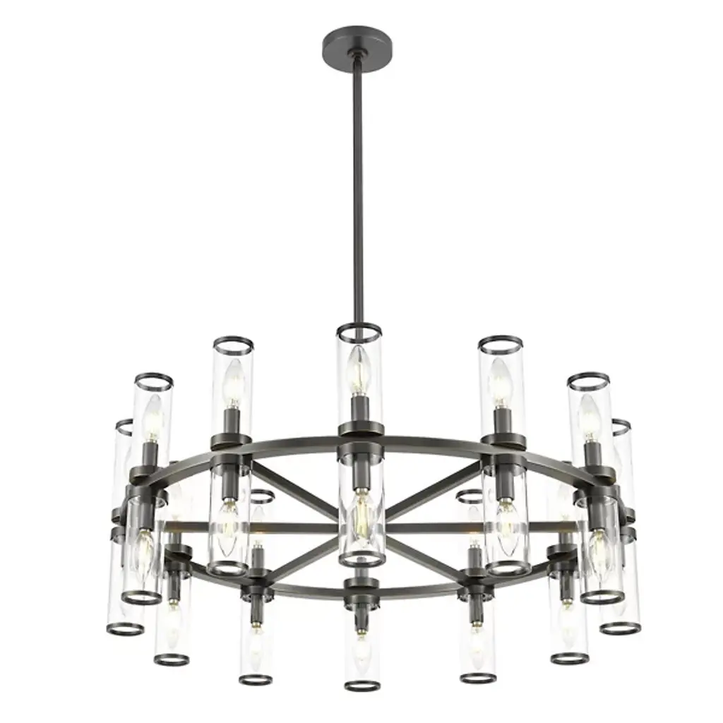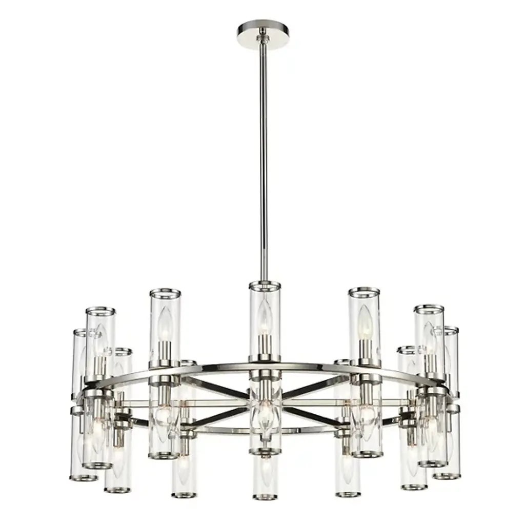 A centerpiece of luxury and style your ceiling lighting setup will revolve around. Revolve 2-Tier Chandelier by Alora Lighting is a prime example of rounded elegance, with subtle shapes and shiny finishing bringing a degree of opulence to your space. The circular Metal frame features rectangular bars traveling to the center, making it resemble a wheel. Multiple cylindrical Glass shades rest above and below the frame’s surface, diffusing the light from candelabra bulbs with subdued elegance.