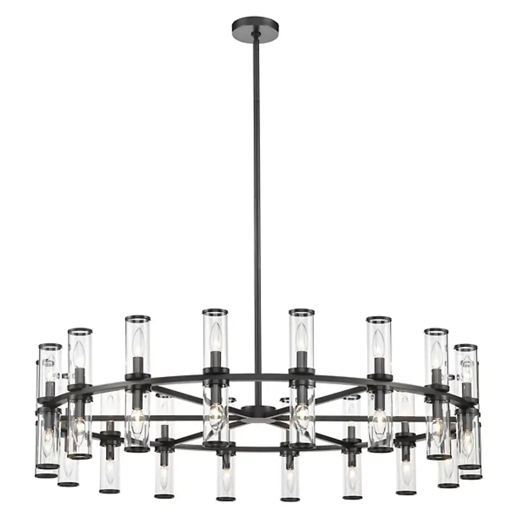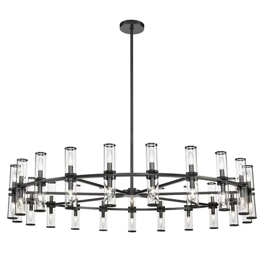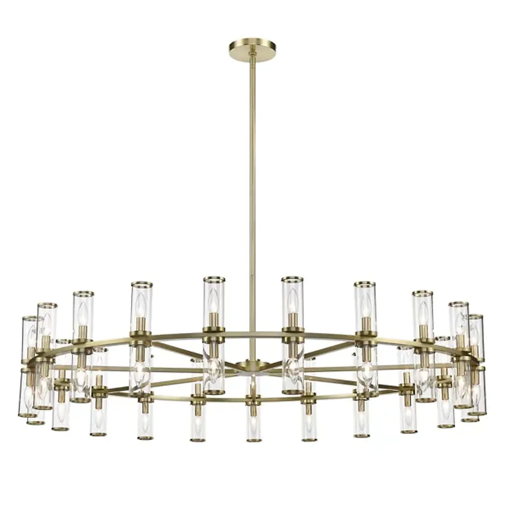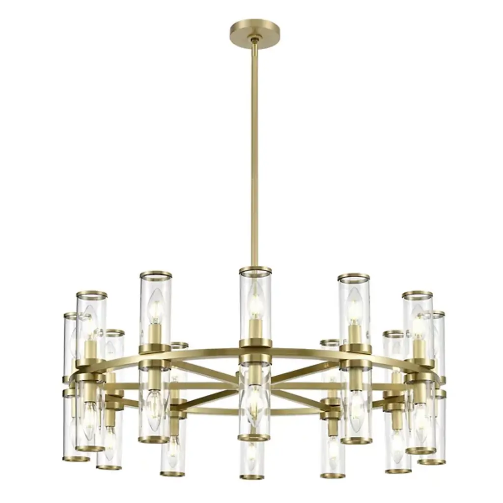 A centerpiece of luxury and style your ceiling lighting setup will revolve around. Revolve 2-Tier Chandelier by Alora Lighting is a prime example of rounded elegance, with subtle shapes and shiny finishing bringing a degree of opulence to your space. The circular Metal frame features rectangular bars traveling to the center, making it resemble a wheel. Multiple cylindrical Glass shades rest above and below the frame’s surface, diffusing the light from candelabra bulbs with subdued elegance.