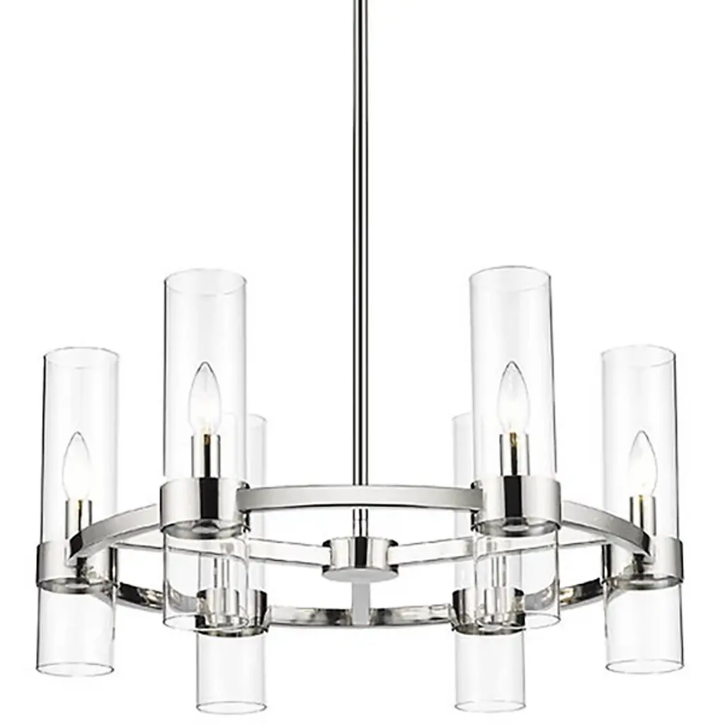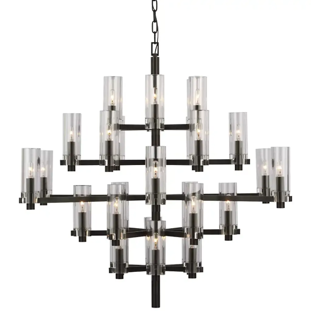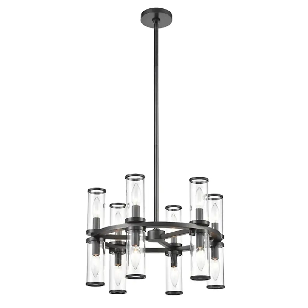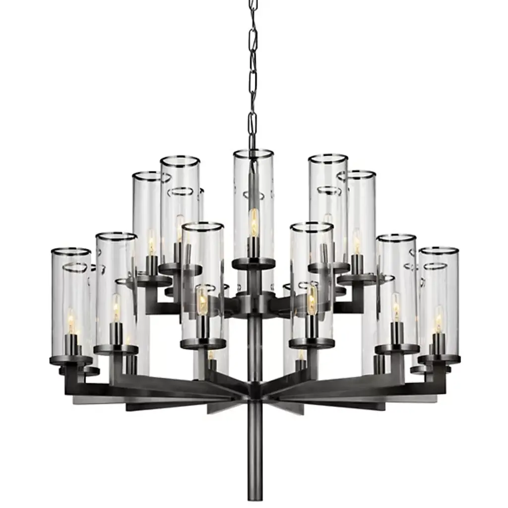 A centerpiece of luxury and style your ceiling lighting setup will revolve around. Revolve 2-Tier Chandelier by Alora Lighting is a prime example of rounded elegance, with subtle shapes and shiny finishing bringing a degree of opulence to your space. The circular Metal frame features rectangular bars traveling to the center, making it resemble a wheel. Multiple cylindrical Glass shades rest above and below the frame’s surface, diffusing the light from candelabra bulbs with subdued elegance.