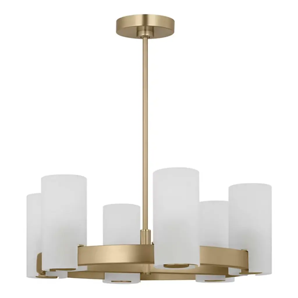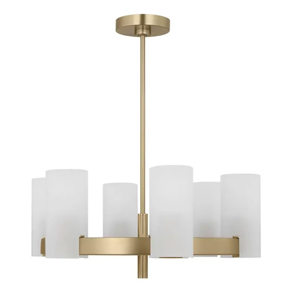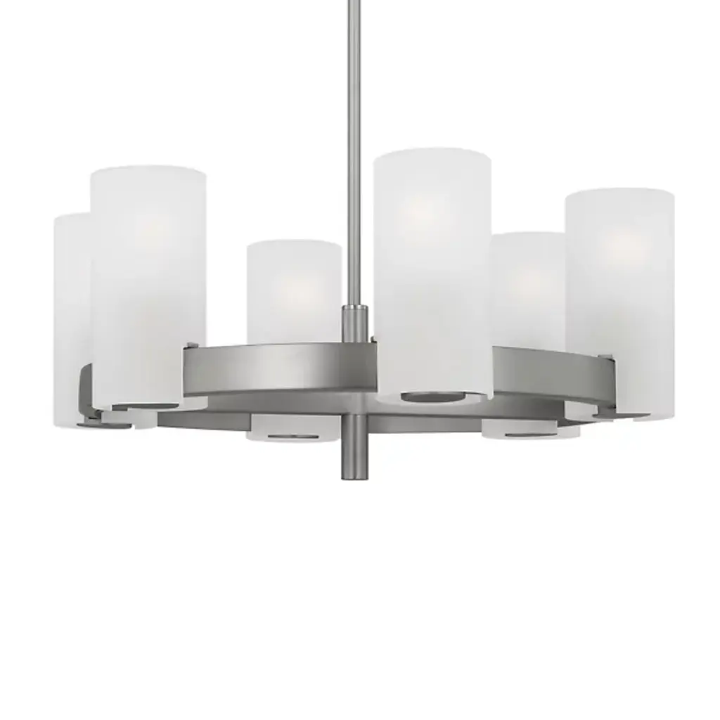 The Rhode Chandelier from Visual Comfort Studio is an exquisite lighting solution designed by Drew & Jonathan Scott. This chandelier is composed of sturdy steel complemented by gorgeous etched glass shades. These shades are illuminated with an LED glow that brings brilliance to your dining areas, living rooms, and more. Its simple shapes give your home décor a clean and streamlined presentation. Rhode is secured overhead by a ceiling canopy.