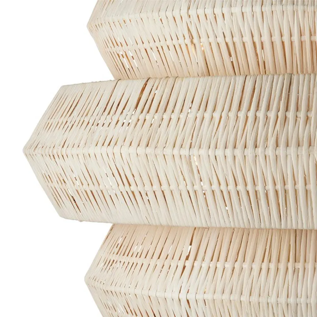 A perfect fixture for coastal and modern spaces alike, the medium Rica chandelier highlights the beauty of organic materials. Bleached natural rattan is expertly woven around the white wrought-iron frame. Light glows from within the three-tiered geometric design.