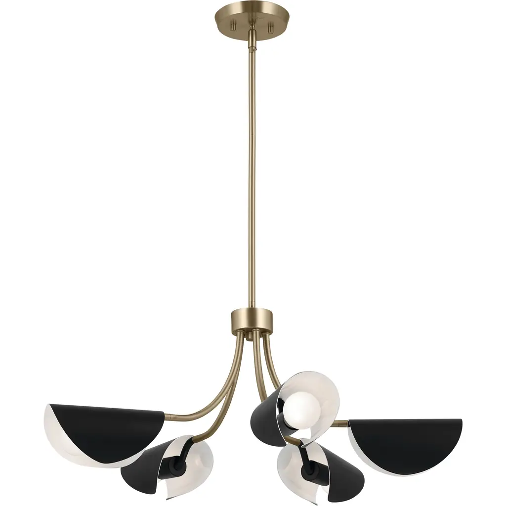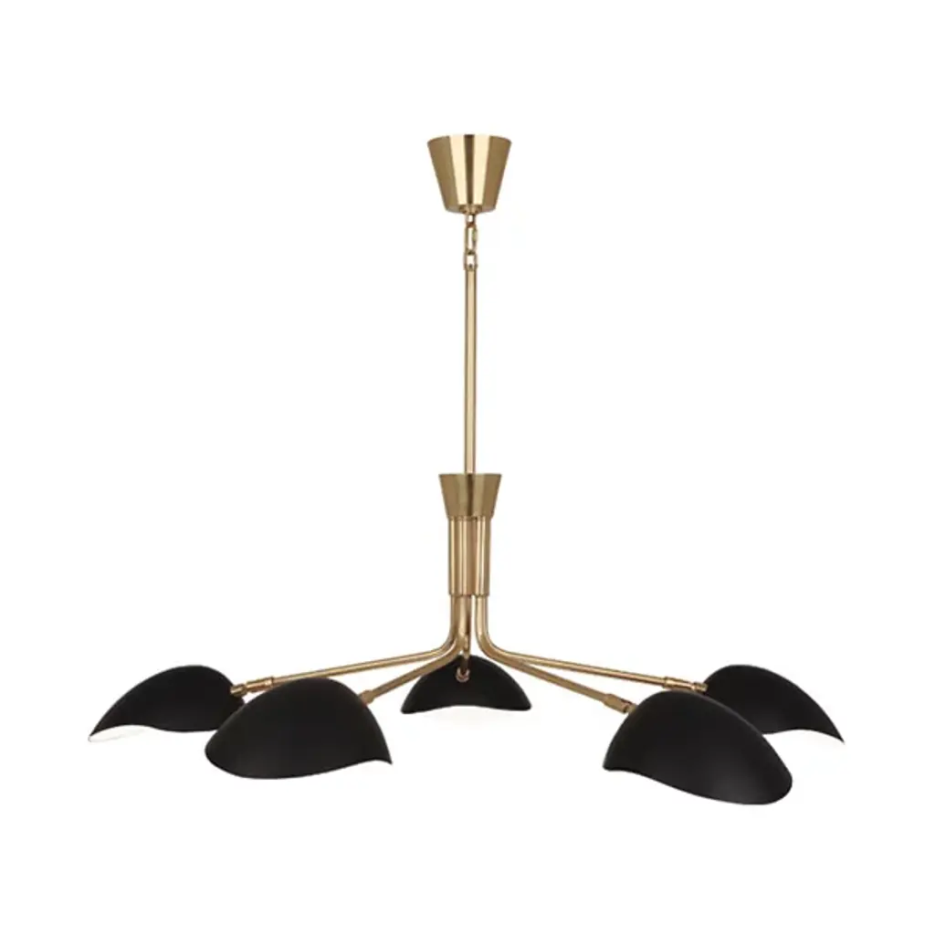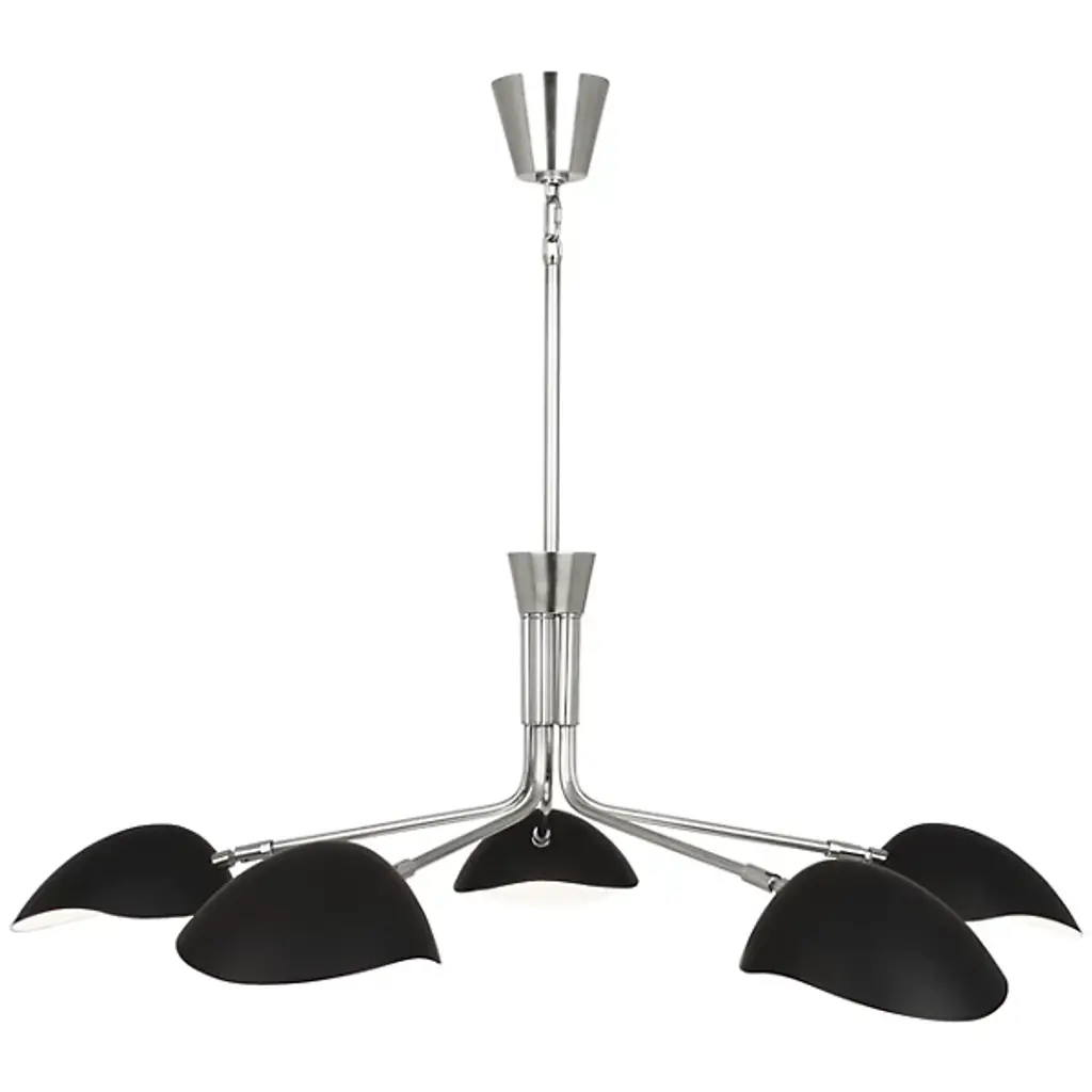 The Robert Abbey Rico Espinet Racer Chandelier is a streamlined and trendy interpretation to the traditional chandelier shape. Thin rods host shades with a uniquely dynamic shape, reminiscent of a biker's helmet. The shades are adjustable, experiment with different angles to find the best lighting for your space.