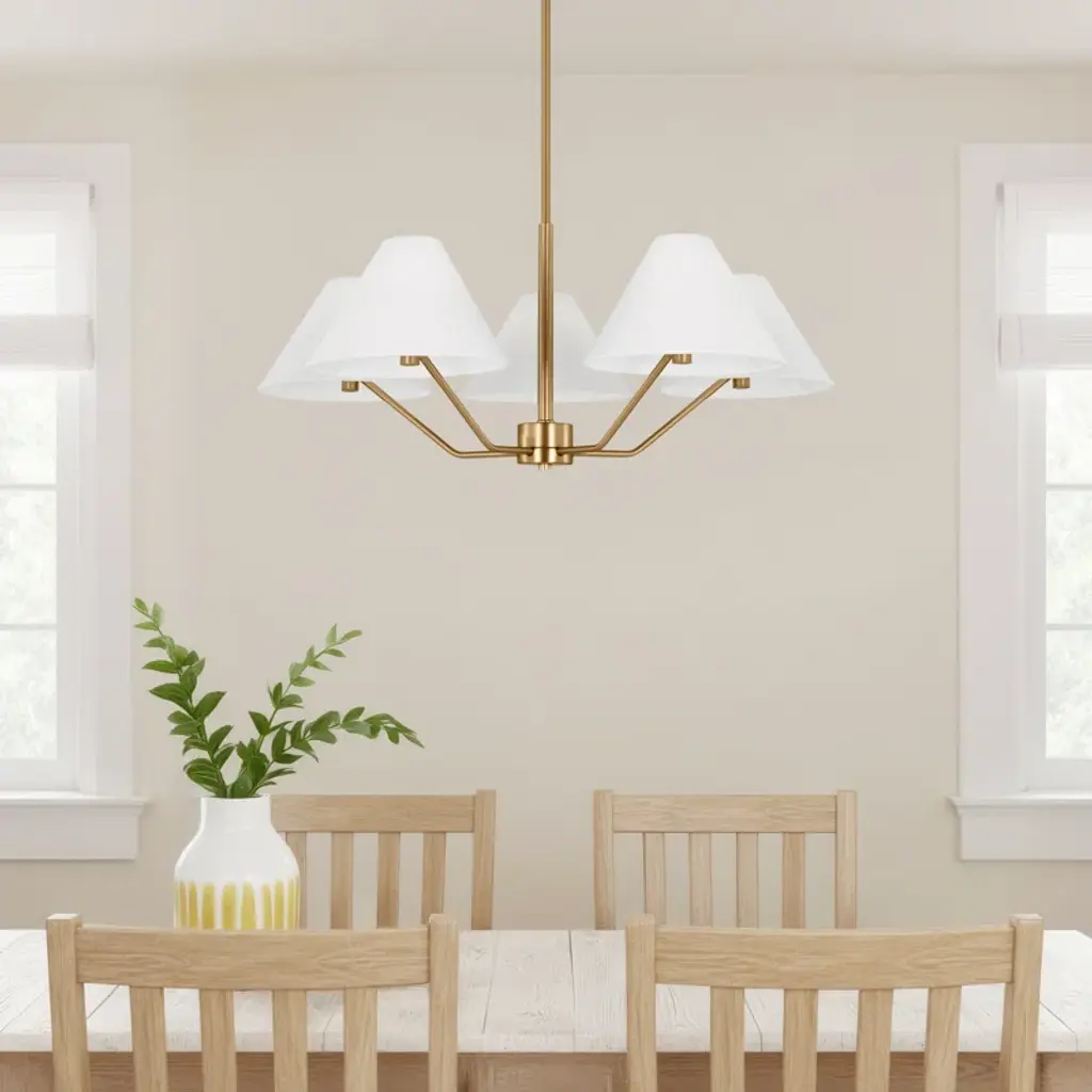 Designed by Drew & Jonathan Scott, the Riesel series is a contemporary interpretation of a classic mid-century style. The bent arm and concealed socket highlight the minimalist aesthetic allowing this to be placed in a variety of spaces. A cone-shaped white fabric shade tops the bulb exuding a soft, ambient glow that is perfect for kitchens, dining rooms, or living rooms.