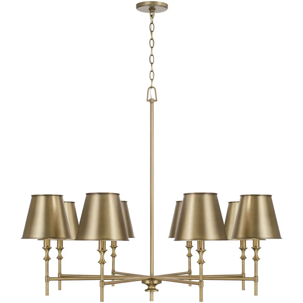 The contrast of warm wood and cool metal adds to the glamour of this sleek four-arm chandelier. The metal-trimmed linen shades are the ideal finishing touch.