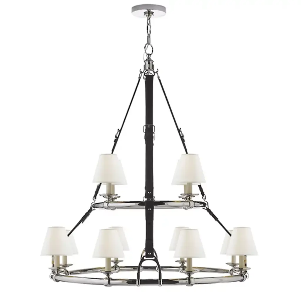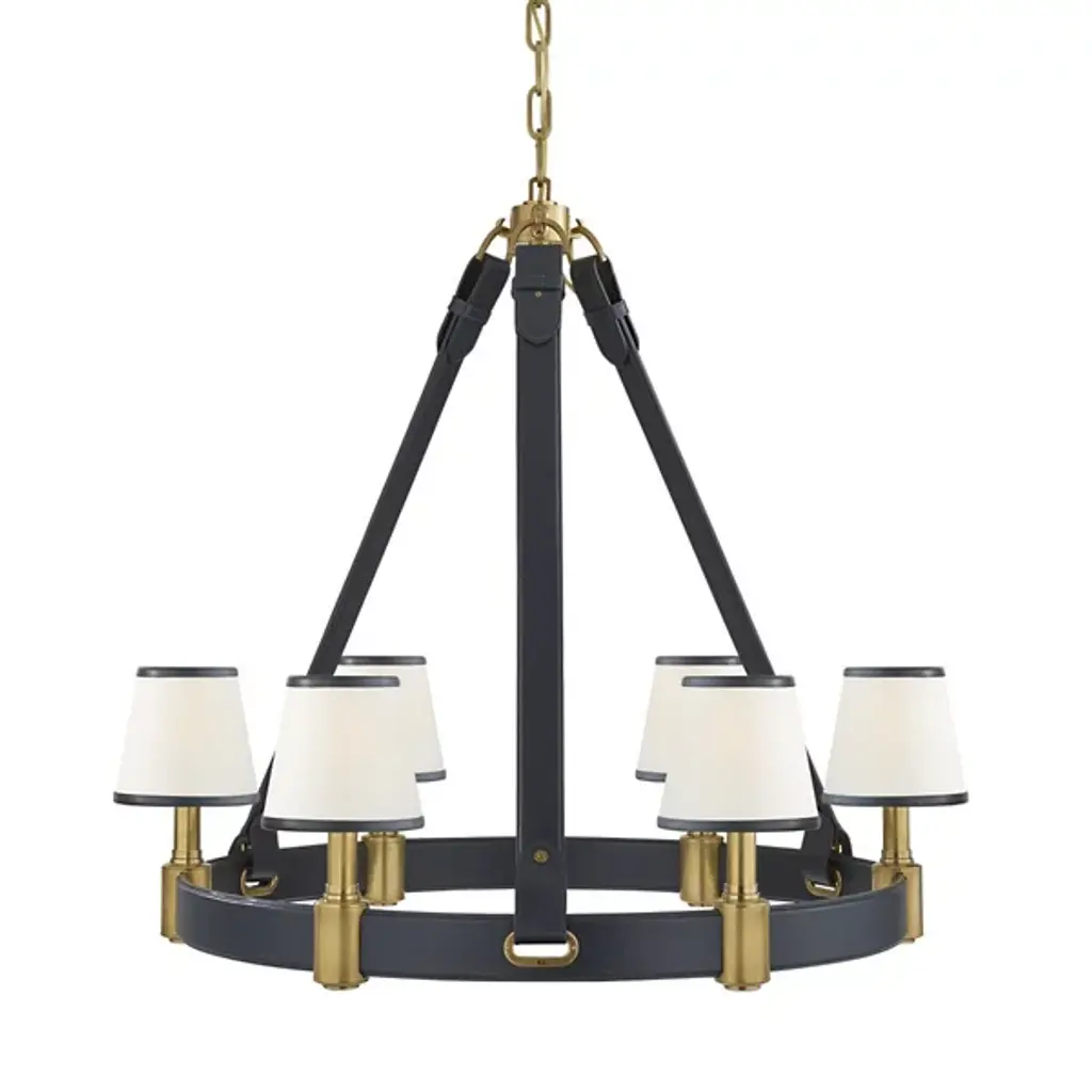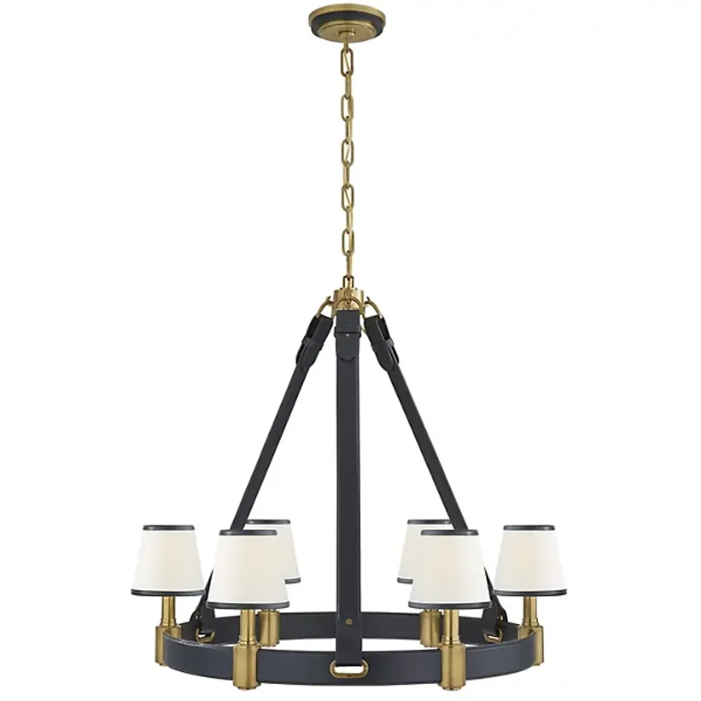 Cool, handsome, and refreshingly modern. Designer Ralph Lauren’s stamp on the Riley Chandelier from Visual Comfort Signature, formerly known as Visual Comfort, is as clear as day. His signature clean aesthetic and everyday sophistication highlight this sharp design. Showing off the same elegance and craftsmanship of a Ralph Lauren handbag, fine leather straps beautifully hold up a ring frame also wrapped in classy leather. Lamp holders circling the structure create contrasting pops of metal. Its linen and leather shades elegantly silhouette an inviting, warmth-filled glow.
