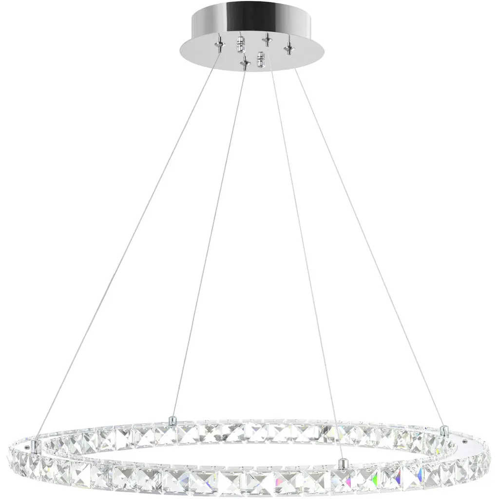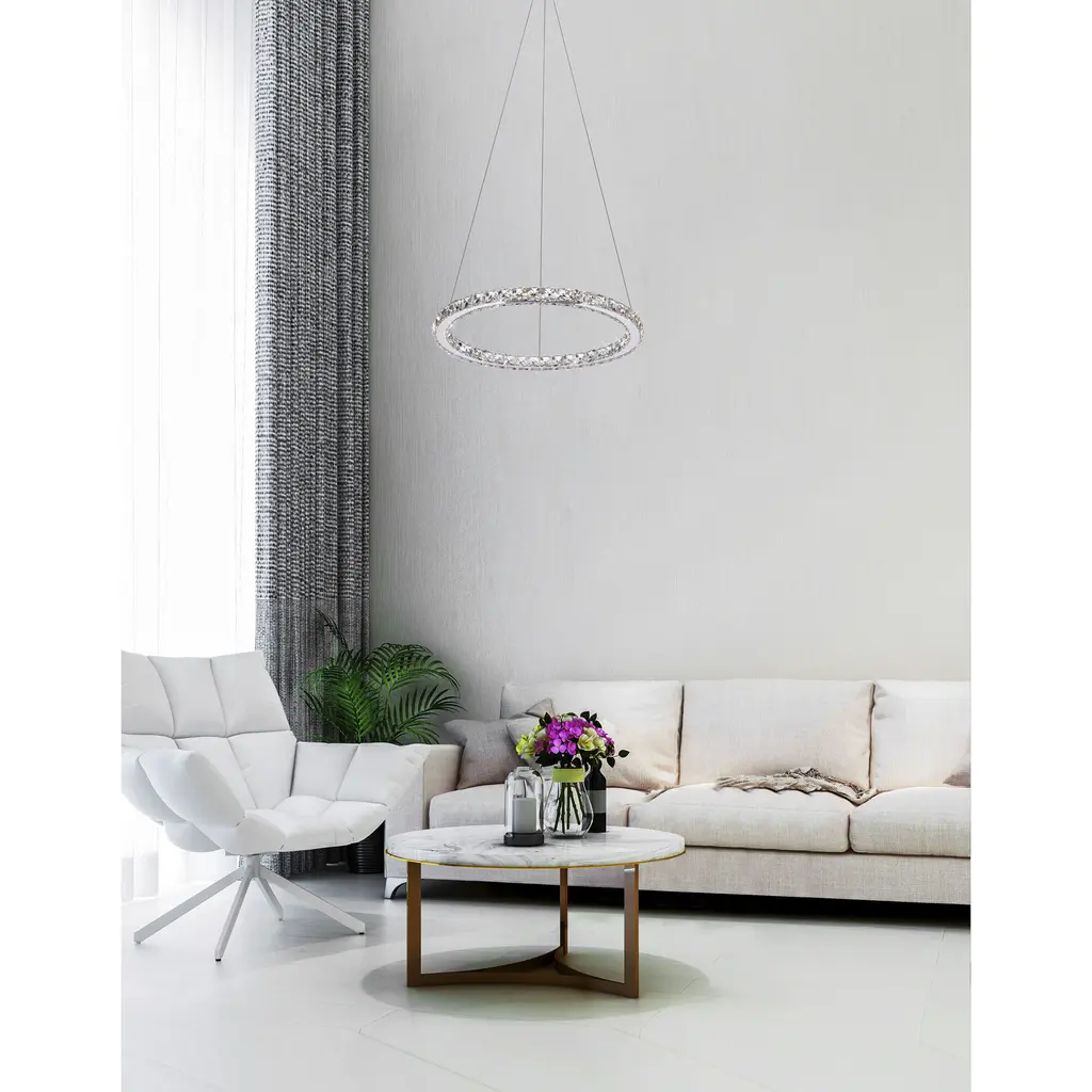 Add a touch of modern elegance to your space with this 20-inch LED chandelier, featuring a single adjustable halo ring for a clean and stylish look. Adorned with shimmering crystal accents, it provides both striking visual appeal and a luxurious feel. The built-in LED lights deliver bright, energy-efficient illumination, while the sleek design offers a bold yet refined presence. Ideal for dining rooms, living rooms, bedrooms, or entryways, this chandelier perfectly blends style and function.