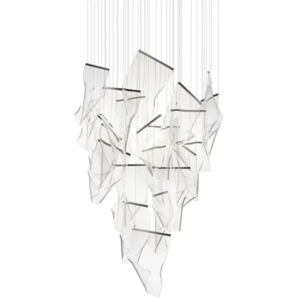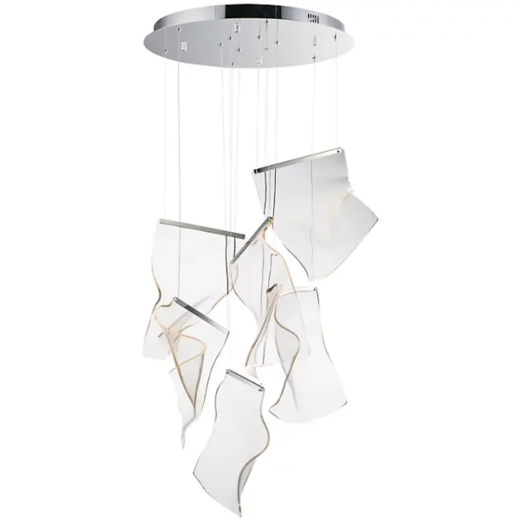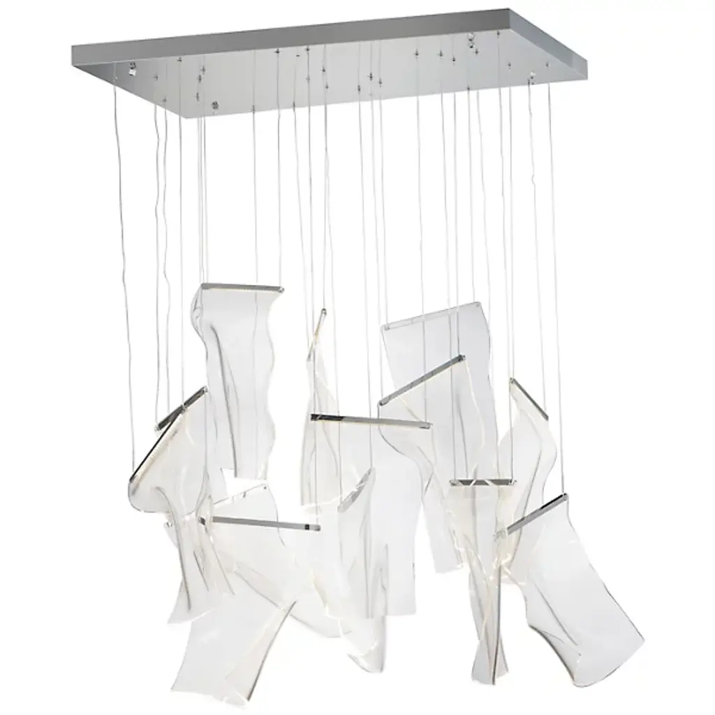 An airy arrangement of abstract forms, the Rinkle LED Chandelier from ET2 Lighting features transparent acrylic sheets shaped by hand. The light-guided acrylic captures the glow of energy-efficient LEDs recessed within strips of shining stainless steel, obscuring the illumination source. Delicately suspended by a series of thin wires, the pendants appear to be floating in an adjustable configuration of weightless light sculpture. Its unique design adds an artistic statement to various interiors with complimentary finishes.
