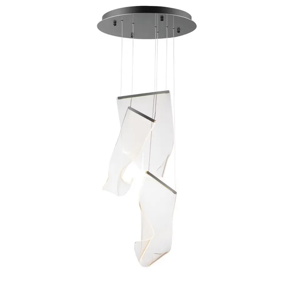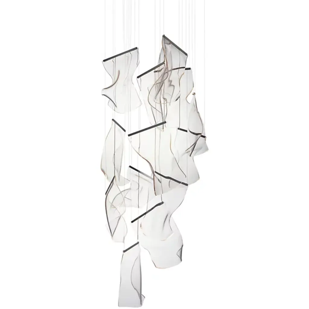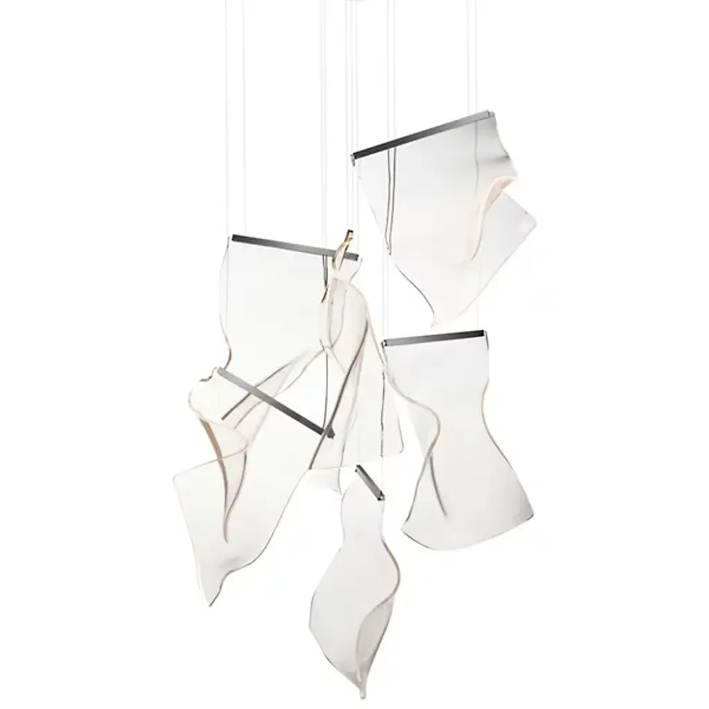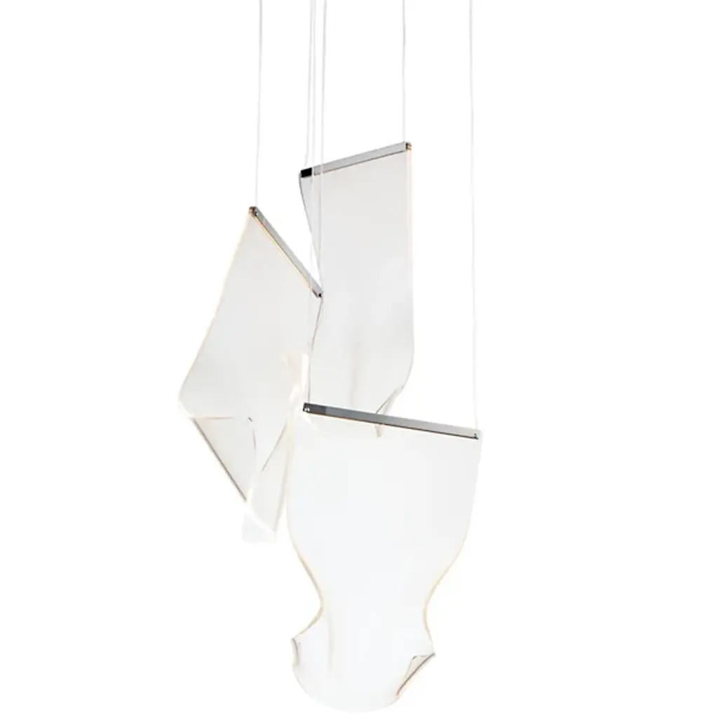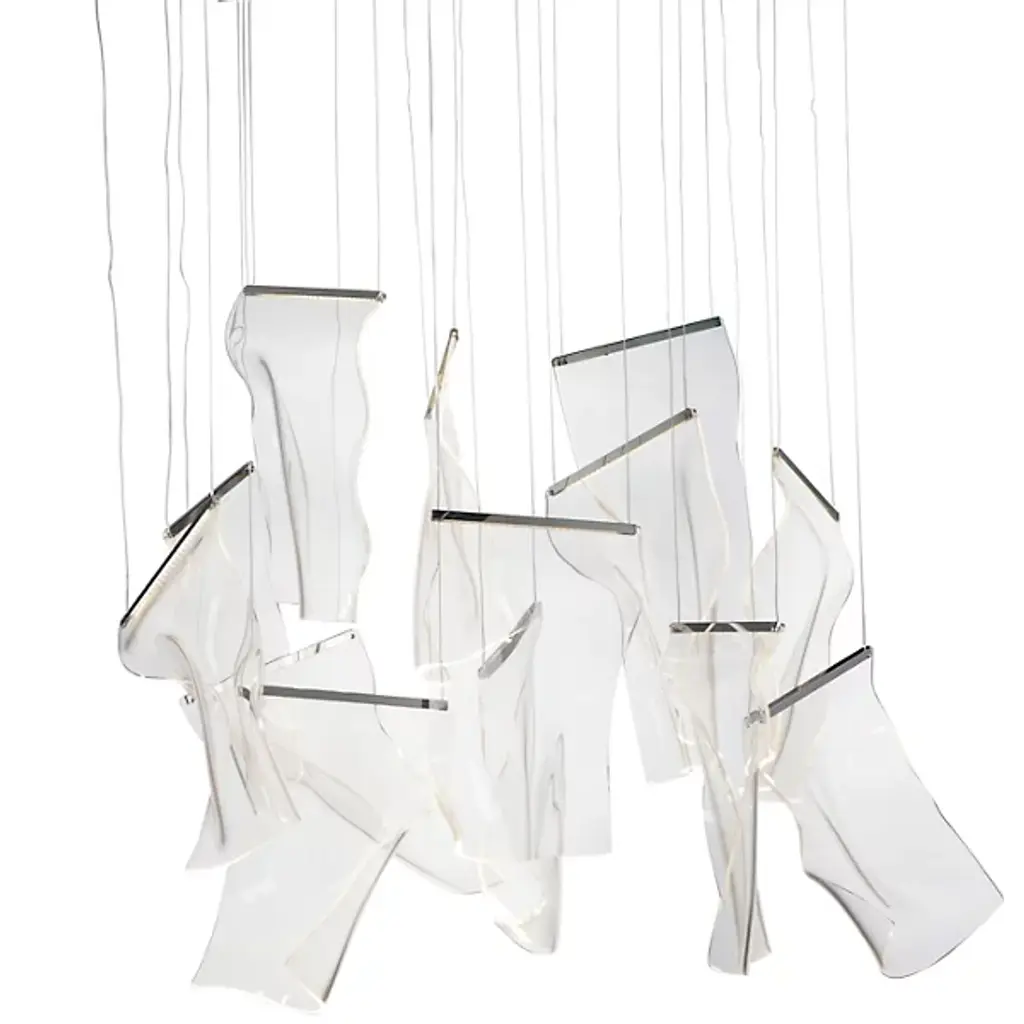 An airy arrangement of abstract forms, the Rinkle LED Chandelier from ET2 Lighting features transparent acrylic sheets shaped by hand. The light-guided acrylic captures the glow of energy-efficient LEDs recessed within strips of shining stainless steel, obscuring the illumination source. Delicately suspended by a series of thin wires, the pendants appear to be floating in an adjustable configuration of weightless light sculpture. Its unique design adds an artistic statement to various interiors with complimentary finishes.