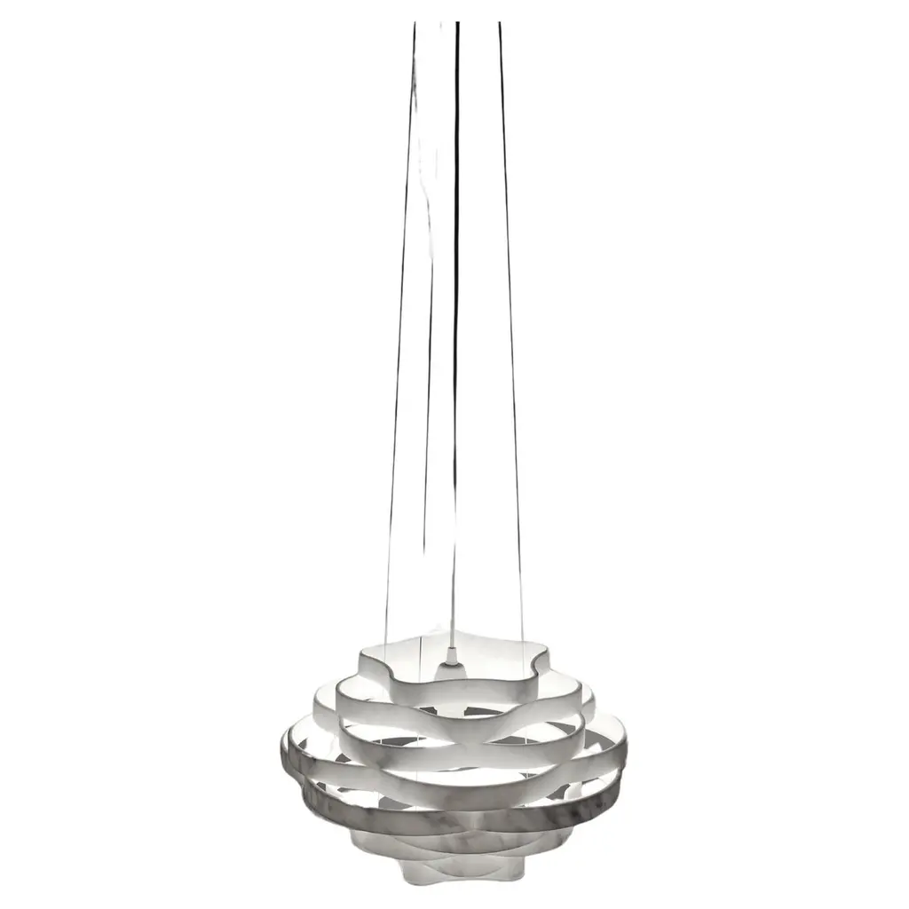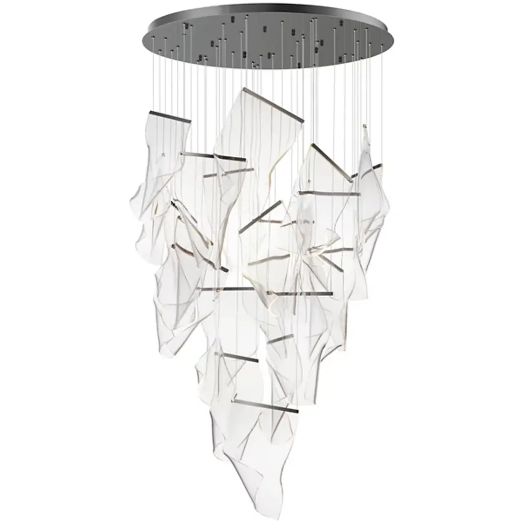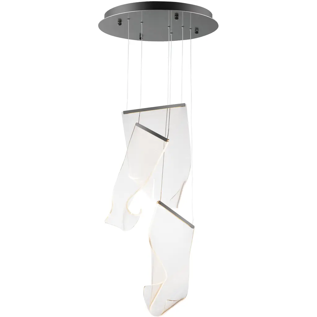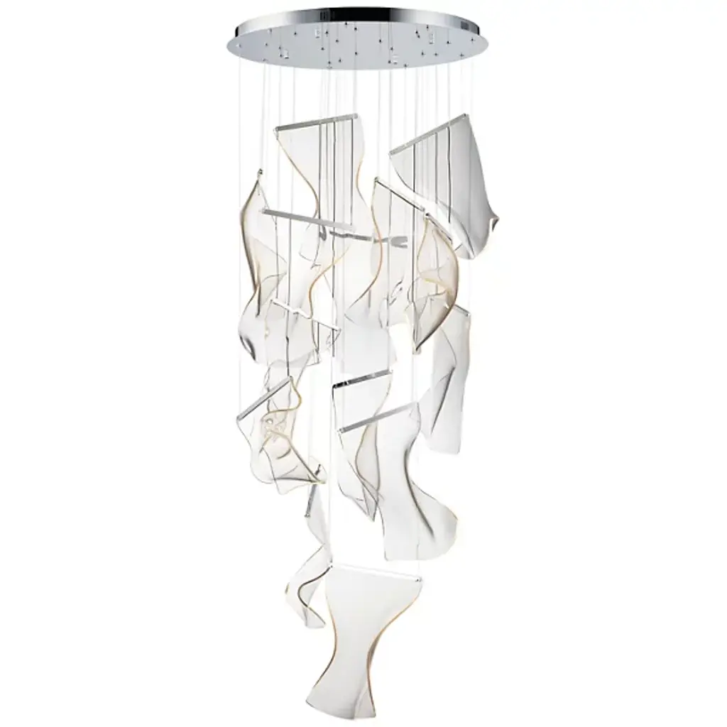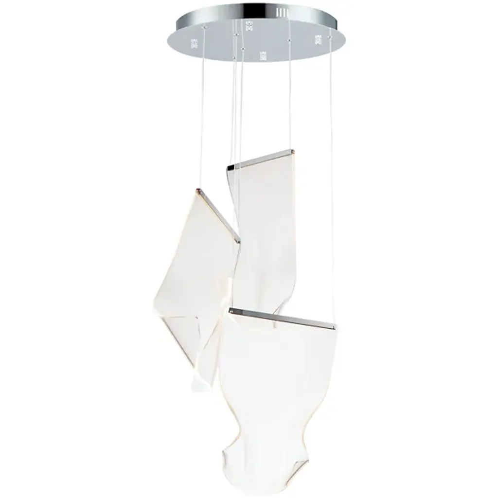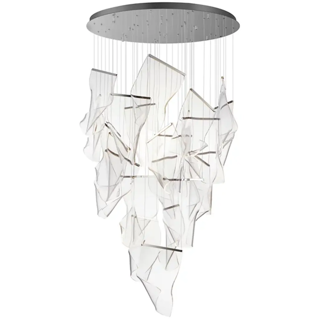 An airy arrangement of abstract forms, the Rinkle LED Chandelier from ET2 Lighting features transparent acrylic sheets shaped by hand. The light-guided acrylic captures the glow of energy-efficient LEDs recessed within strips of shining stainless steel, obscuring the illumination source. Delicately suspended by a series of thin wires, the pendants appear to be floating in an adjustable configuration of weightless light sculpture. Its unique design adds an artistic statement to various interiors with complimentary finishes.