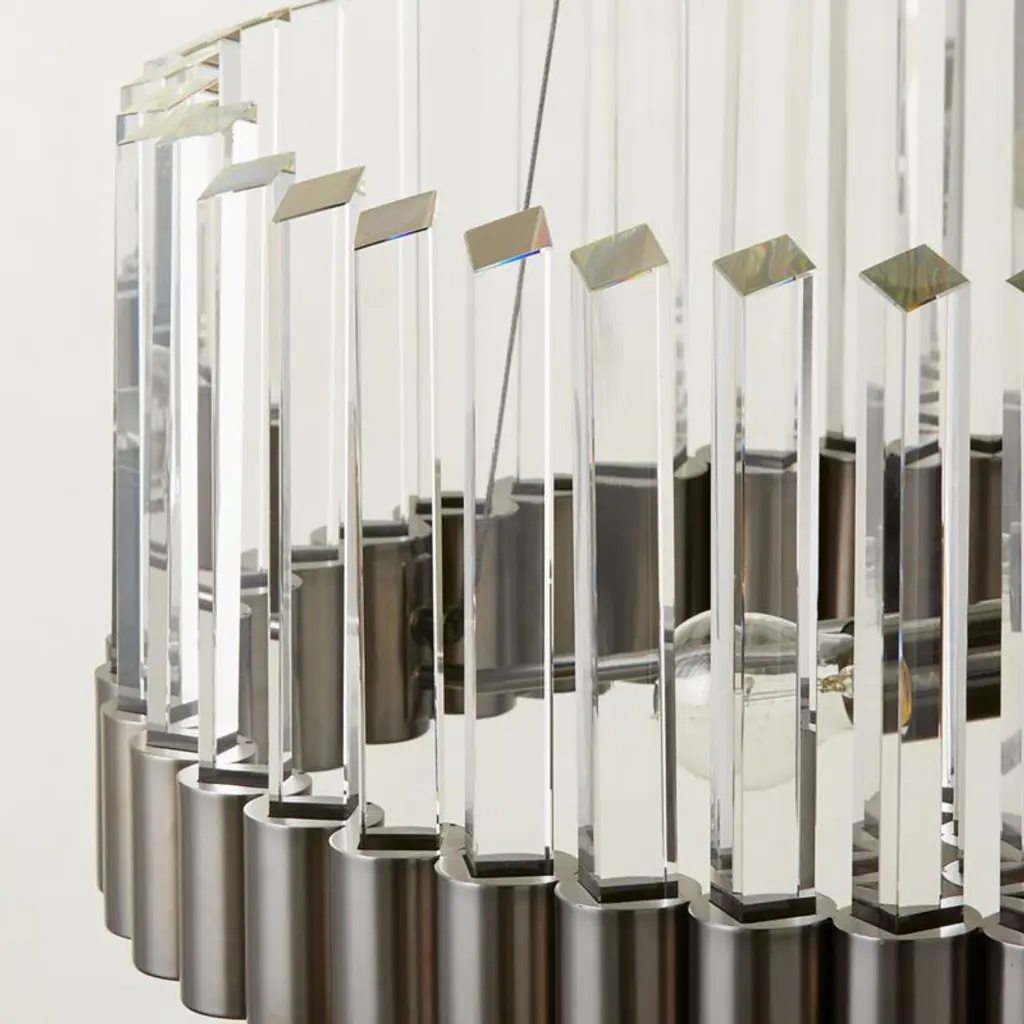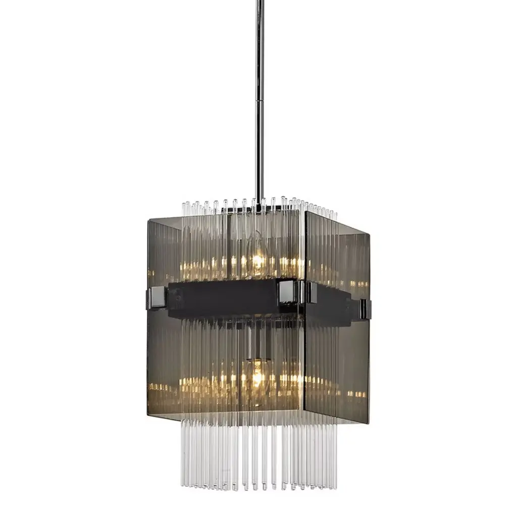 Designed by Chicago-based designer Donna Piacenza, dramatic chandelier evokes the boldness of classic art deco designs. Sophisticated black chrome tubes wrap around 45 square-faceted crystals that reflect the interior light, casting a warm, inviting glow from above. CB2 exclusive.