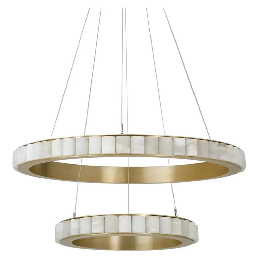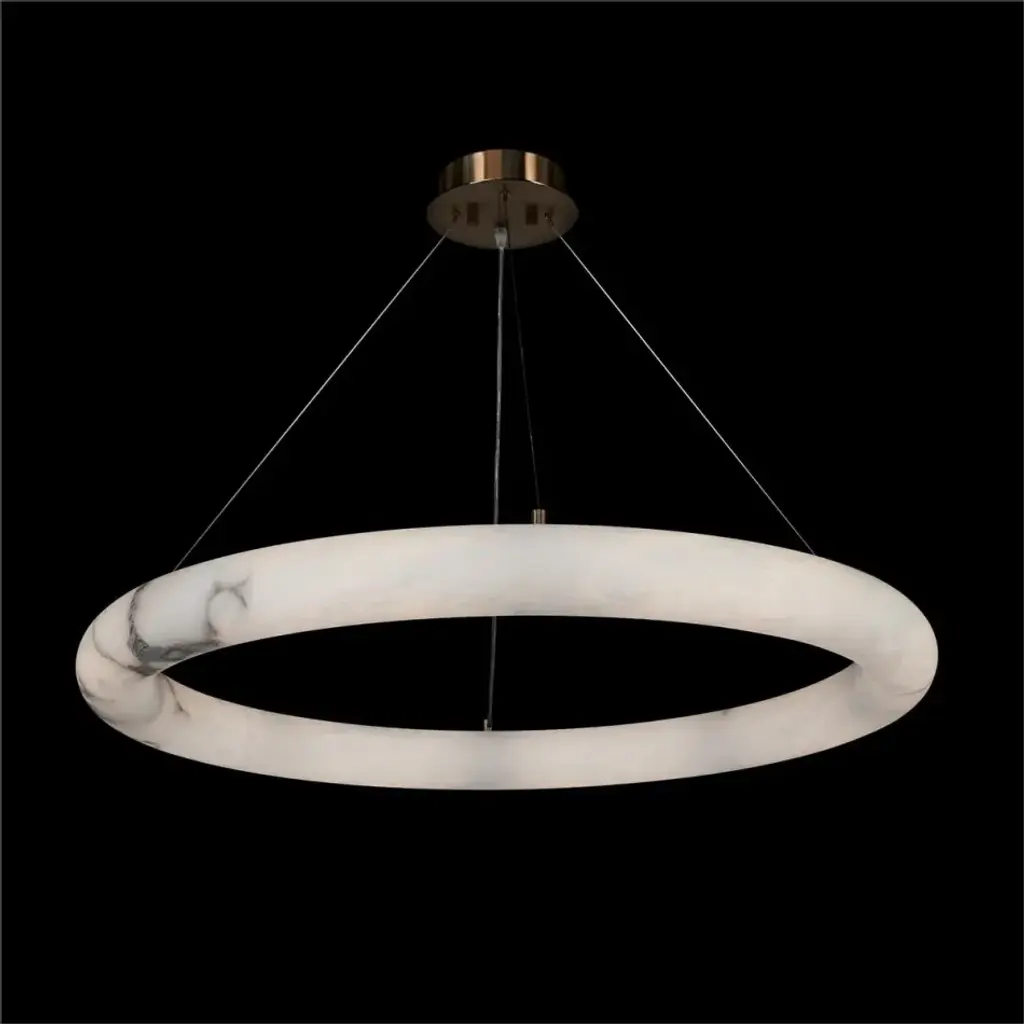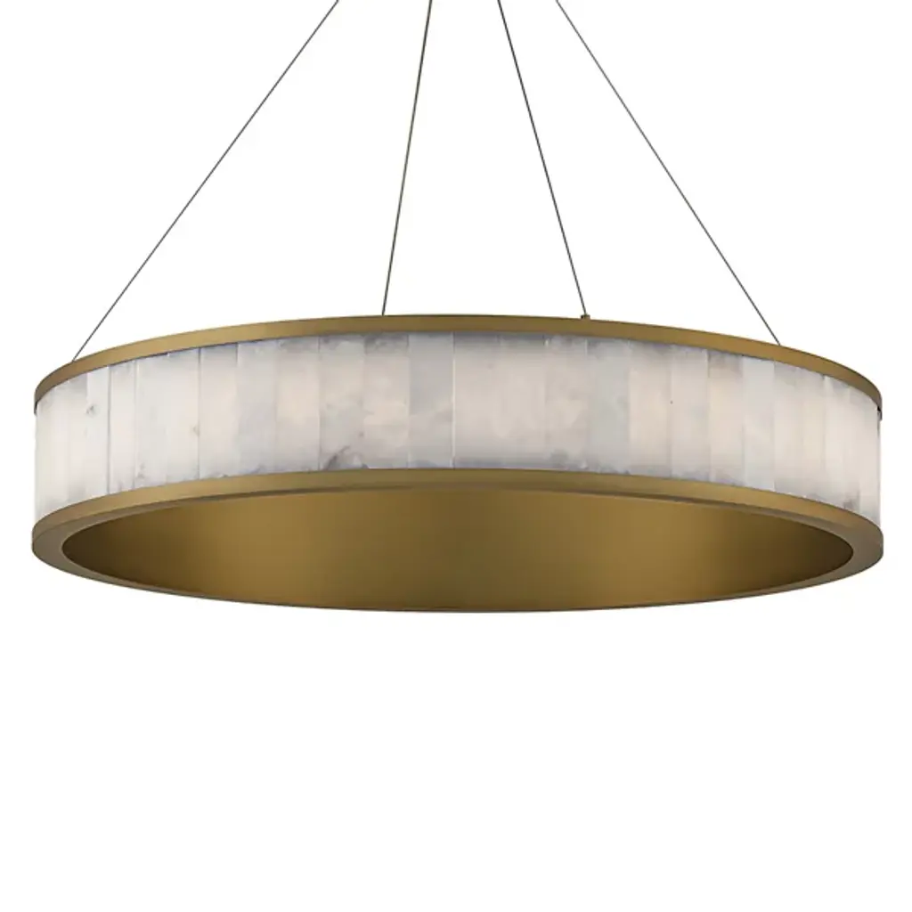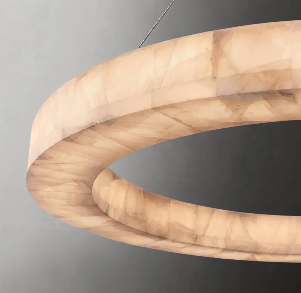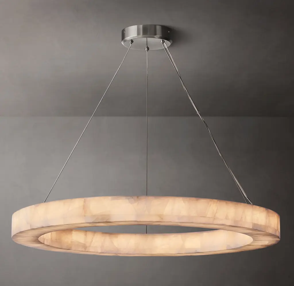 Minimalist in form, dramatic in effect, our Rivage chandelier by Timothy Oulton celebrates the beauty of calcite, a translucent stone with a warm, natural glow. Suspended from slender steel cables, a halo of polished stone is expertly pieced to create a smooth, continuous surface, while subtle illumination from within highlights the organic coloration and veining. Each fixture is a one-of-a-kind statement. SHOP THE ENTIRE COLLECTION