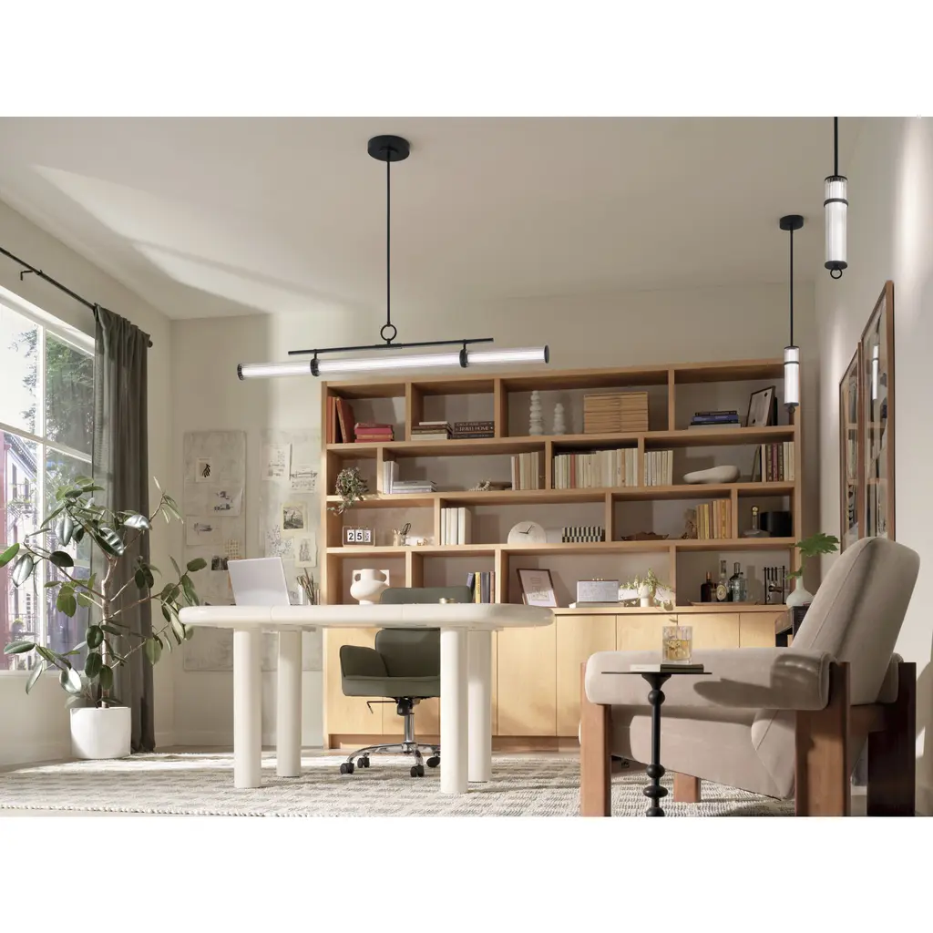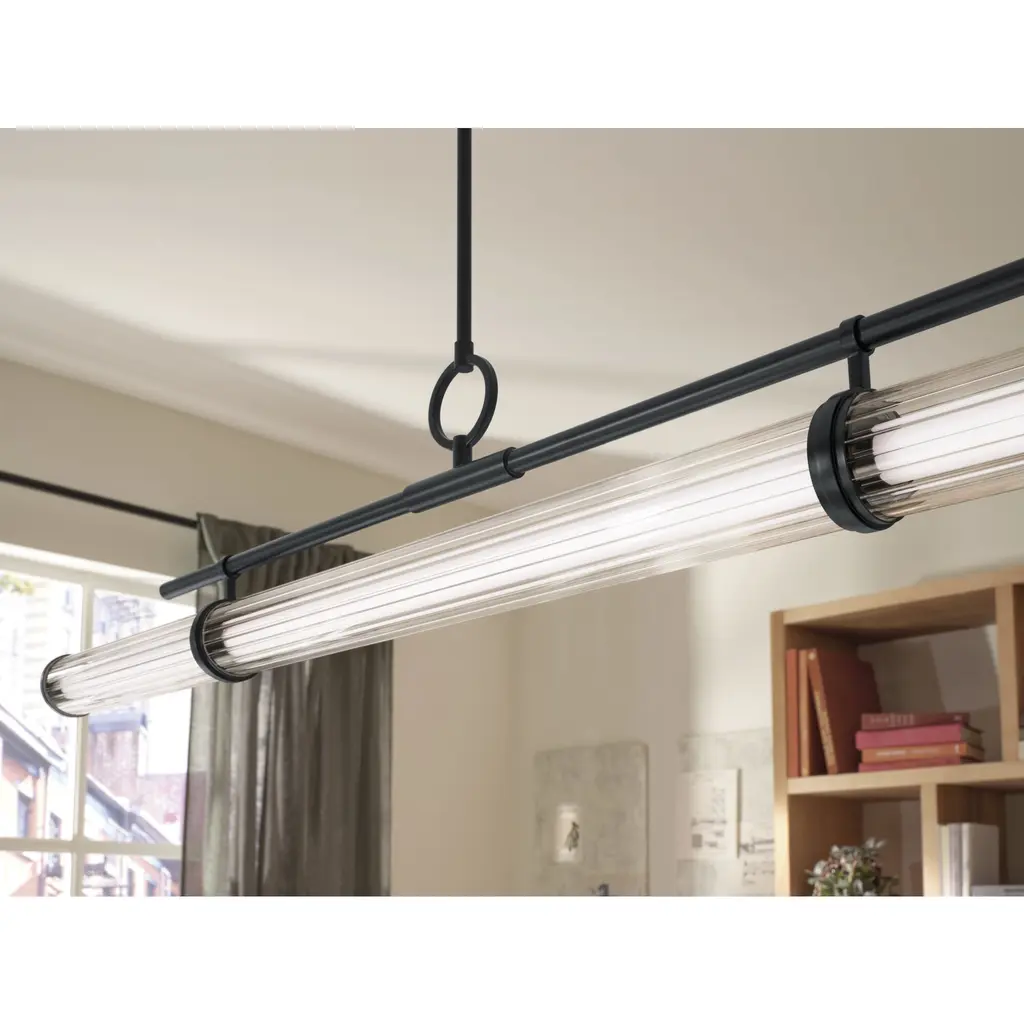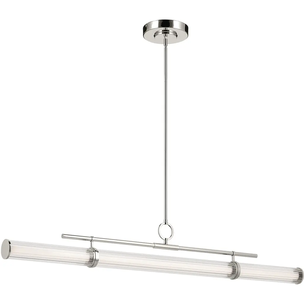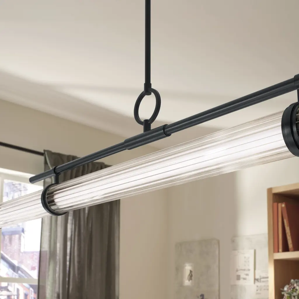 The Riven linear chandelier strikes the perfect balance between simplicity and sophistication. Inspired by a vintage map bag, it looks like it could be strapped to the back of an old-world explorer. Clear fluted glass surrounds a white acrylic interior, softening the integrated LED light source. This energy-efficient light is as versatile as it is refined.