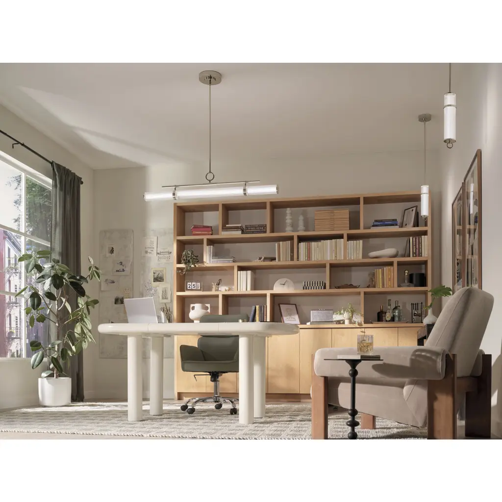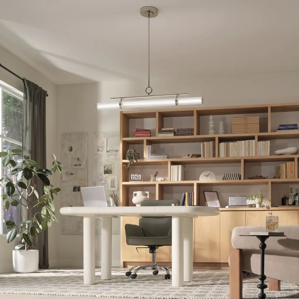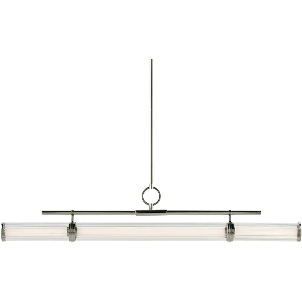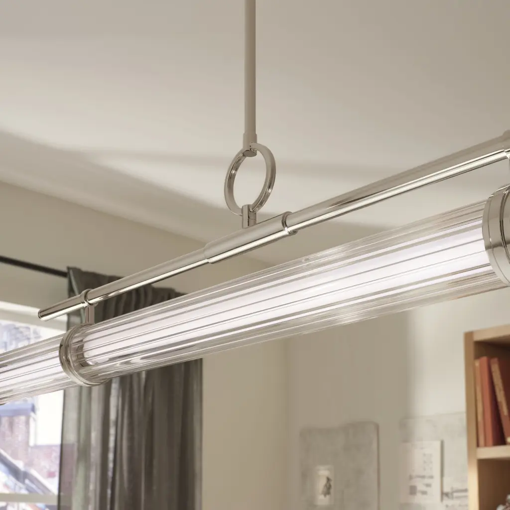 The Riven linear chandelier strikes the perfect balance between simplicity and sophistication. Inspired by a vintage map bag, it looks like it could be strapped to the back of an old-world explorer. Clear fluted glass surrounds a white acrylic interior, softening the integrated LED light source. This energy-efficient light is as versatile as it is refined.