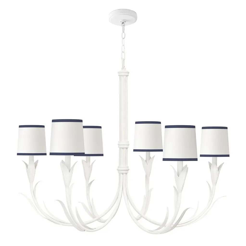 With its botanical influence, the River Reed Chandelier is the ideal fixture for any traditional living space. Six reeded arms reach upward toward shades, joined in the middle of the fixture with two detailed bands. This six-light fixture is suspended on an elegant chain, adorning a room with organic, natural glamour.