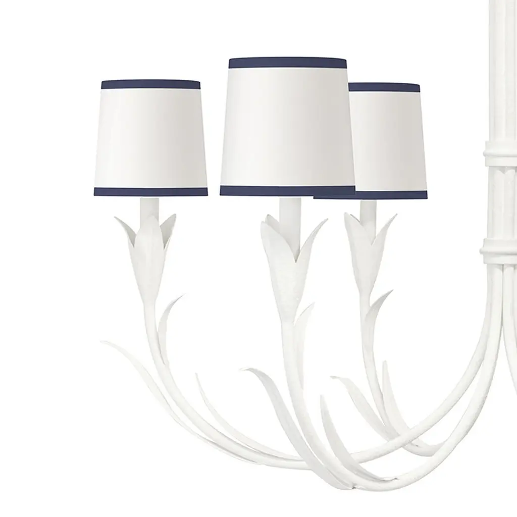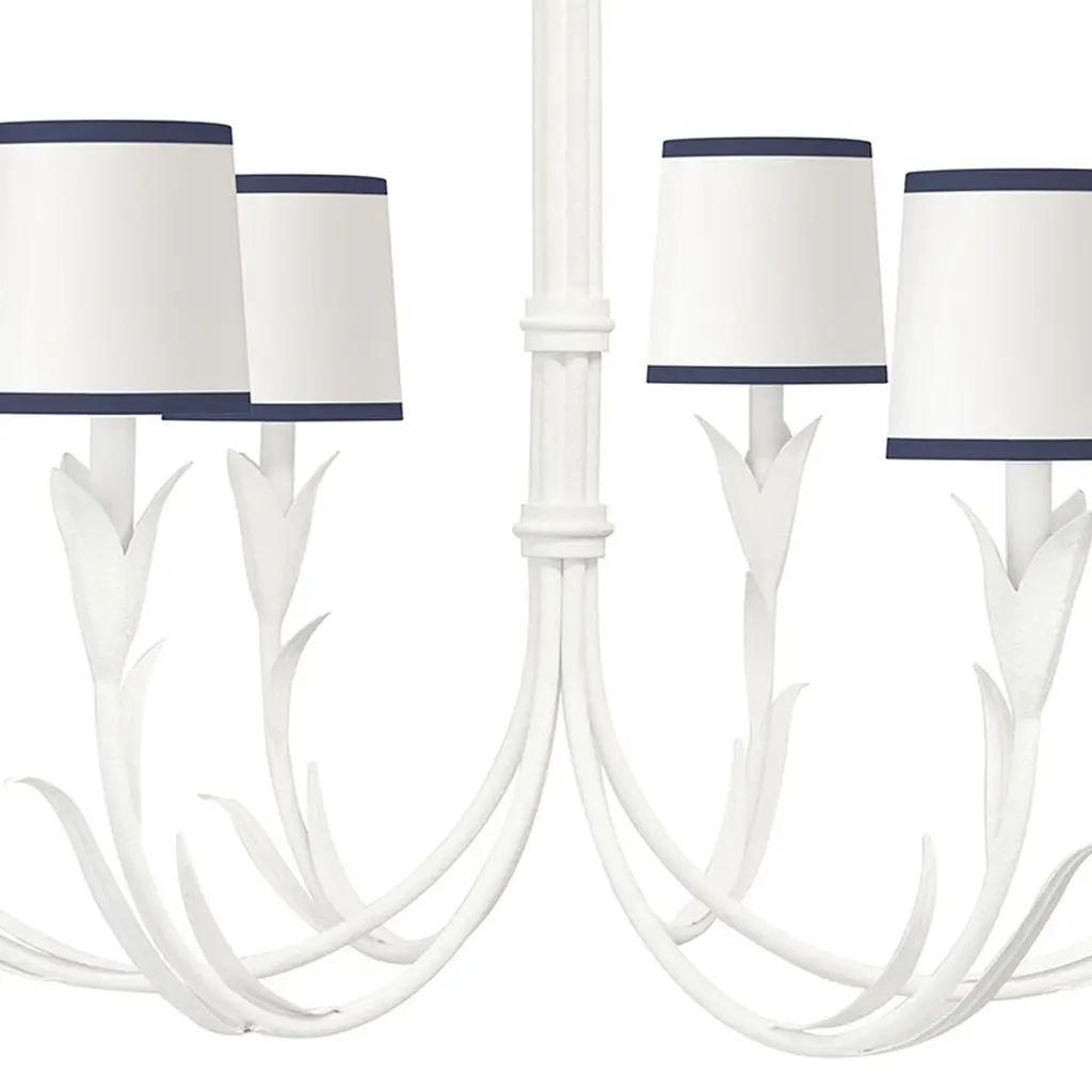 With its botanical influence and beautiful finish, the River Reed Chandelier is the ideal fixture for any traditional living space. Six reeded arms reach upward toward delicate natural linen shades, joined in the middle of the fixture with two detailed bands. This six-light fixture is suspended on an elegant chain, adorning a room with organic, natural glamour.