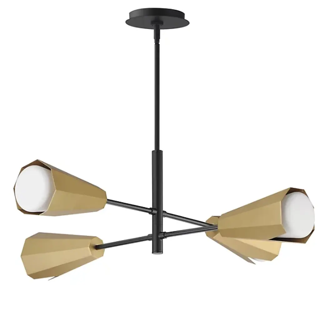 The Rizzo Chandelier by Maxim Lighting infuses interiors with bold style and contemporary sophistication. Featuring a faceted metal shade in Natural Aged Brass accented with Matte Black details, it creates a striking visual contrast. A flat-bottomed Satin White glass diffuser gently softens the light, casting a warm, inviting glow. Perfect for dining rooms, kitchens, or open living spaces, this chandelier balances timeless elegance with a modern edge, enhancing a variety of interior styles with refined charm.