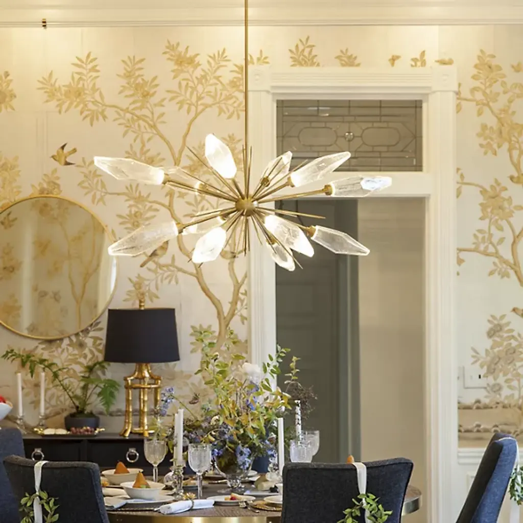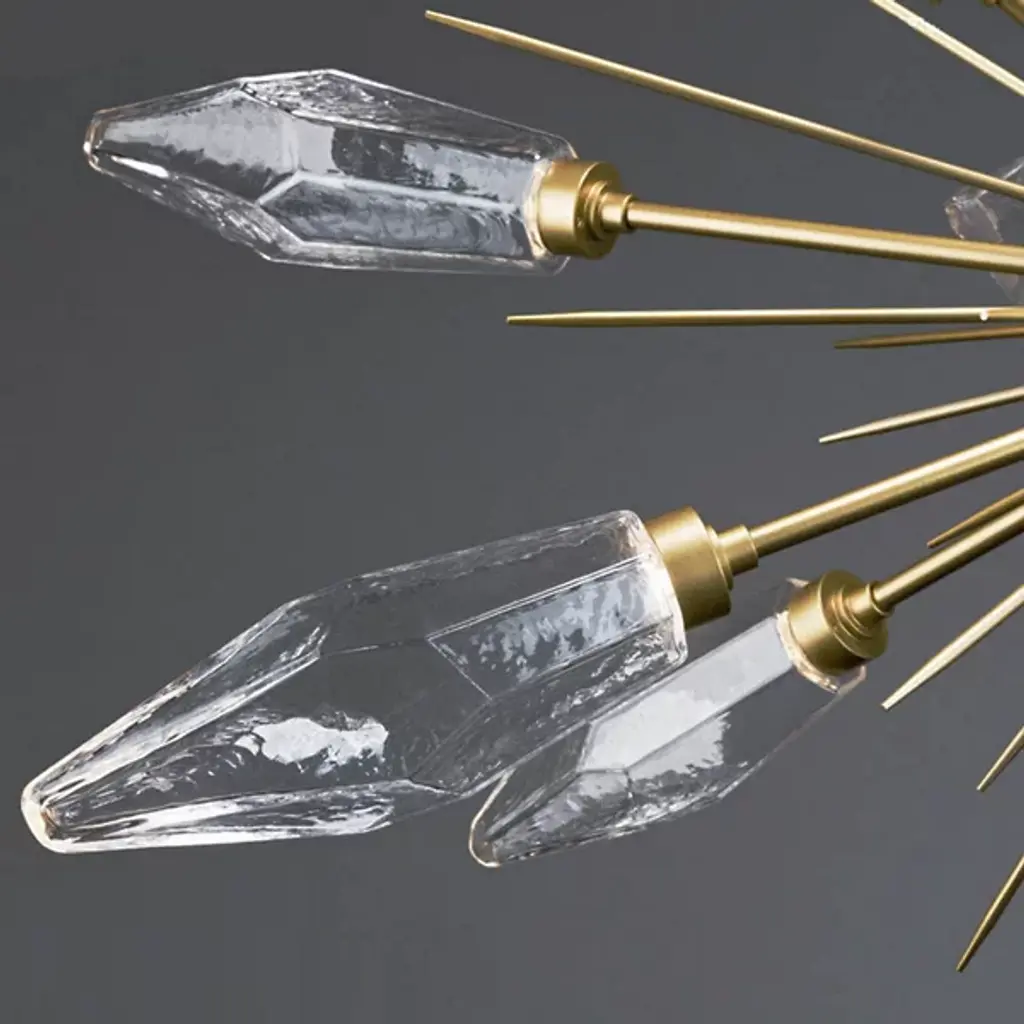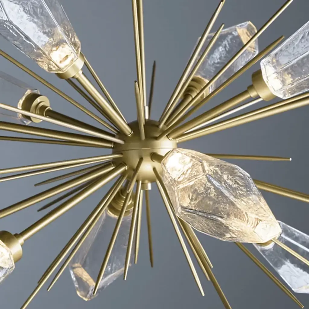 The Rock Crystal Oval Starburst LED Chandelier by Hammerton Studio is a dynamic statement piece with an Atomic Age aesthetic. Inspired by the Sputnik satellite, a central sphere in the middle features energetic spokes, some of which with hand blown glass crystals. Lit with energy efficient LEDs, the space is illuminated with a design oriented aesthetic as well as having a highlight effect on the glass.
