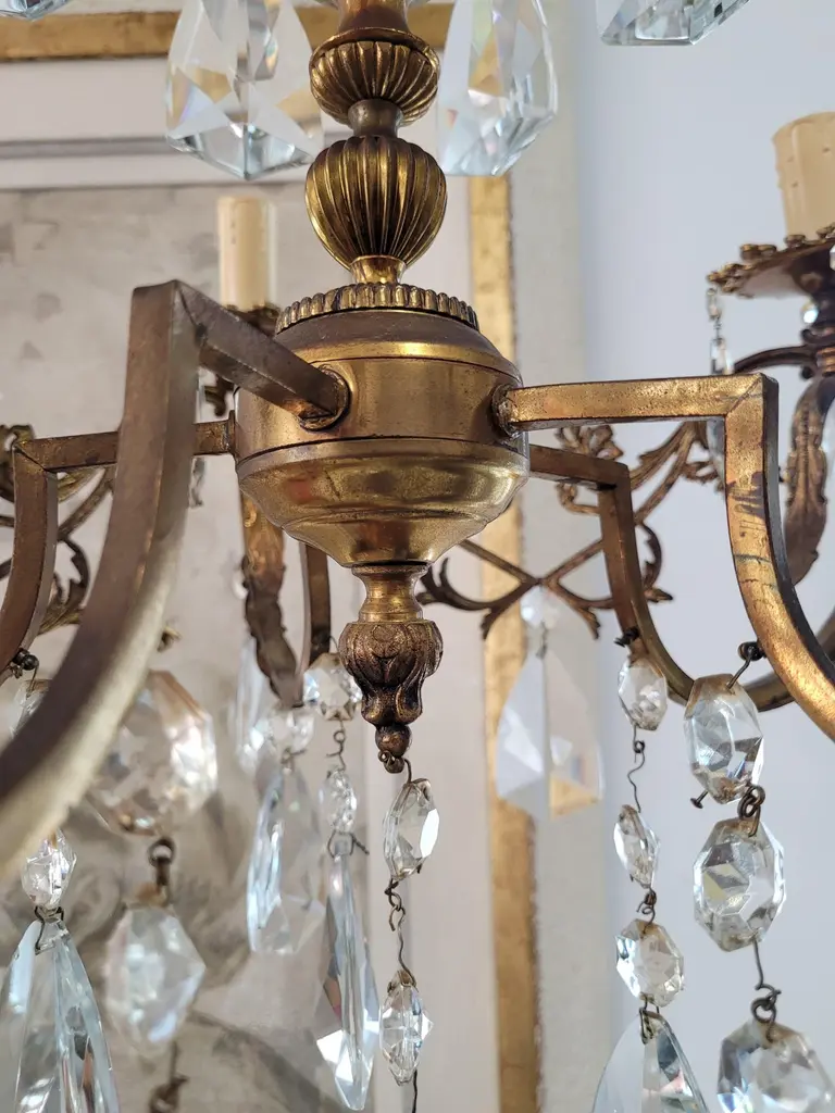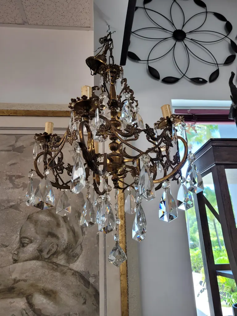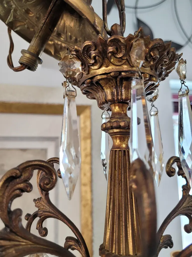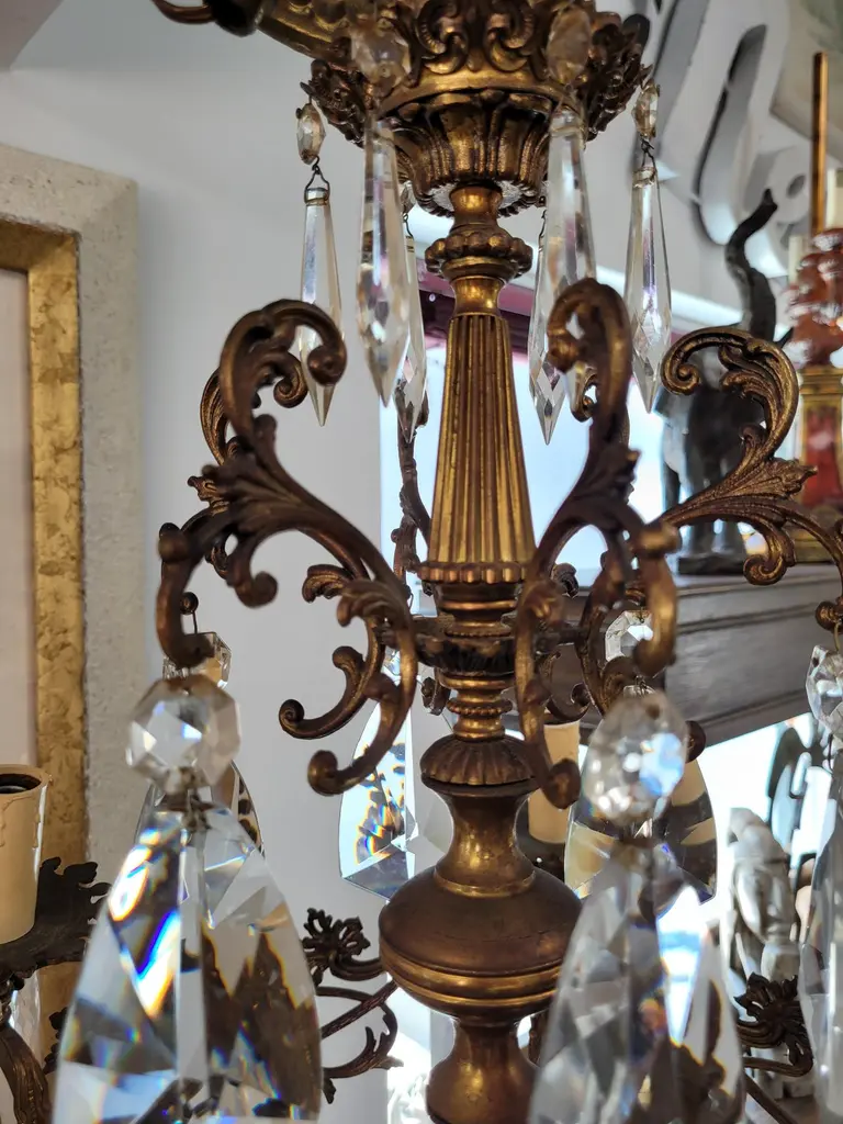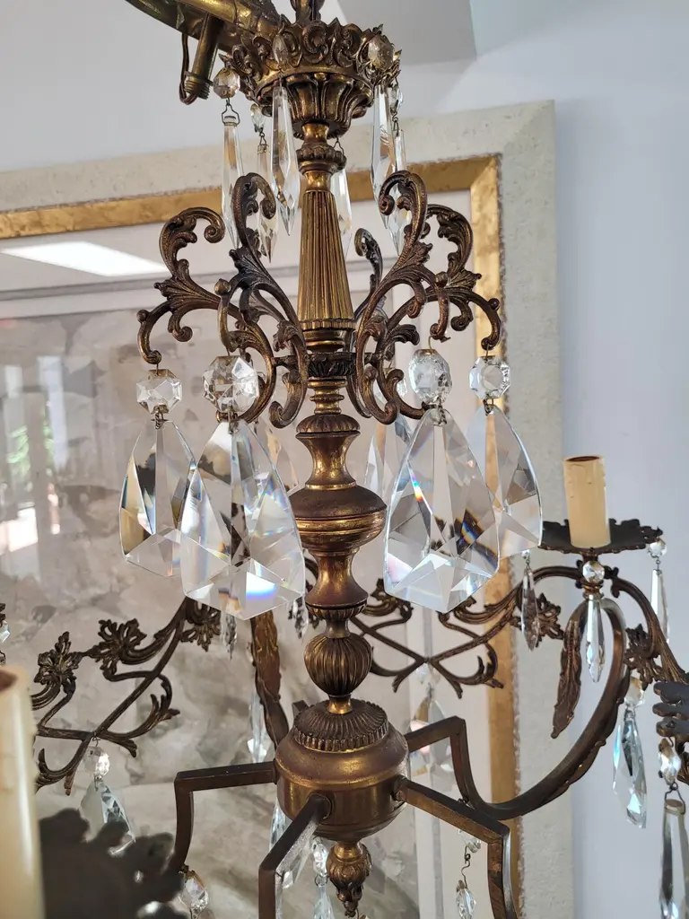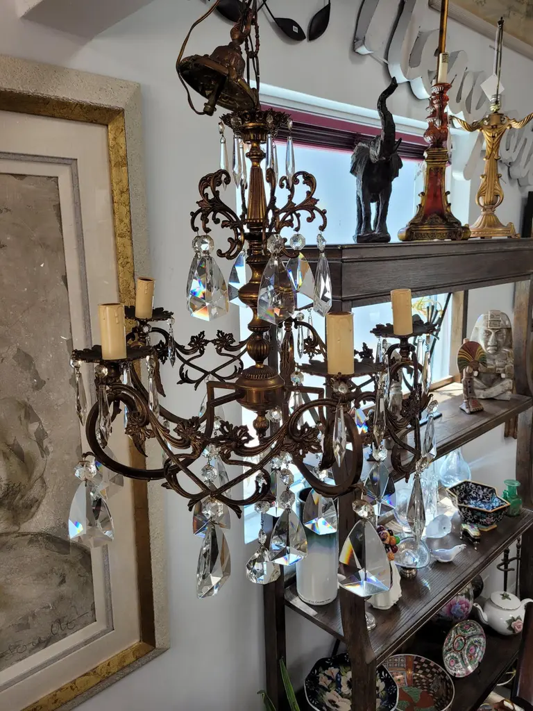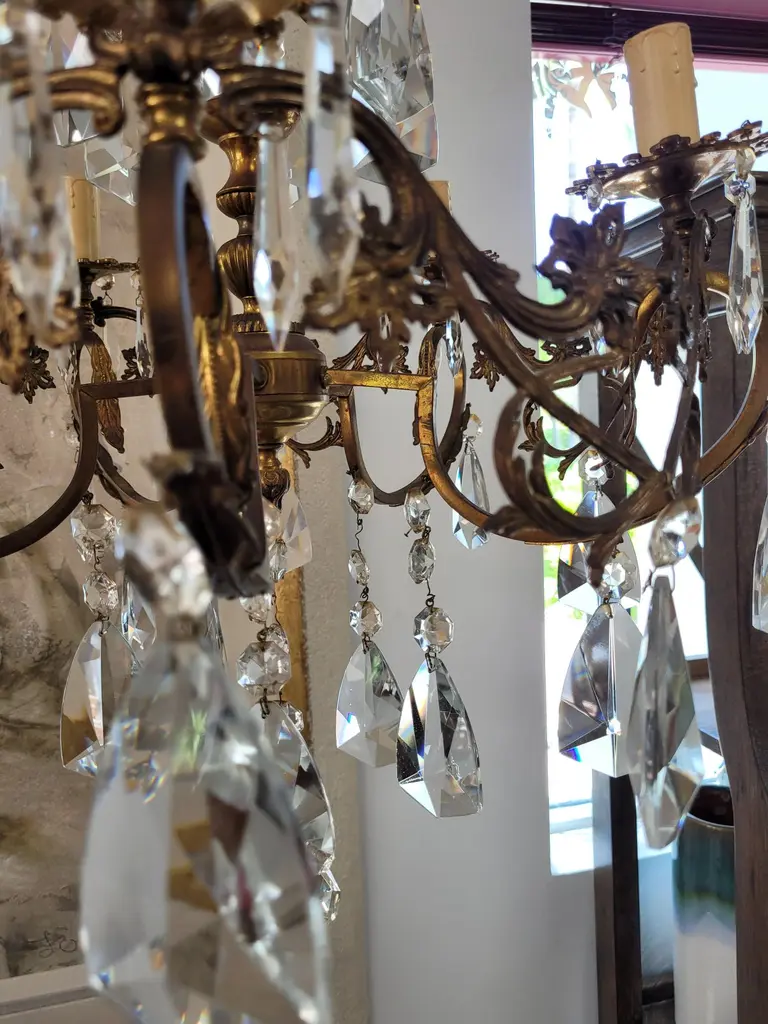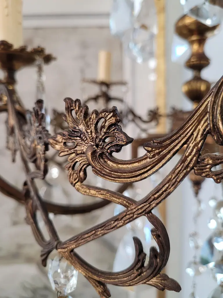 This elegant medium-sized Rococo Revival chandelier, dating to the late 19th to early 20th century, showcases the ornate charm of French-inspired design. Crafted from bronze, the frame features five scrolling arms and intricate foliate details that echo the flowing, asymmetrical lines of the Rococo style.Large, faceted lead crystal prisms and pendants adorn the chandelier, capturing and reflecting light. The organic silhouette and detailed metalwork suggest skilled craftsmanship, likely from a European or American foundry, though the piece is unsigned.A classic example of Victorian or Edwardian lighting, this chandelier makes a statement in a formal dining room, entryway, or library. Its combination of glittering crystal and time-worn metal offers both visual drama and historical character.