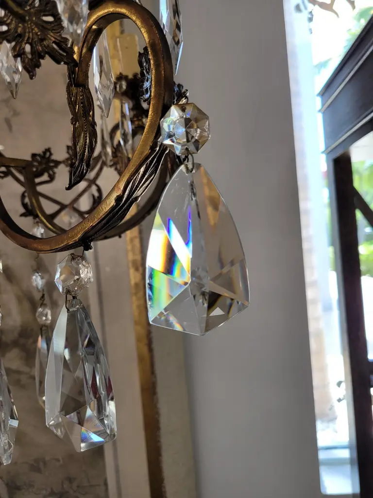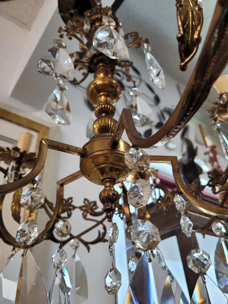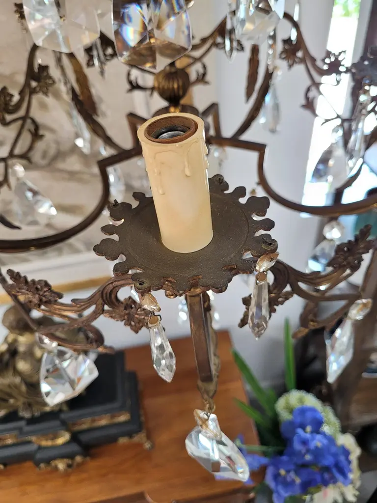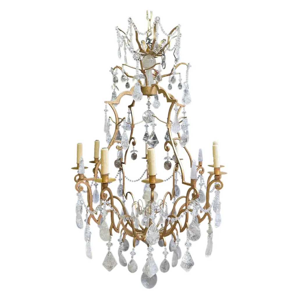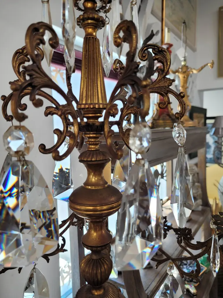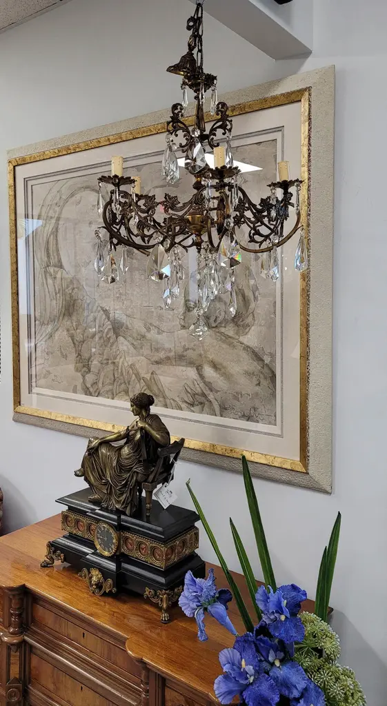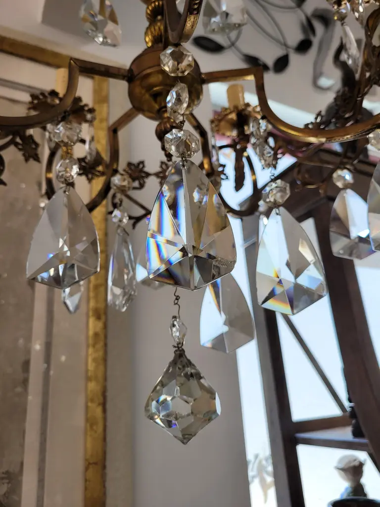 This elegant medium-sized Rococo Revival chandelier, dating to the late 19th to early 20th century, showcases the ornate charm of French-inspired design. Crafted from bronze, the frame features five scrolling arms and intricate foliate details that echo the flowing, asymmetrical lines of the Rococo style.Large, faceted lead crystal prisms and pendants adorn the chandelier, capturing and reflecting light. The organic silhouette and detailed metalwork suggest skilled craftsmanship, likely from a European or American foundry, though the piece is unsigned.A classic example of Victorian or Edwardian lighting, this chandelier makes a statement in a formal dining room, entryway, or library. Its combination of glittering crystal and time-worn metal offers both visual drama and historical character.