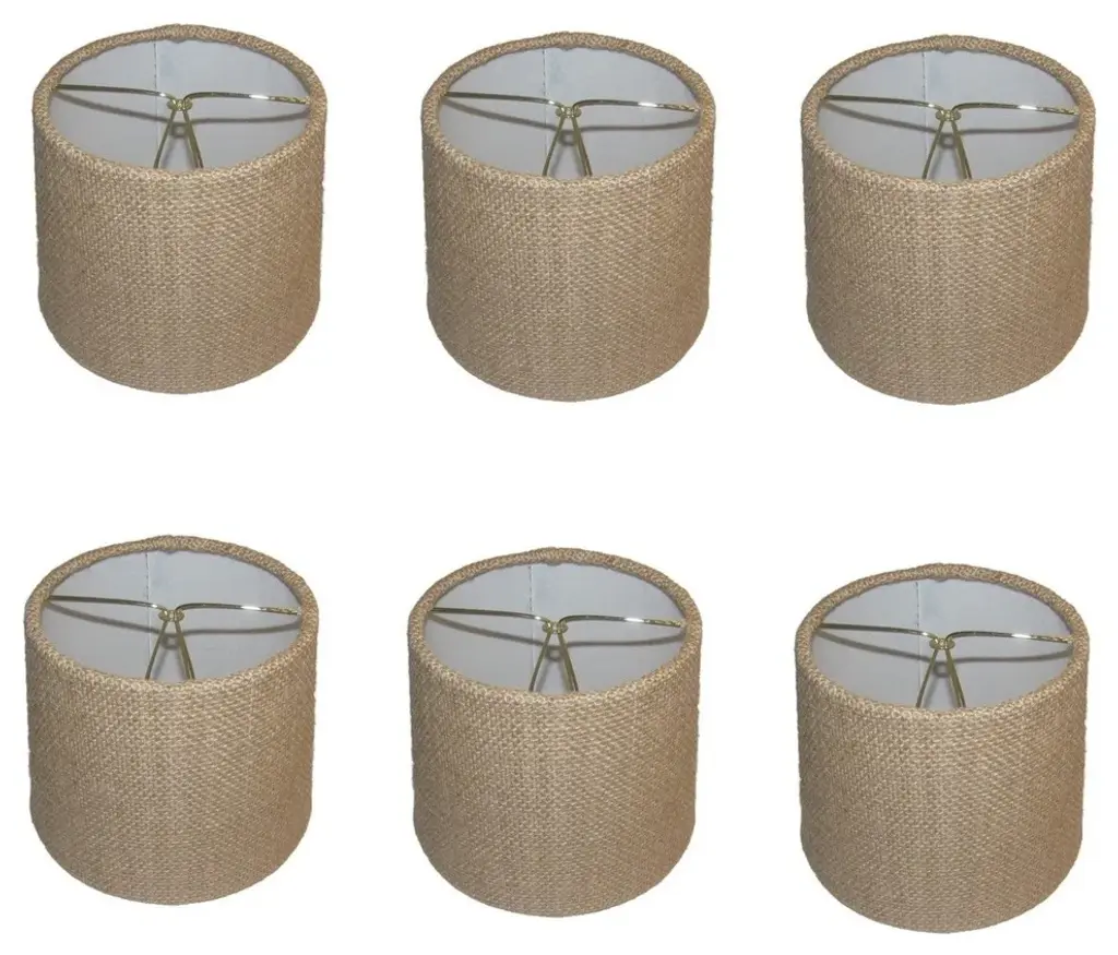 Upgradelights Chandelier Lamp Shades 6 inch European drum style with flame clip that attaches to candelabra bulb. Natural Beige Burlap Fabric 6 Inch Natural Burlap European style Drums Dimensions: 5 inch top, 6 inch bottom, 5 inch height Brass Flame clip (clips onto bulbs) Natural Beige Burlap High quality fabric with finished rolled edge Set of 6 Fitter: FLAME CLIP (FC) Fitter designed to fit over a Candelabra bulb base. (Most clip-on lampshadesare designed with a flame clip) Suggested maximum wattage is 60-watt candelabra bulb. Brass frame that is also rust resistant. Lining is white.