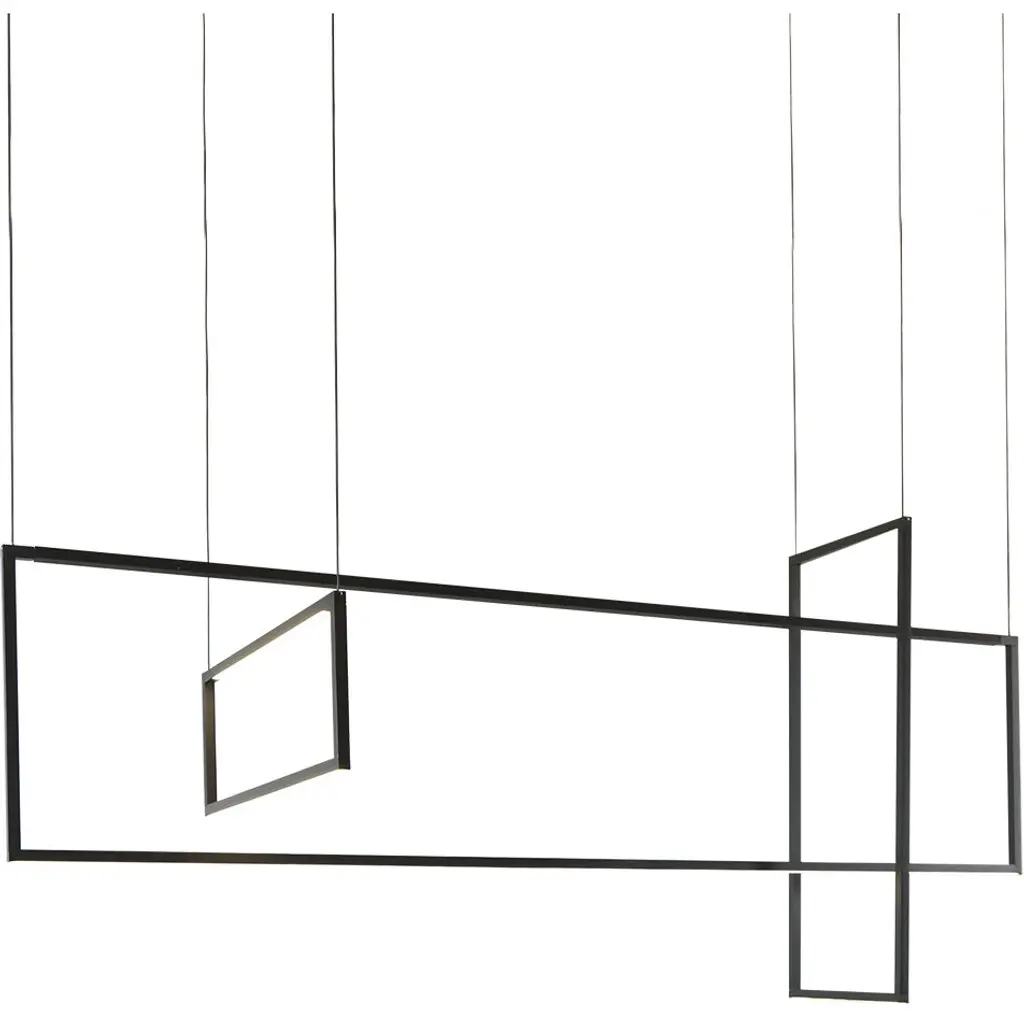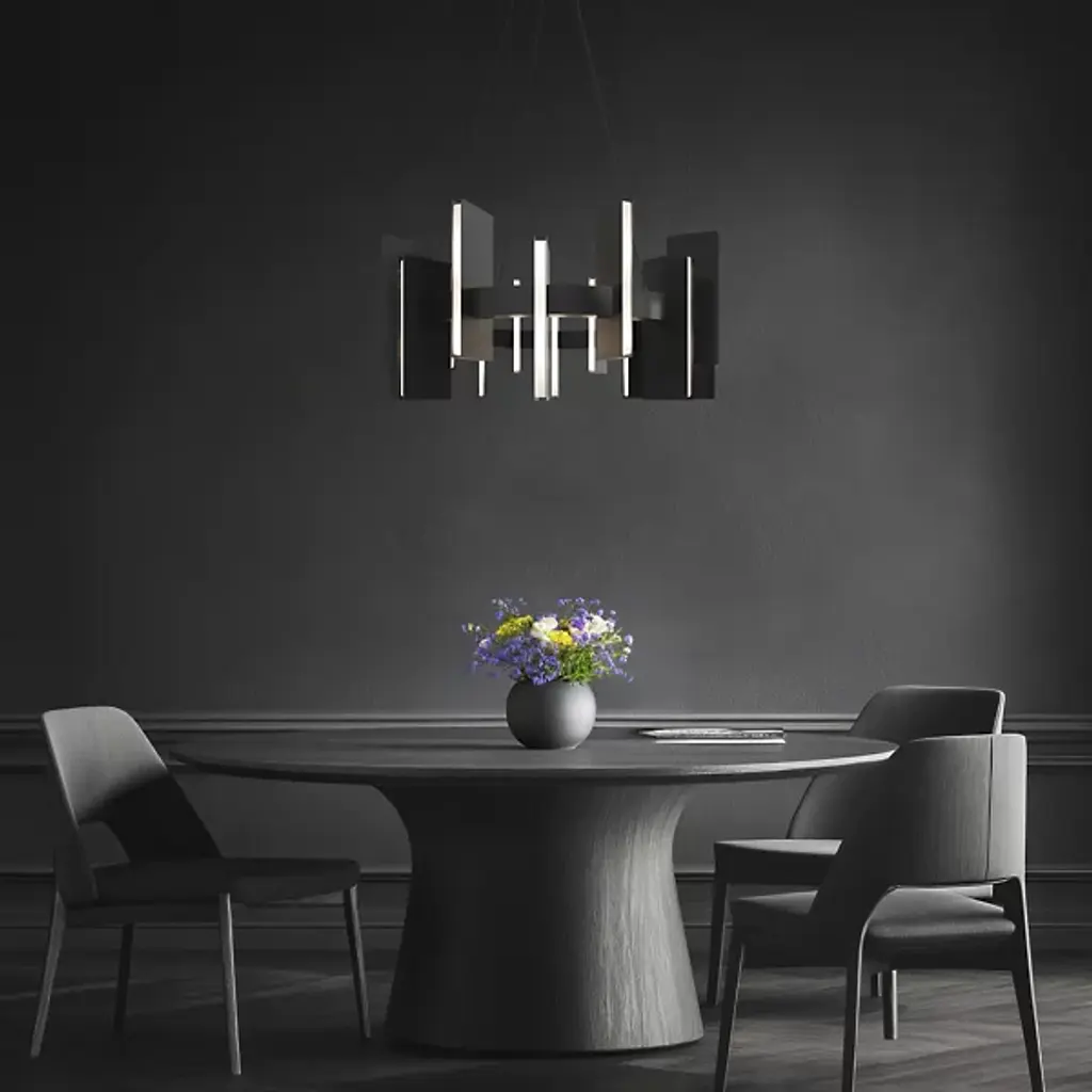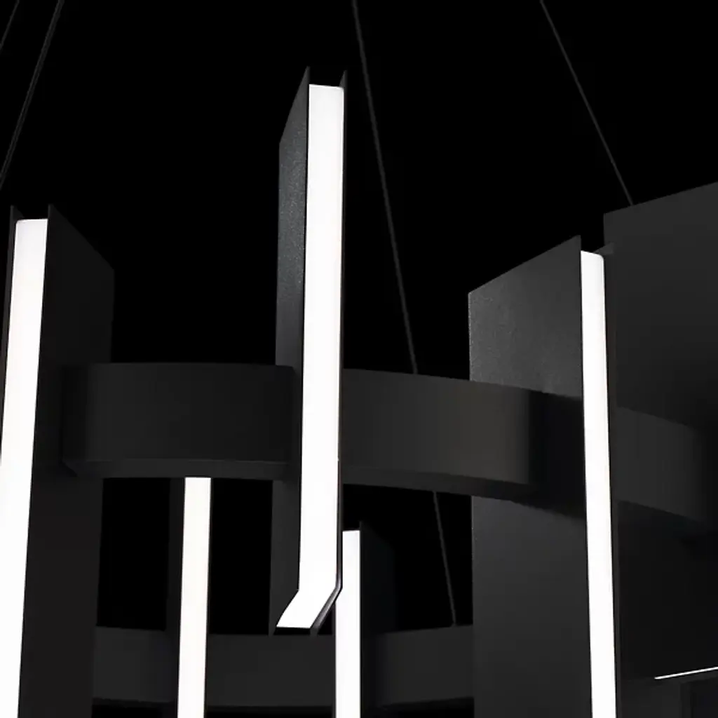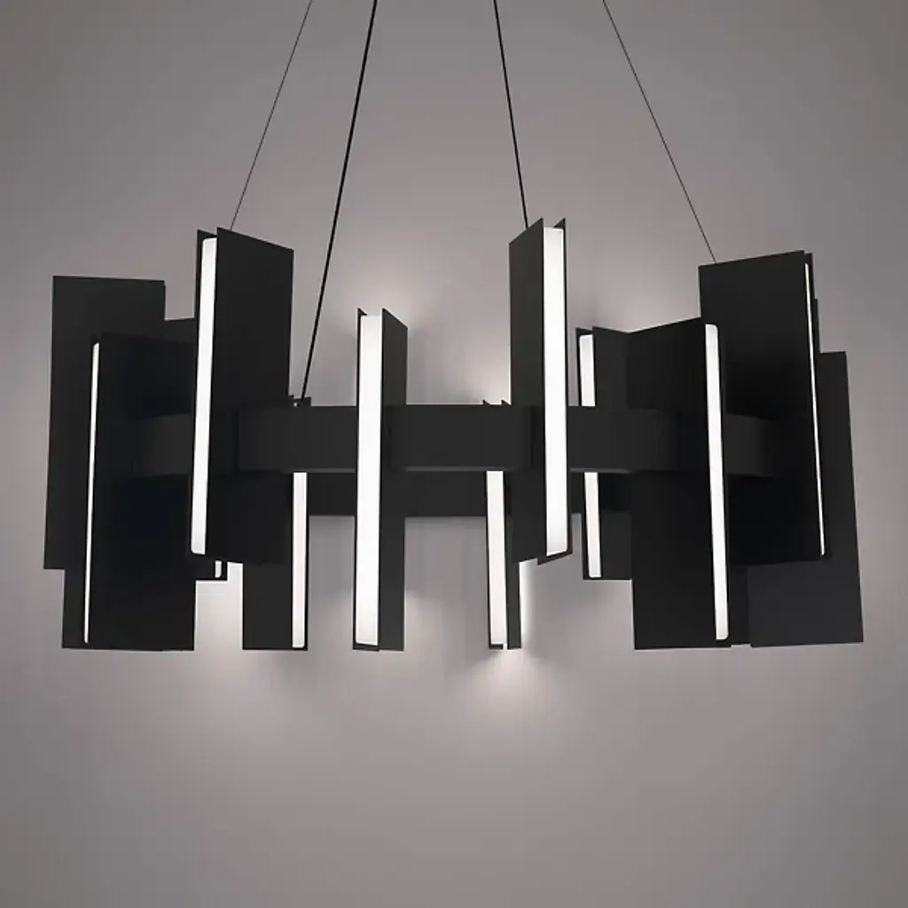 The Ronan LED Chandelier from Modern Forms arranges opaque aluminum panels at staggered heights around a circular frame, creating depth through varied positioning and LED edge lighting. Each panel receives LED trim along its perimeter, outlining the geometric forms with precise illumination, while the frosted acrylic diffusers provide additional light distribution. The robust cubic design contrasts with slender cable suspension, creating tension between heavy and light elements. Electrified cables eliminate traditional power cords while enabling height adjustment through push pin connectors for installation flexibility across different ceiling heights.