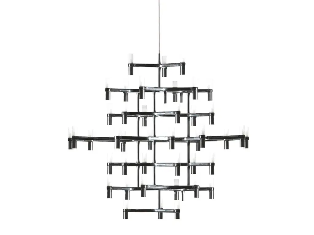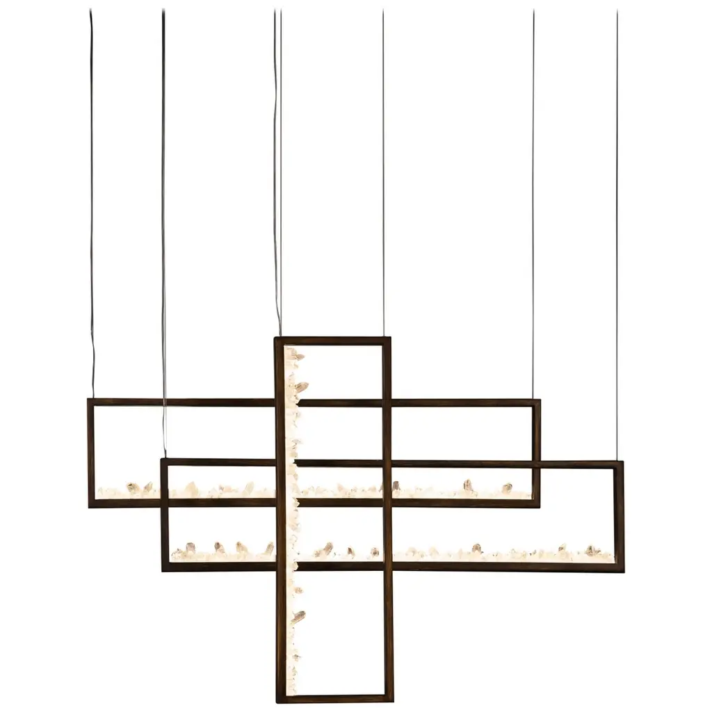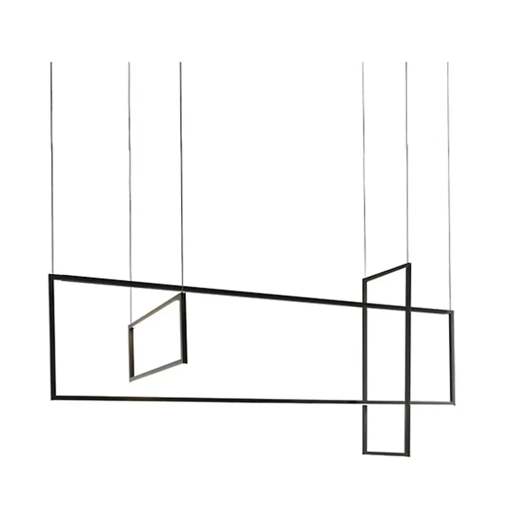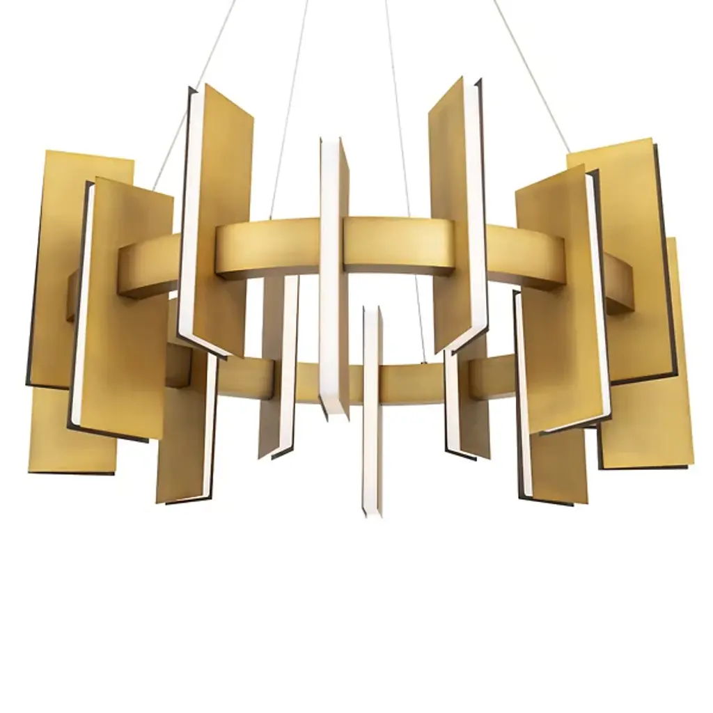 The Ronan LED Chandelier from Modern Forms arranges opaque aluminum panels at staggered heights around a circular frame, creating depth through varied positioning and LED edge lighting. Each panel receives LED trim along its perimeter, outlining the geometric forms with precise illumination, while the frosted acrylic diffusers provide additional light distribution. The robust cubic design contrasts with slender cable suspension, creating tension between heavy and light elements. Electrified cables eliminate traditional power cords while enabling height adjustment through push pin connectors for installation flexibility across different ceiling heights.