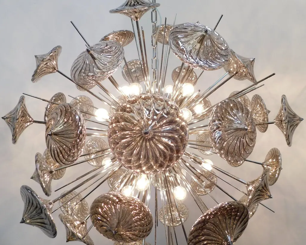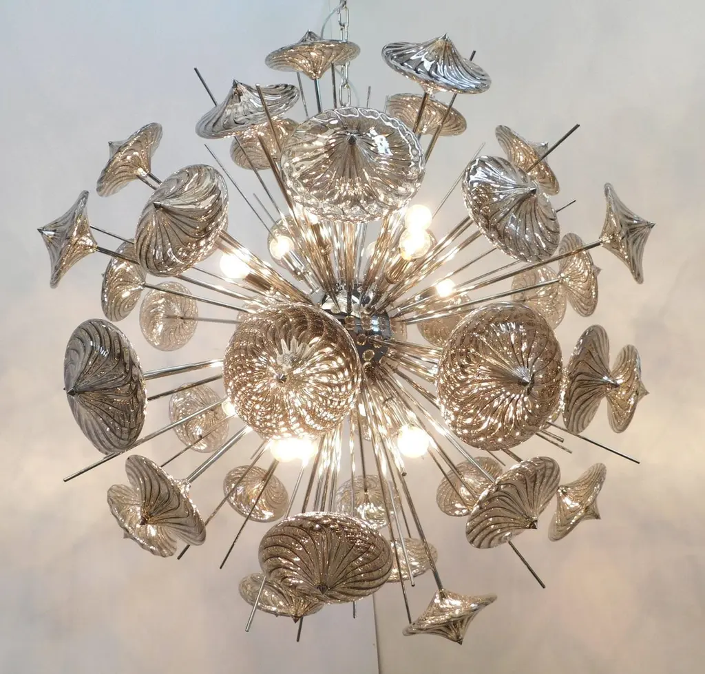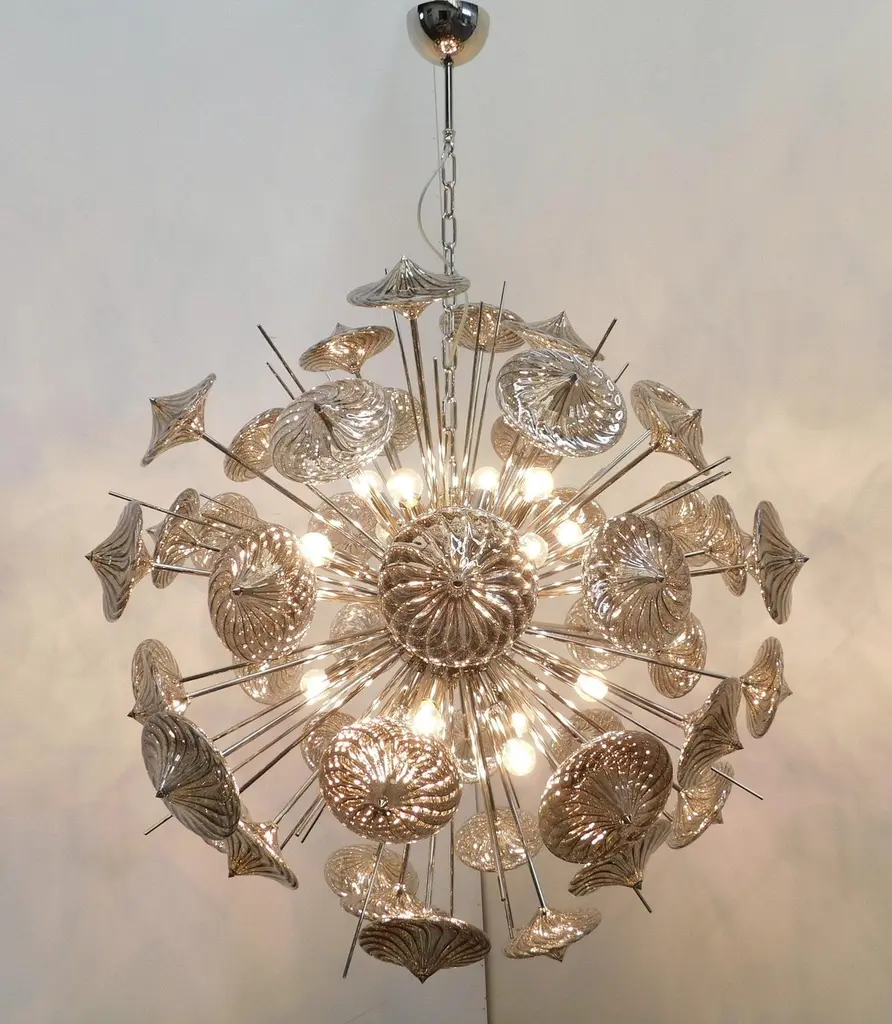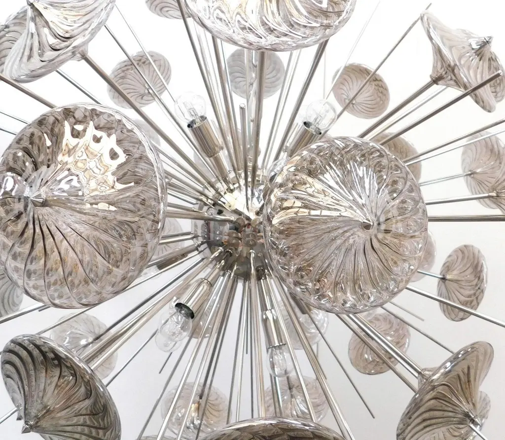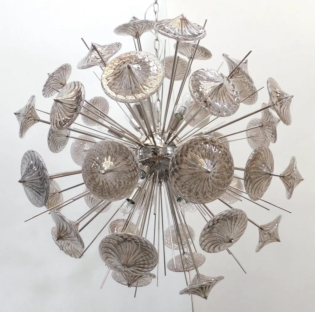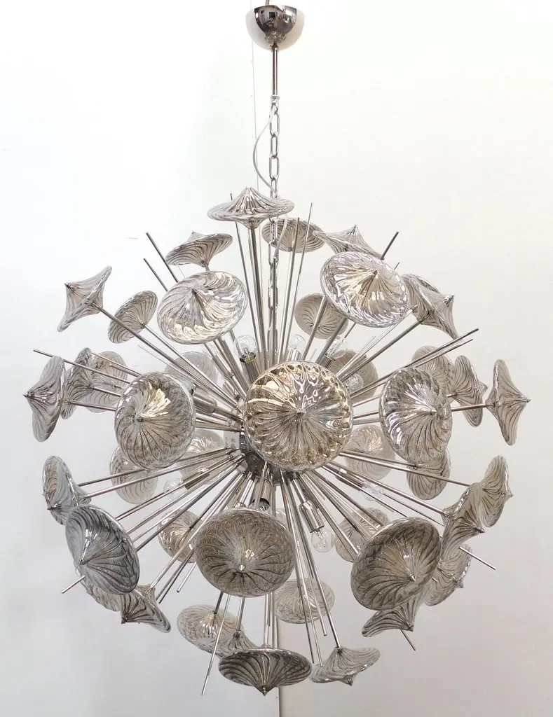 Italian modern Sputnik chandelier with smoky gray Pyrex borosilicate glass, hand blown to produce a spiraled effect mounted on polished nickel metal finish / Designed by Fabio Bergomi for Fabio Ltd / Made in Italy16 lights / E26 or E27 type / max 60W eachMeasures: Diameter 39.5 inches / Height 39.5 inches plus chain and canopy Order only / This item ships from ItalyOrder Reference #: FABIOLTD C628