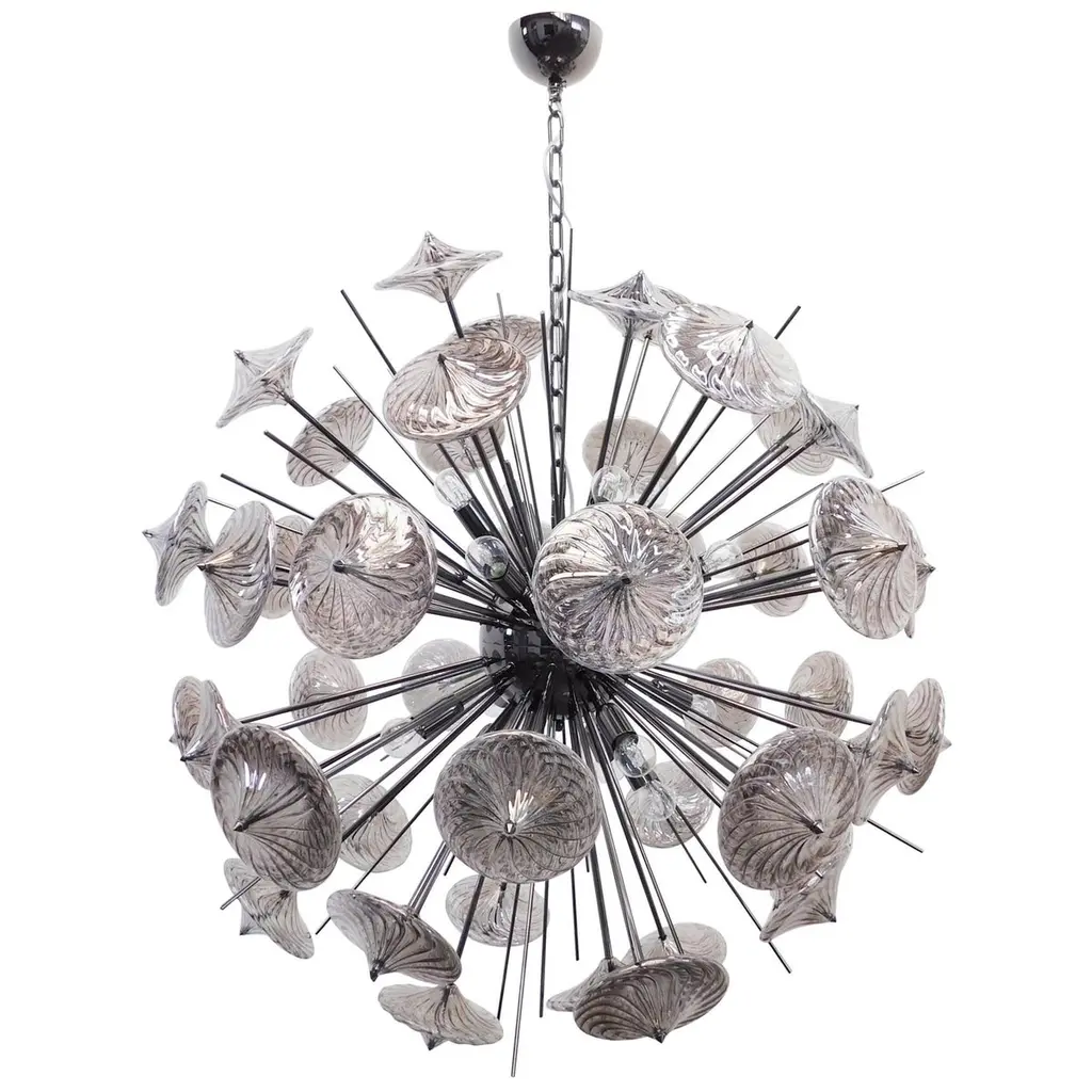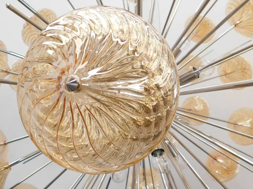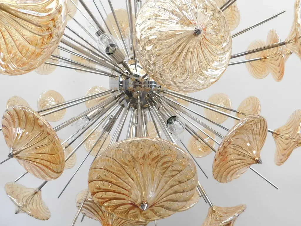 Italian modern Sputnik chandelier with amber Pyrex borosilicate glasses hand blown to produce a spiraled effect, mounted on polished nickel frame / Designed by Fabio Bergomi for Fabio Ltd / Made in Italy16-light / E26 or E27 type / max 60W eachMeasures: Diameter 39.5 inches, height 39.5 inches plus chain and canopyOrder only / This item ships from Italy.Please inquire for custom options / pricing / current lead timesOrder Reference #: FABIOLTD C628 AMBER