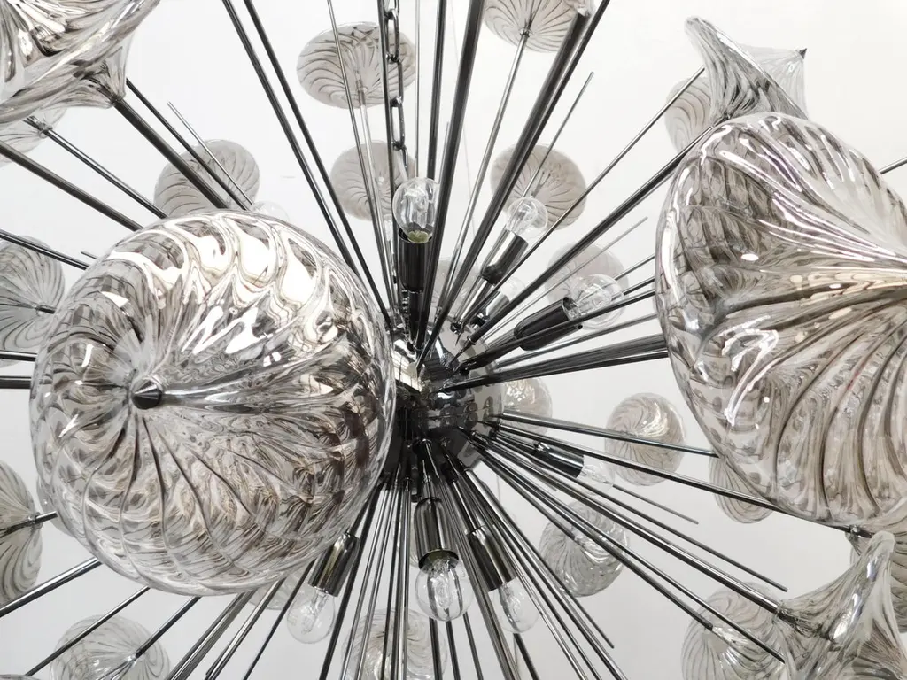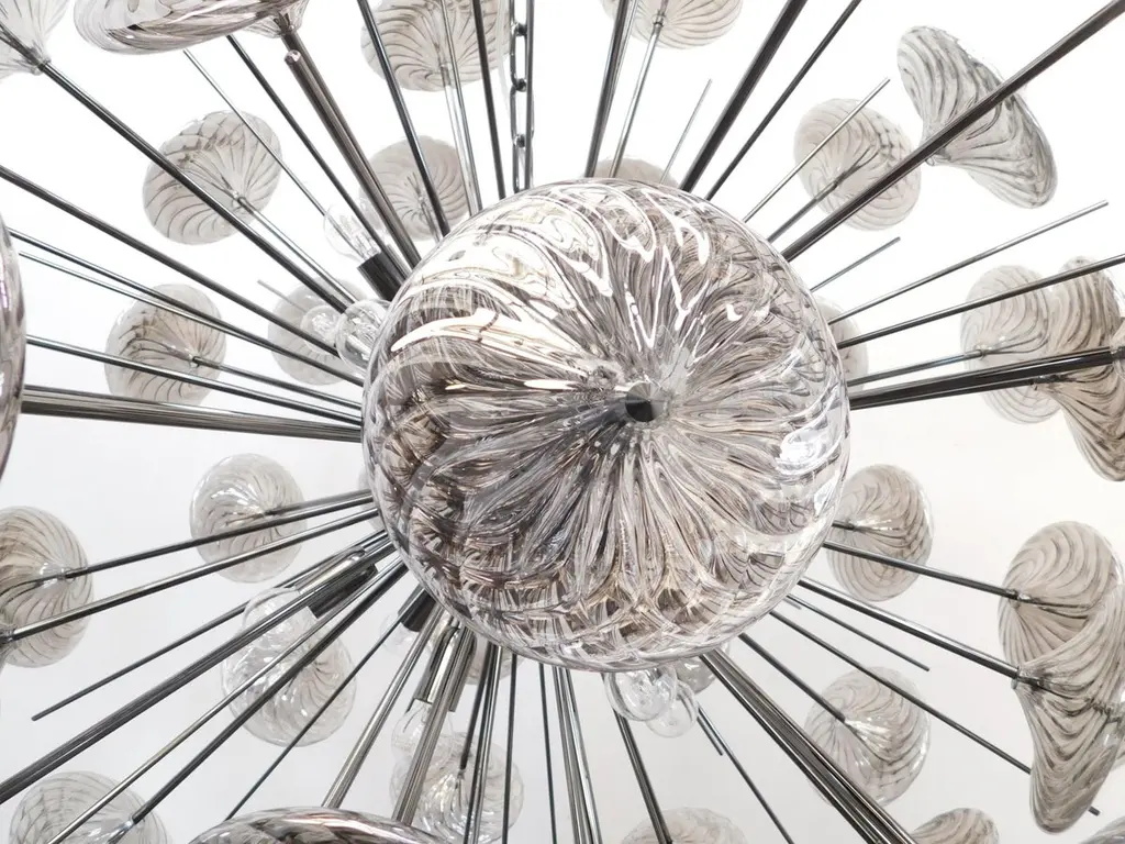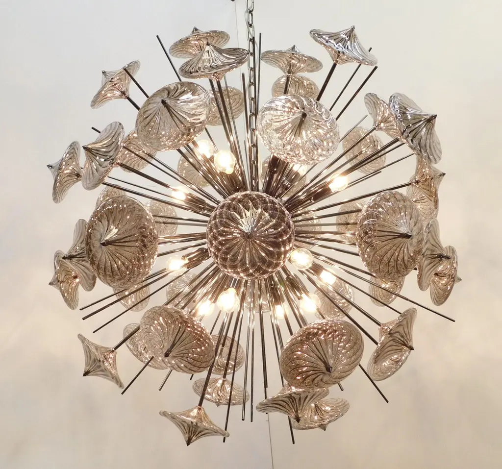 Italian modern Sputnik chandelier shown in smoky gray Pyrex borosilicate glasses hand blown to produce a spiraled effect, mounted on polished black nickel frame / Designed by Fabio Bergomi for Fabio Ltd / Made in Italy16-light / E26 or E27 type / max 60W eachMeasures: Diameter 39.5 inches, height 39.5 inches plus chain and canopyOrder only / This item ships from ItalyOrder reference #: FABIOLTD C499 SMOKY