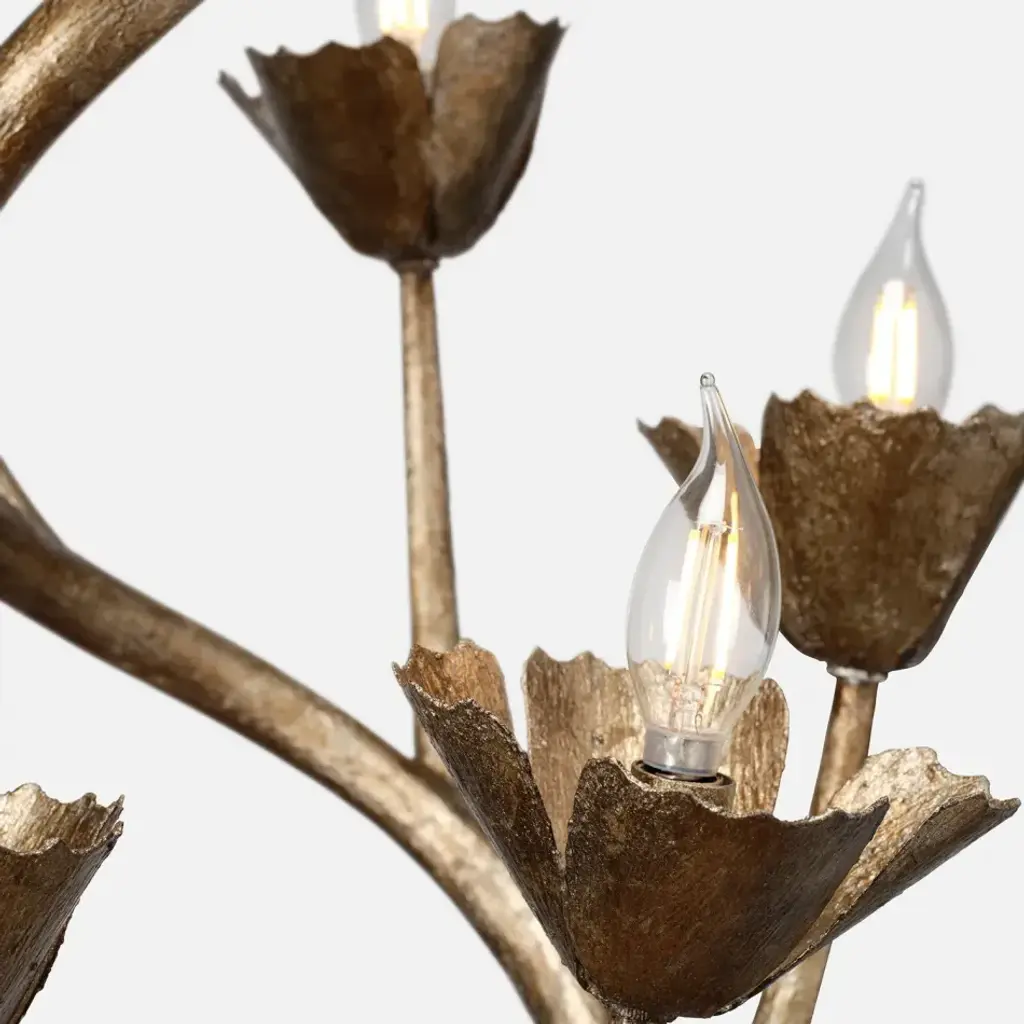 Our Rosemary chandelier features petal-like lights arranged in a rose-inspired spiral design. Its elegant, curvy frame creates an artistic centerpiece that radiates light beautifully.