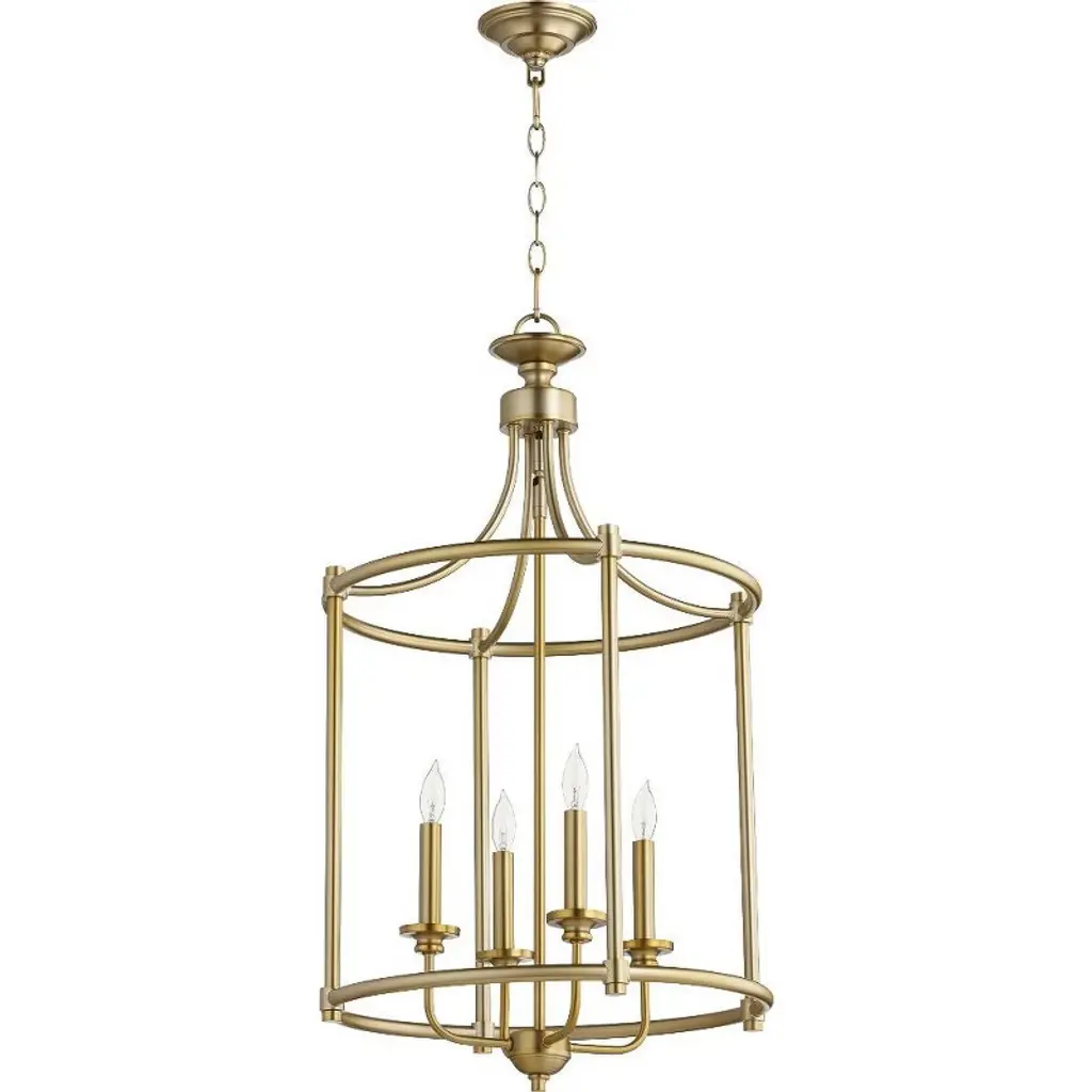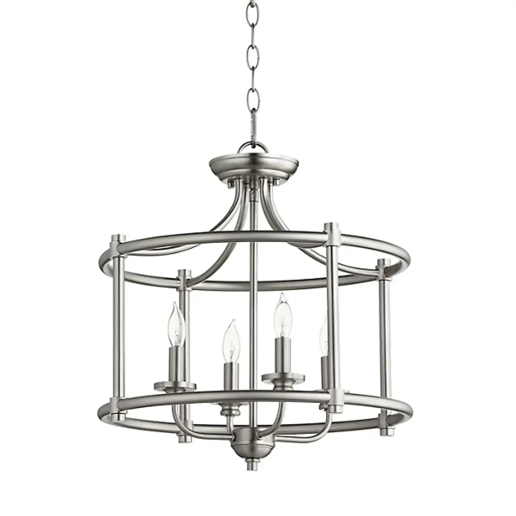 Simple design can offer a touch of whimsy, as seen in the Rossington Chandelier by Quorum International. Smooth metal arms form a drum-shaped frame around a series of candles, while vertical bars enclose the fixture. Conjuring the look of a classic carousel, this chandelier is suspended from a circular canopy and chain, with a tapered top adding to its character. Effortlessly balancing playful and elegant, this fixture illuminates while offering a delightful decorative accent.