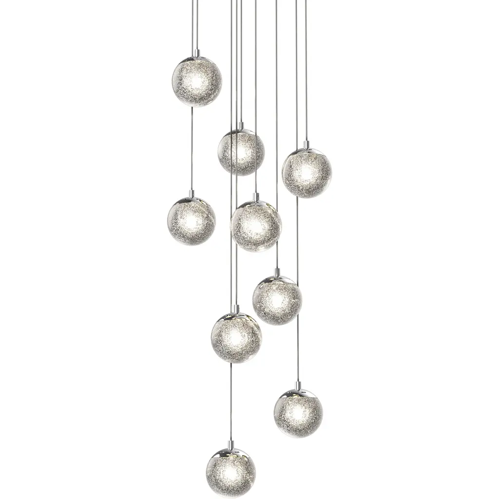 Round 14.11 chandelier lamp by BocciDimensions: Diameter 60 x H 300 cm Materials: Brushed Nickel, Cast glass, blown borosilicate glass, braided metal coaxial cable, electrical components, white powder-coated canopy.Available in Rectangular or Square canopy. Sold individually and in different sizes. Also available in 350 cm Height. All our lamps can be wired according to each country. If sold to the USA it will be wired for the USA for instance.14.11 is a low-voltage arrangement of 11 articulated, cast glass spheres with frosted cylindrical voids, each housing either a 10-watt xenon or 1.5-watt LED lamp. 14.11 uses headphone jack connections, which allow the pendants to be “plugged into” the canopy for fast and easy installation. Pendant lengths are pre-set during production and are not site adjustable. There are two standard canopy options. Both options have a white, powder-coated finish. Non-adjustable height. Bocci is a design and manufacturing company based in Vancouver and Berlin. Founded in 2005 under the creative directorship of Omer Arbel, Bocci is committed to fostering a lateral and open-ended relationship between creative direction and craft. The company launched with one lighting design, ‘14’, which became an instant classic and remains a design staple and bestseller. Bocci’s growing portfolio of sculptural lighting is developed, engineered, and fabricated in-house, through an infrastructure calibrated to provide full control over technique, quality, and scale.In 2015, Bocci transformed a historic Berlin building into a showroom and archive. ‘Bocci 79’ inhabited a 2,200 m² / 23,600 sq ft former courthouse, constructed in 1896, and showcased over a decade of works by Omer Arbel, ranging from pieces in progress, prototypes, and ideas, to the complete range of catalog pieces developed for Bocci.Bocci 79 closed in June 2020 and we are currently working on our new, permanent Berlin showroom which will open soon.