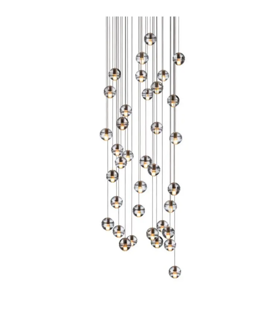 Round 14.36 chandelier lamp by BocciDimensions: Diameter 75.5 x H 300 cmMaterials: Brushed Nickel, Cast glass, blown borosilicate glass, braided metal coaxial cable, electrical components, and white powder-coated canopy.Available in Square, or Rectangular canopy. Sold individually and in different sizes. Also available in 350 cm Height.All our lamps can be wired according to each country. If sold to the USA it will be wired for the USA for instance.14.36 is a low-voltage arrangement of 36 articulated, cast glass spheres with frosted cylindrical voids, each housing either a 10-watt xenon or 1.5-watt LED lamp. 14.36 uses headphone jack connections, which allow the pendants to be “plugged into” the canopy for fast and easy installation. Pendant lengths are pre-set during production and are not site adjustable. There are three standard canopy options. All options have a white, powder-coated finish. All options have a white, powder-coated finish. Non-adjustable height.Bocci is a design and manufacturing company based in Vancouver and Berlin. Founded in 2005 under the creative directorship of Omer Arbel, Bocci is committed to fostering a lateral and open-ended relationship between creative direction and Craft.The company launched with one lighting design, ‘14’, which became an instant Classic and remains a design staple and bestseller. Bocci’s growing portfolio of sculptural lighting is developed, engineered, and fabricated in-house, through an infrastructure calibrated to provide full control over technique, quality, and scale.In 2015, Bocci transformed a historic Berlin building into a showroom and archive. ‘Bocci 79’ inhabited a 2,200 m² / 23,600 sq ft former courthouse, constructed in 1896, and showcased over a decade of works by Omer Arbel, ranging from pieces in progress, prototypes, and ideas, to the complete range of catalog pieces developed for Bocci.Bocci 79 closed in June 2020 and we are currently working on our new, permanent Berlin showroom which will open soon.