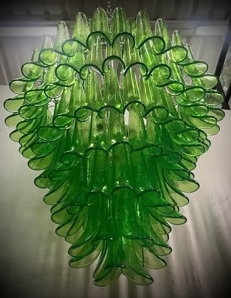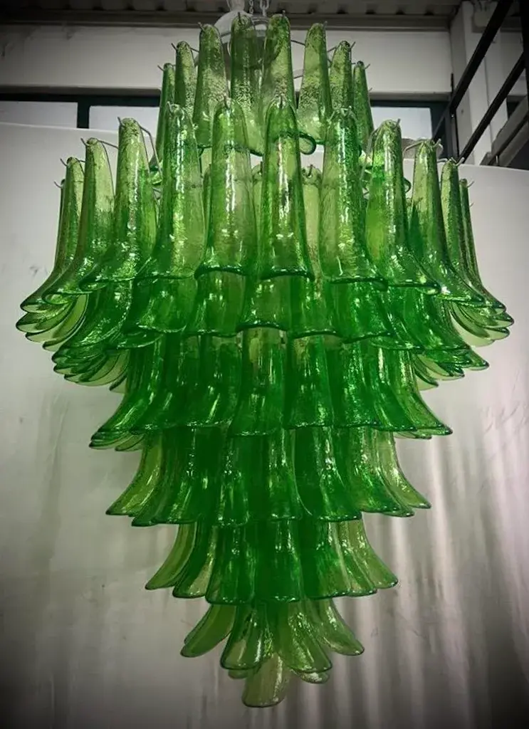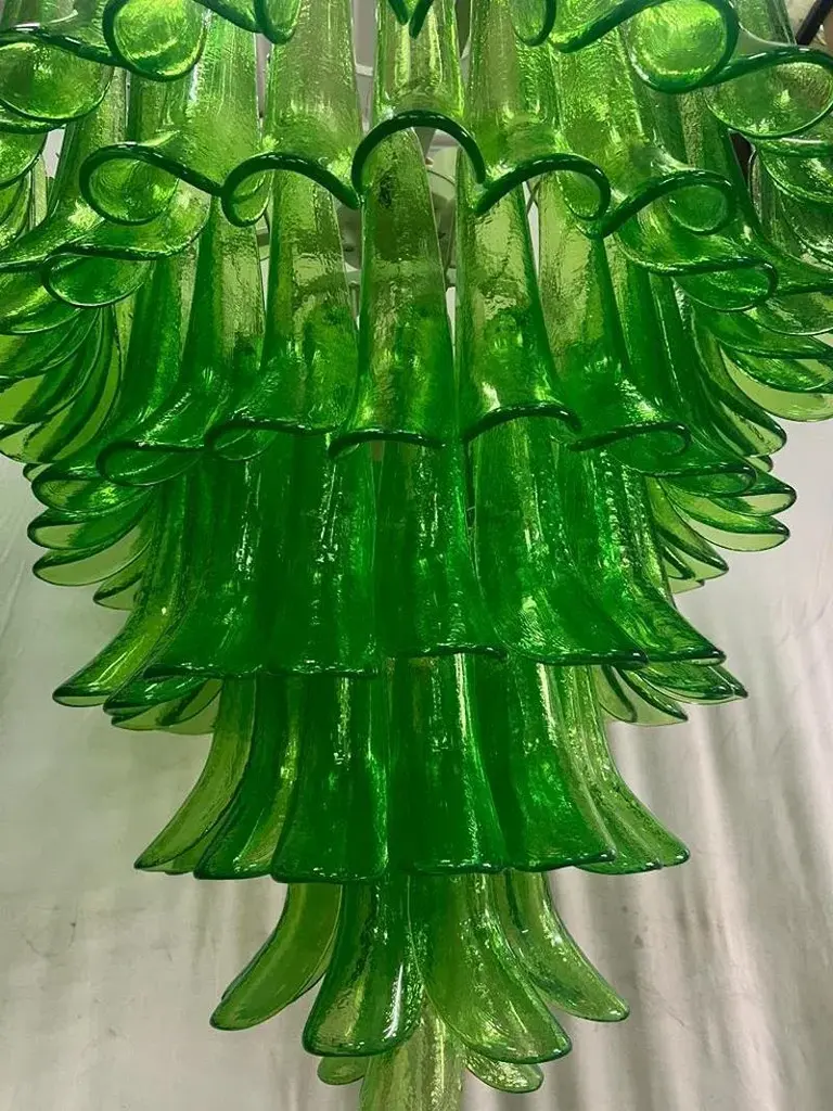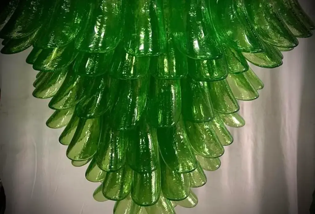 Extraordinary green color for this "Mazzega" Murano chandelier, a strong green color with a unique transparency. Its green color is really guessed for a different and original chandelier from others. A beautiful stain of color above your ceiling will drive anyone crazy into your home. The chandelier has a round white metal structure. All around there are green colored Murano glass tiles. There are seven concentric circles, which widen more and more from the bottom up to the last circle at the top. Then again the last circle narrows to cover the hook on the ceiling, so as to be attached directly to the ceiling. Inside there are twelve bulbs on multiple levels. Refinement and class as in the Murano style, one-of-a-kind pieces that always remain precious. When turned on, the chandelier is very bright as it has many light bulbs with large lamp holders, it will illuminate your desk with an intense green. European Plug (up to 250V).The wiring of this item may be original and might need replacement, if not specified otherwise.