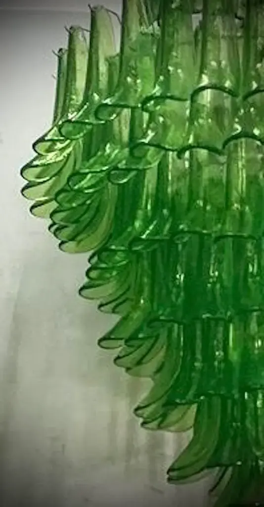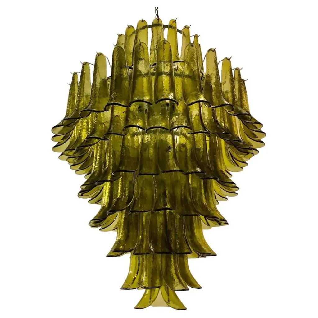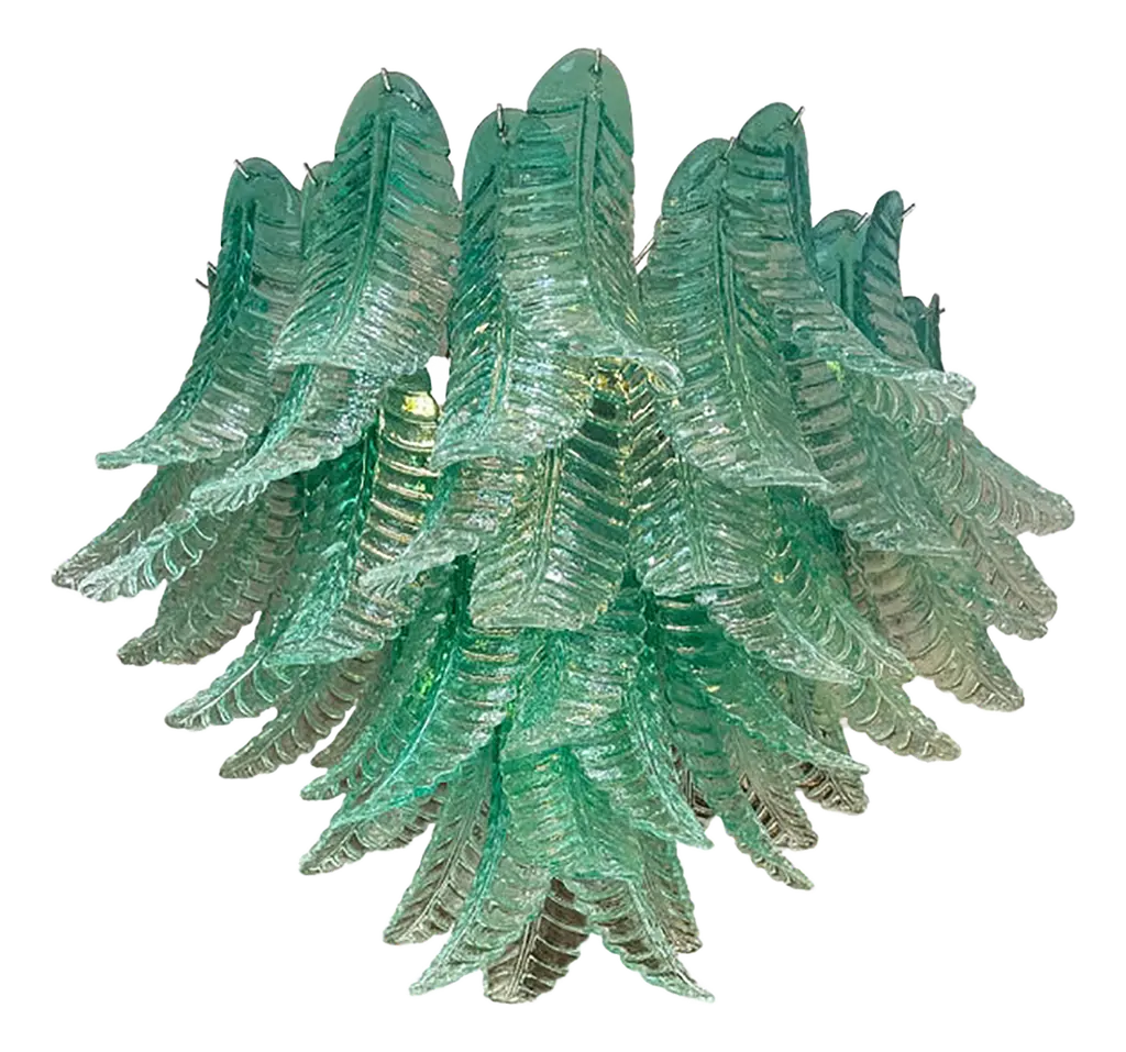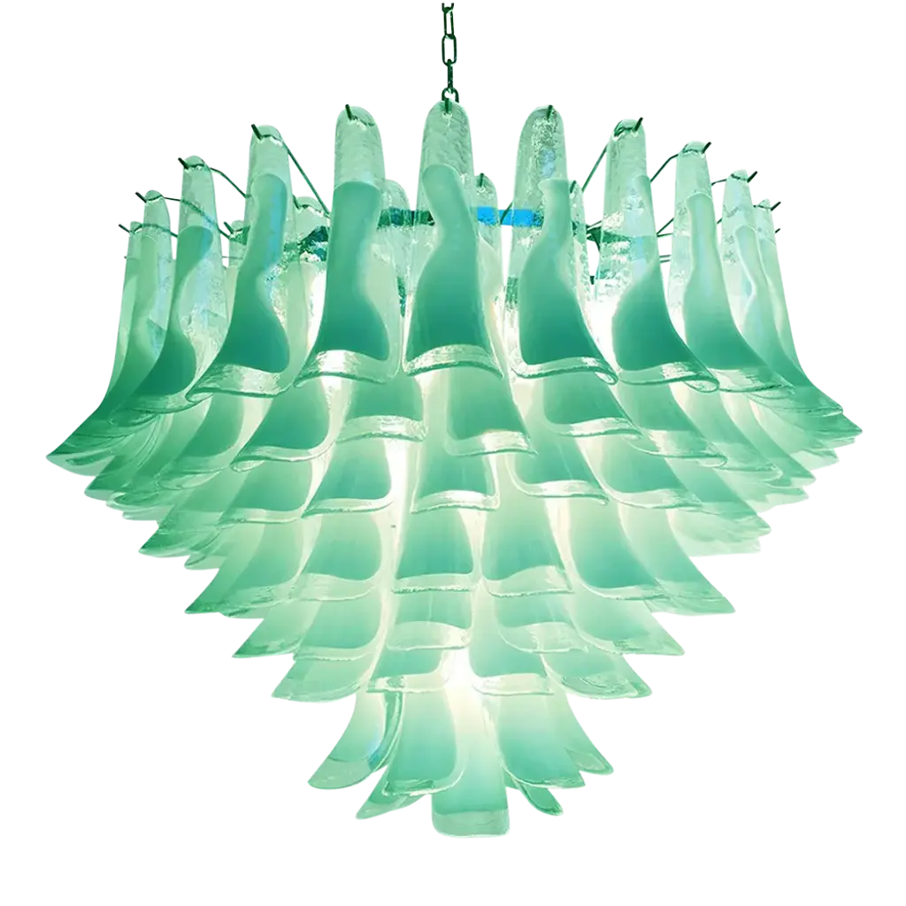 Extraordinary green color for this "Mazzega" Murano chandelier, a strong green color with a unique transparency. Its green color is really guessed for a different and original chandelier from others. A beautiful stain of color above your ceiling will drive anyone crazy into your home. The chandelier has a round white metal structure. All around there are green colored Murano glass tiles. There are seven concentric circles, which widen more and more from the bottom up to the last circle at the top. Then again the last circle narrows to cover the hook on the ceiling, so as to be attached directly to the ceiling. Inside there are twelve bulbs on multiple levels. Refinement and class as in the Murano style, one-of-a-kind pieces that always remain precious. When turned on, the chandelier is very bright as it has many light bulbs with large lamp holders, it will illuminate your desk with an intense green. European Plug (up to 250V).The wiring of this item may be original and might need replacement, if not specified otherwise.