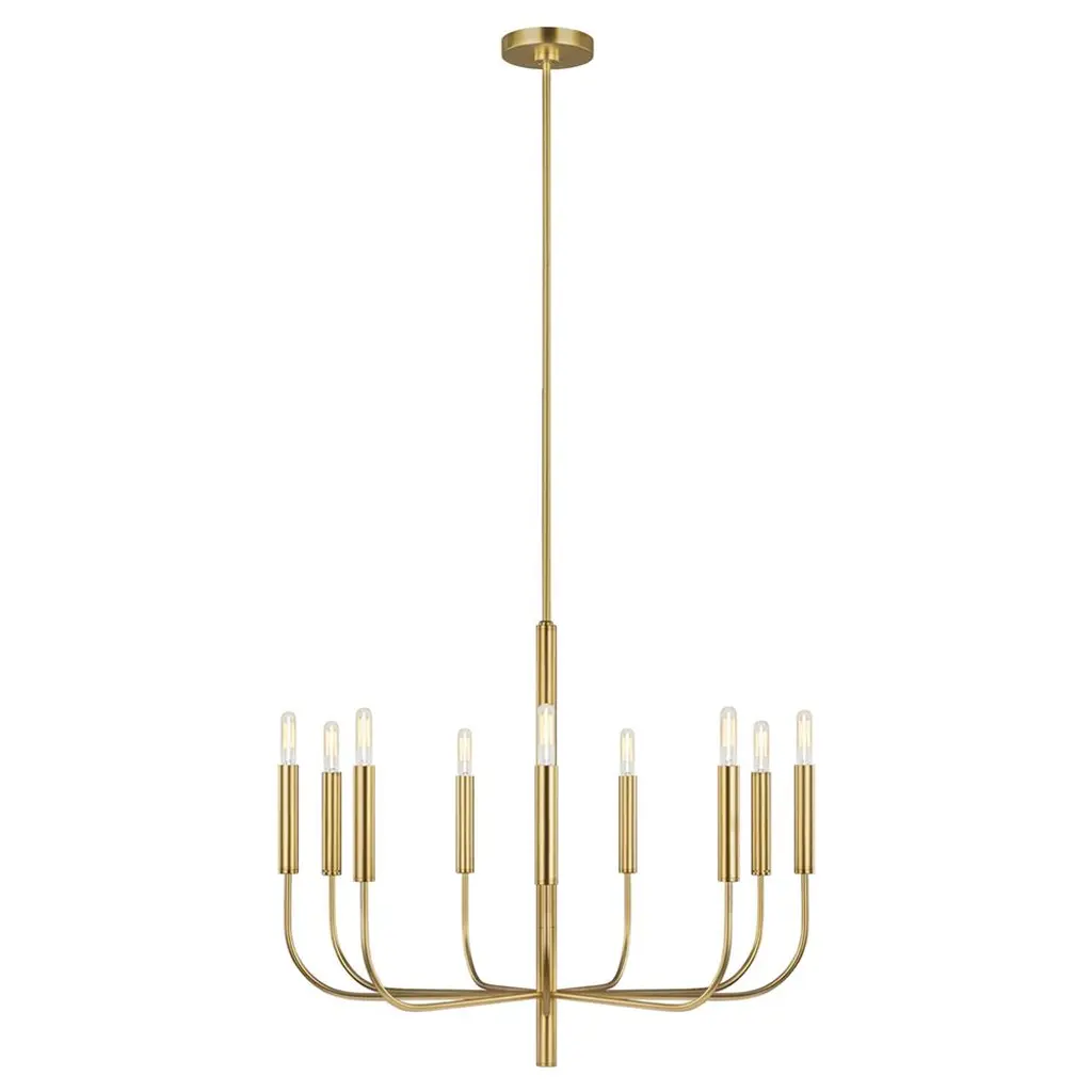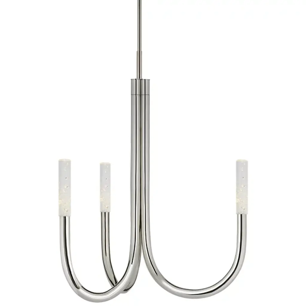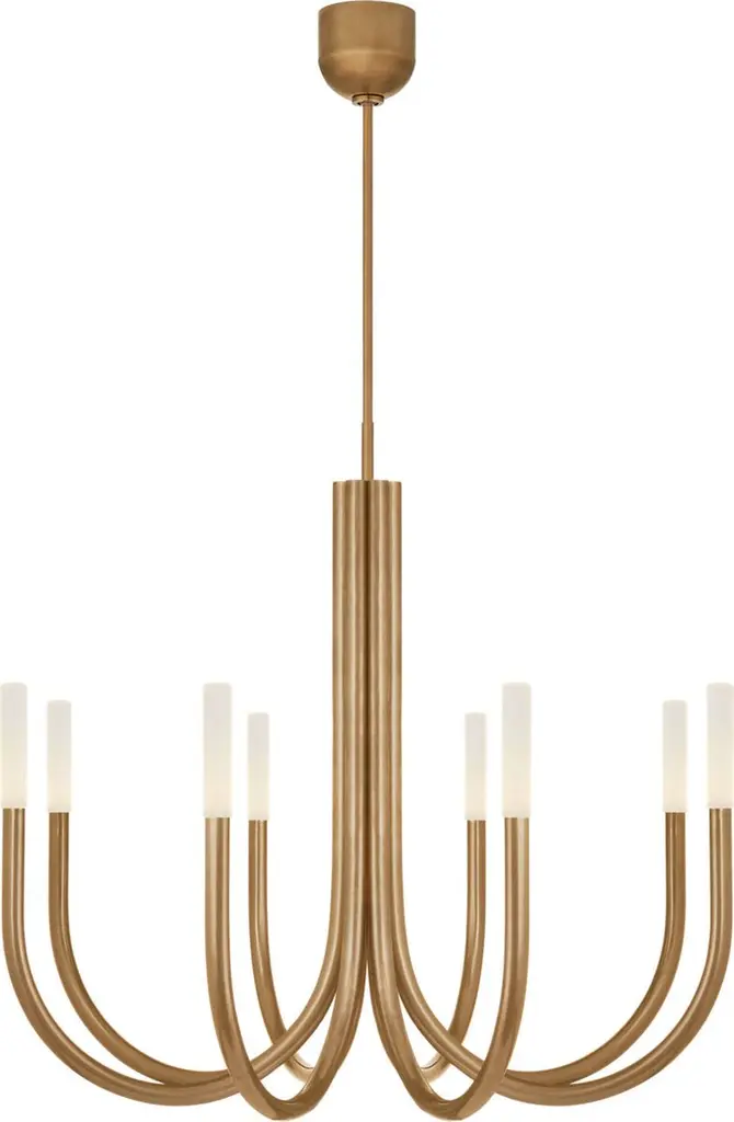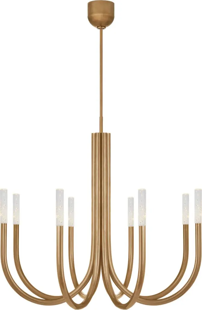 Distinct designer style. The Rousseau LED Chandelier by Visual Comfort Signature, formerly known as Visual Comfort, flows perfectly with minimalist spaces. Set apart by its curvilinear candelabra of metal tubes and cylindrical glass shades, it looks striking suspended over a contemporary dining table or seating area. This modern ceiling fixture and its mounting hardware are done in a timeless finish to complement interior décor and furnishings.