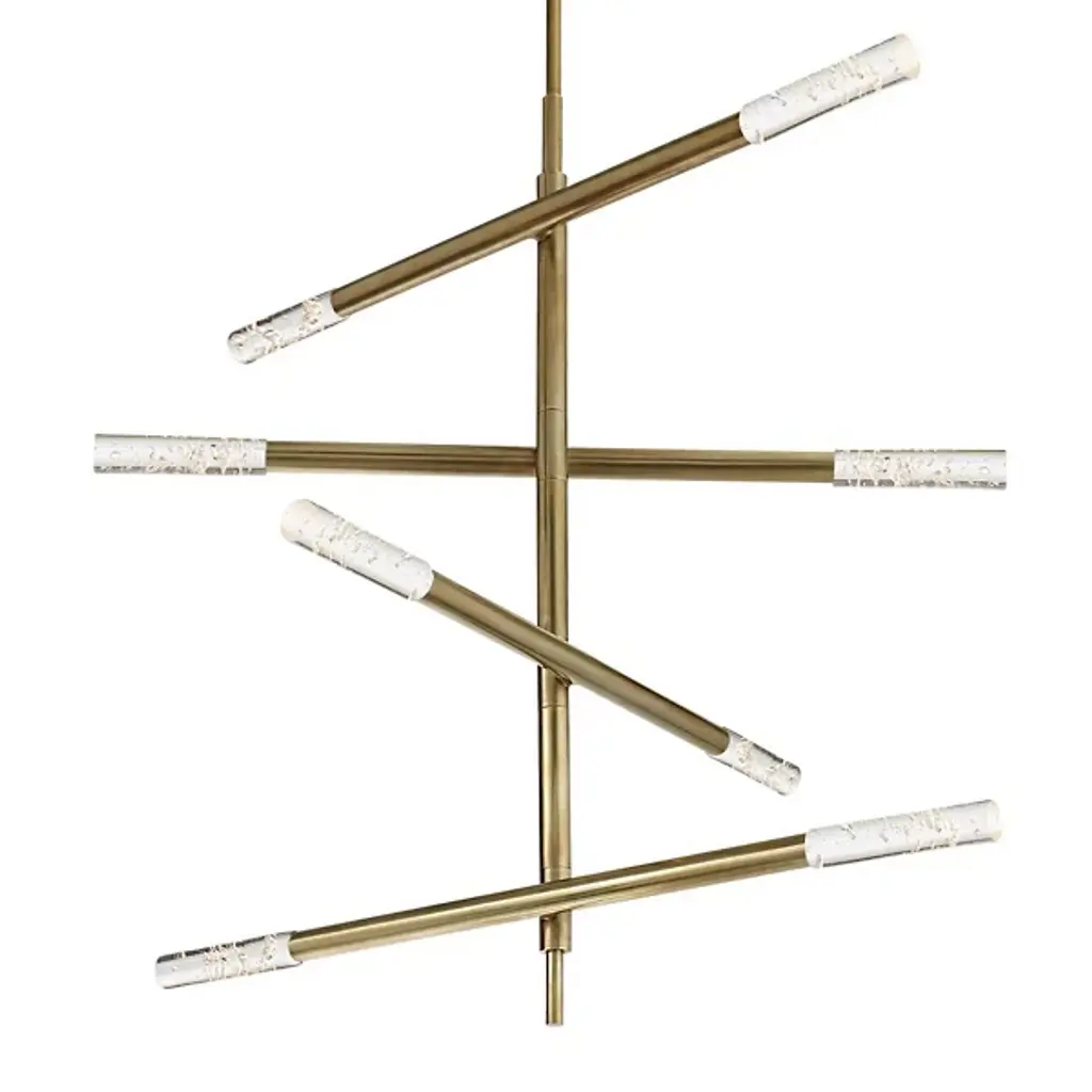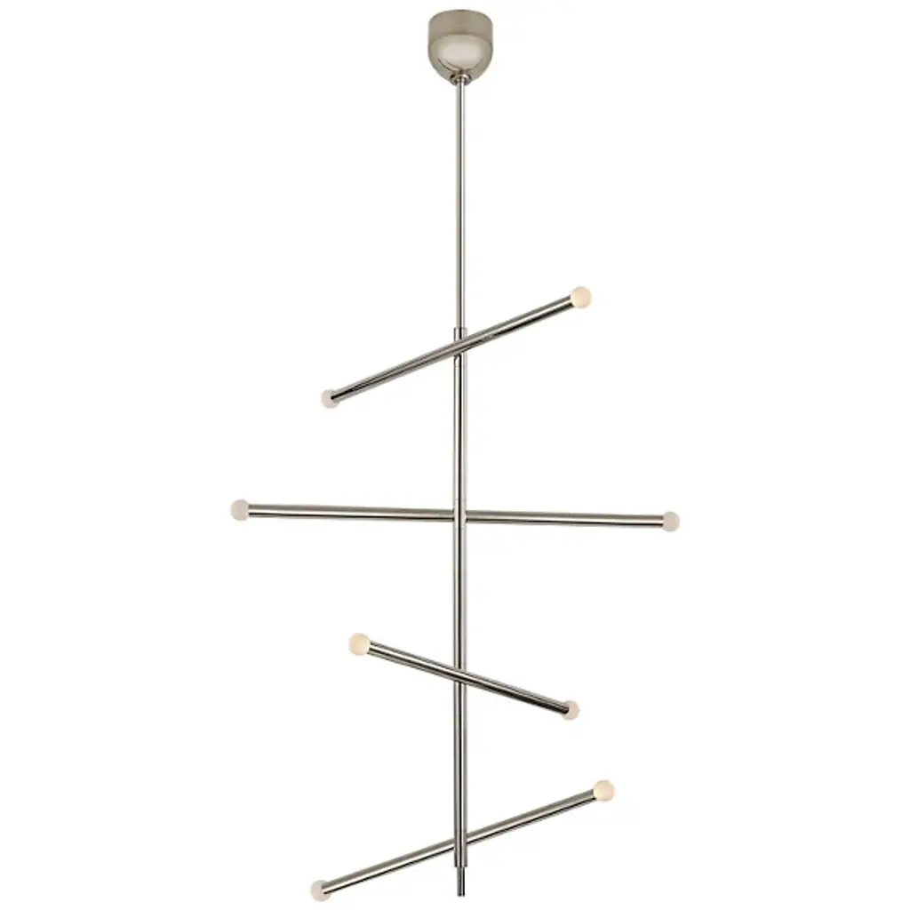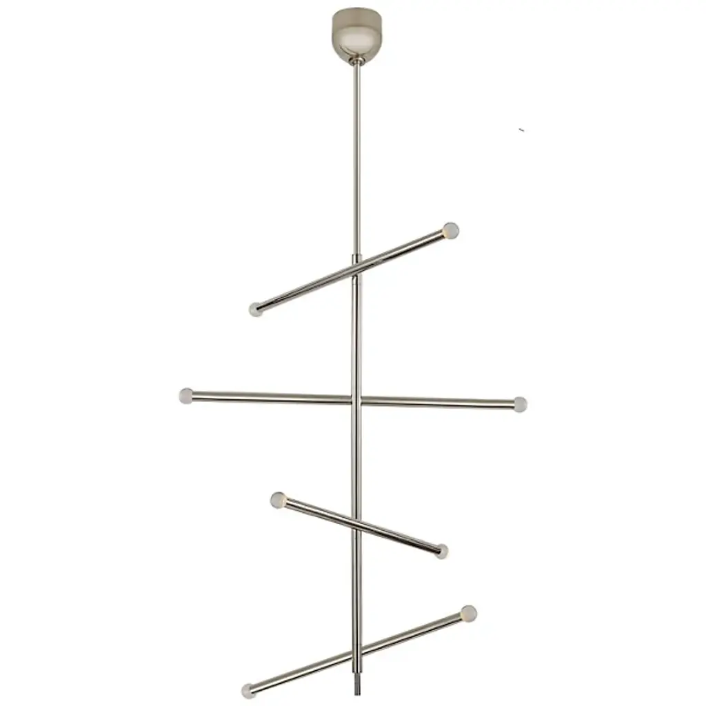 Add depth to the blank slates of your existing décor with the Rousseau LED Chandelier by Visual Comfort Signature, formerly known as Visual Comfort, A four-tier chandelier designed by Kelly Wearstler, it drops from an extended dome canopy via a single slim stem, supporting angled horizontal rods with LEDs tucked under seeded glass shades at each end. The Rousseau offers a refined mix of the sculptural with the functional, shining down with a pleasant and encompassing ambiance.