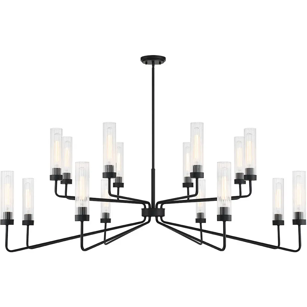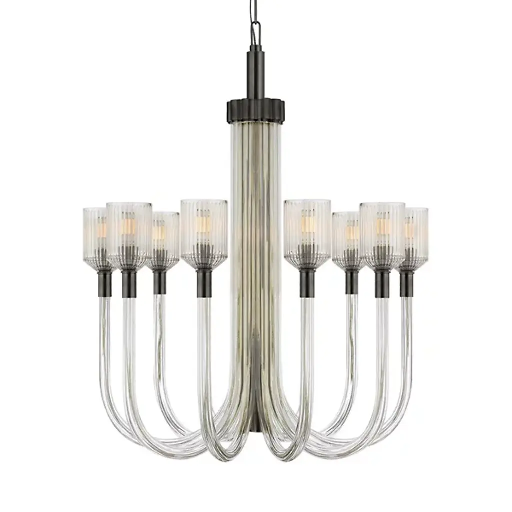Add some refined style to spruce up modern interiors. The Rousseau LED Oval Chandelier by Visual Comfort Signature, formerly known as Visual Comfort, is an extravagant piece of lighting that features cascading metal rods that curve upward in a linear fashion. The rods are capped with cylindrical glass shades through which integrated LEDs emanate a bright white light. A round, dome-shaped canopy completes the look. This ceiling fixture works best when installed in a large living room or dining hall.