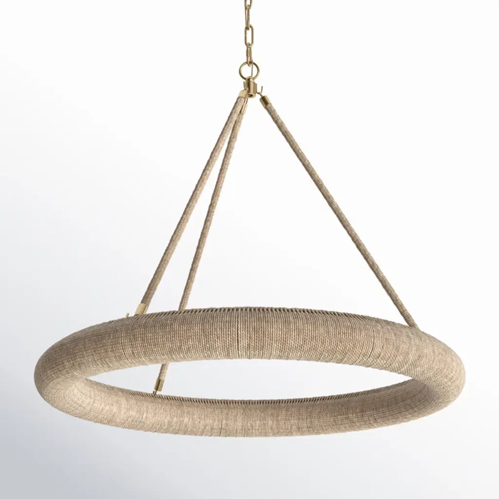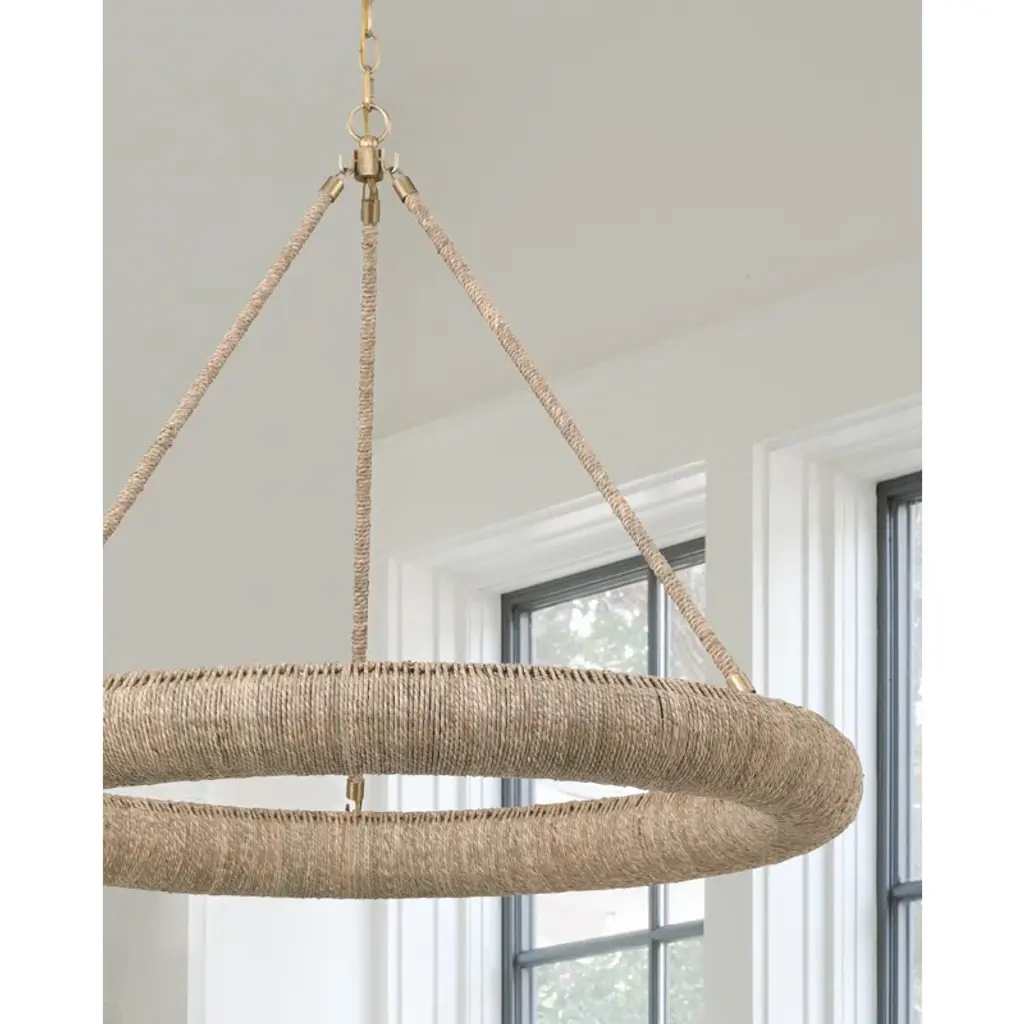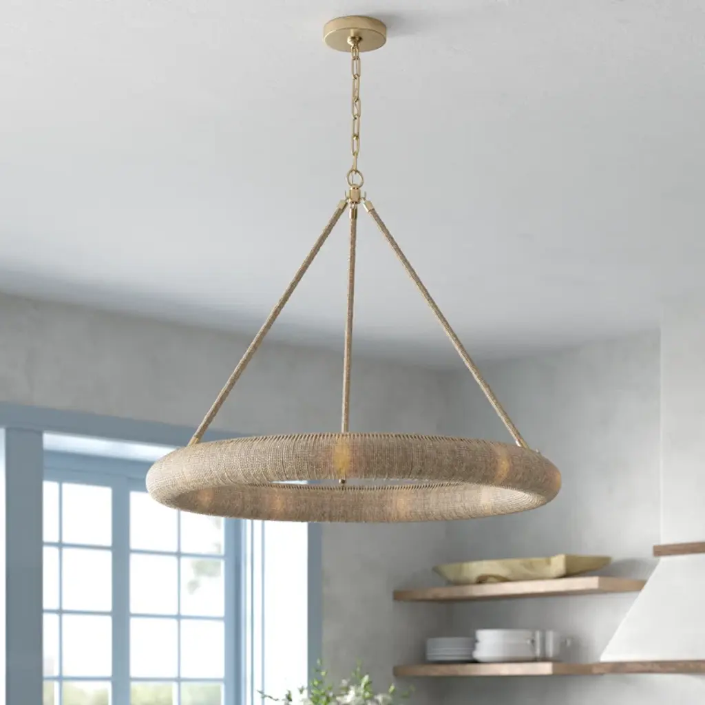 This 8-light wagon wheel chandelier brings coastal charm and a warm, ambient glow to your living space. Crafted from steel with a gold finish, its frame features an open-top design that directs light upward while casting a soft, filtered glow downward. The natural jute hand-wrapped details add depth and character. With eight LED lights and a sloped ceiling-compatible design, this chandelier adapts effortlessly to your living room or entryway. The dual mounting options ensure a seamless fit, while the damp location listing allows for versatile placement. Plus, it works with a dimmer to get the right lighting.