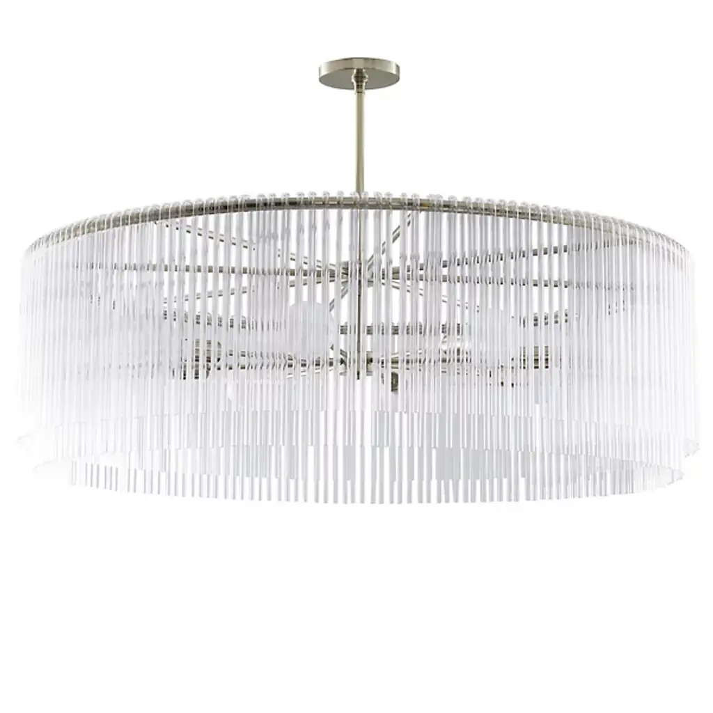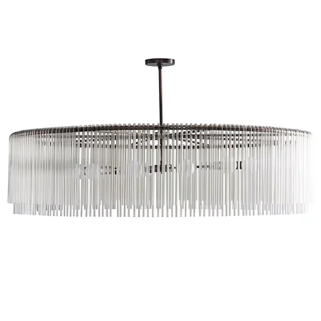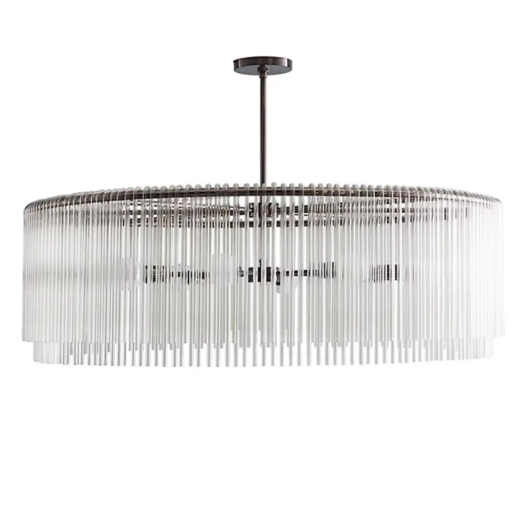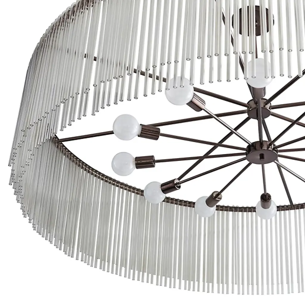 Stylishly adorn your home with a sophisticated Royalton Chandelier by Arteriors. The large steel frame is covered in vertical glass rods for a sleek design with transitional chic and spectacular sparkle. A breathtaking focal point above a living room or dining table, this large multi-light ceiling fixture is suspended from a round canopy and its downrod can be adjusted to hang at the desired height in interior spaces or covered exterior areas.