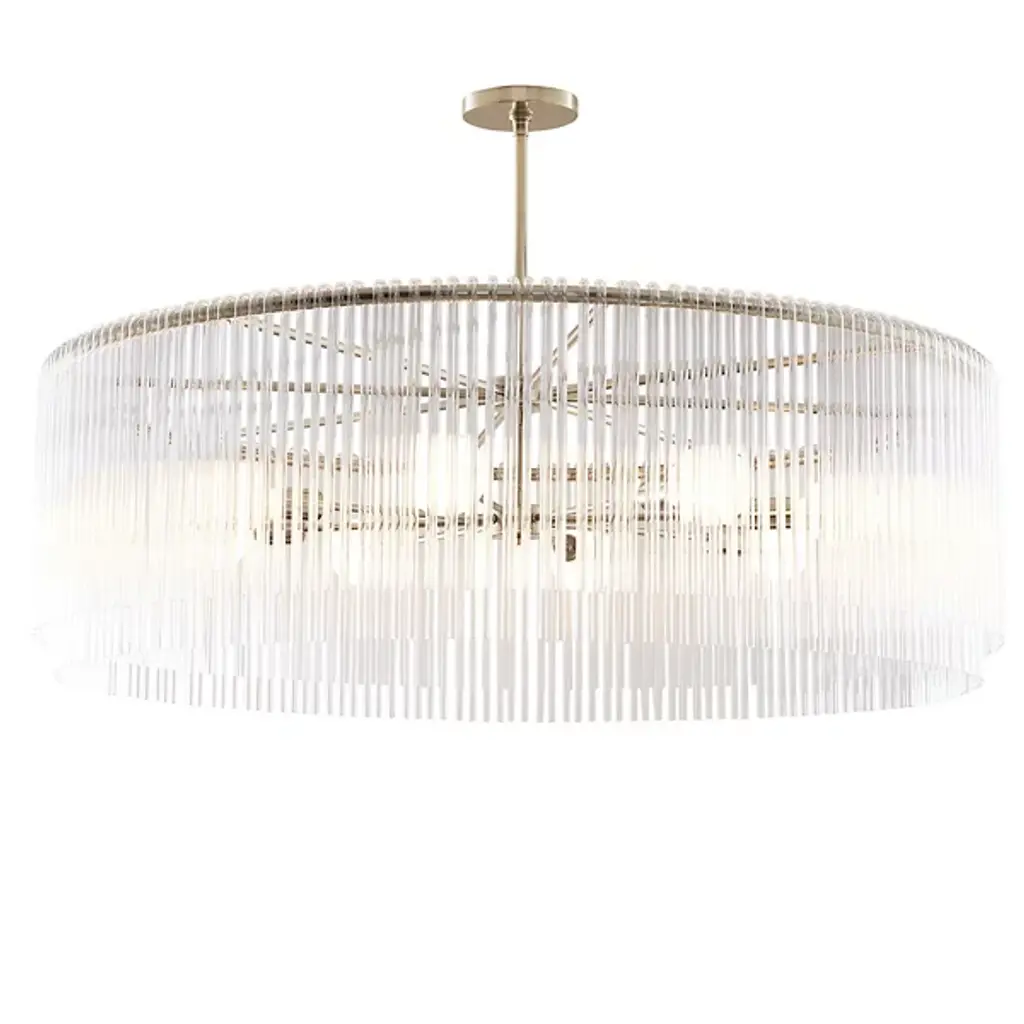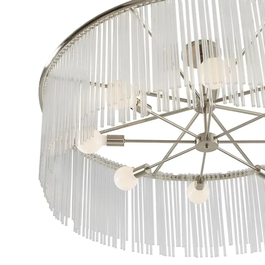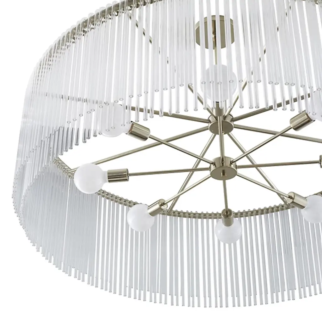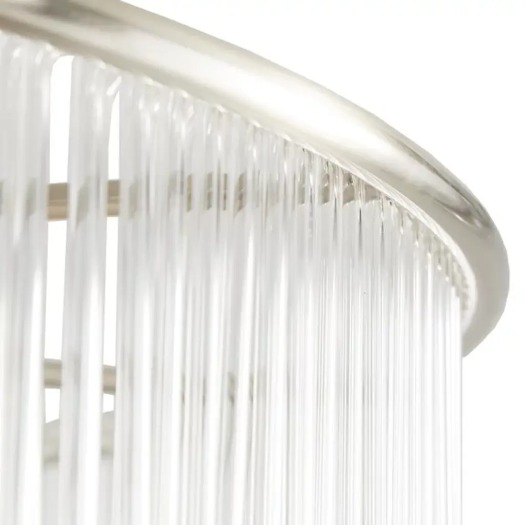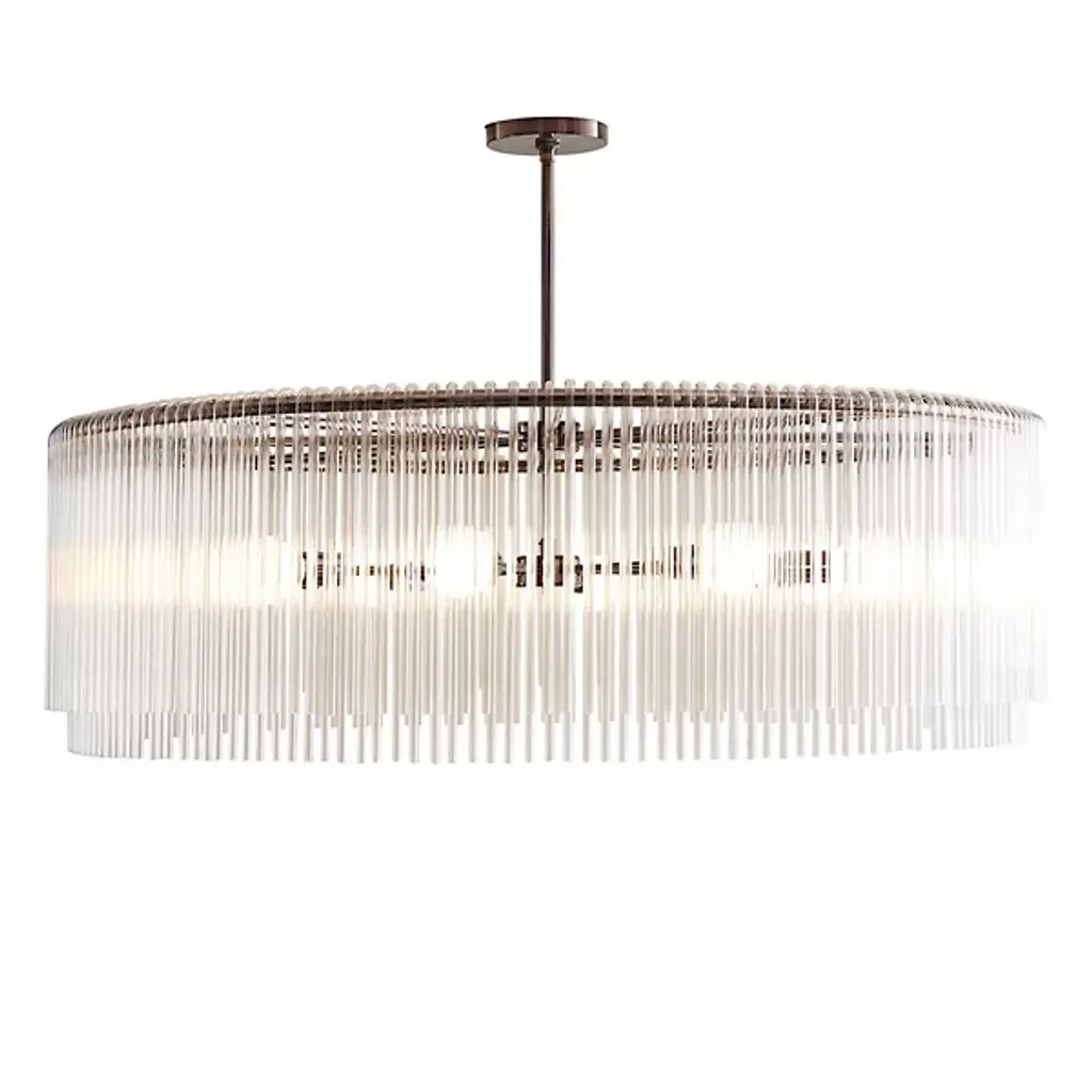 Stylishly adorn your home with a sophisticated Royalton Chandelier by Arteriors. The large steel frame is covered in vertical glass rods for a sleek design with transitional chic and spectacular sparkle. A breathtaking focal point above a living room or dining table, this large multi-light ceiling fixture is suspended from a round canopy and its downrod can be adjusted to hang at the desired height in interior spaces or covered exterior areas.