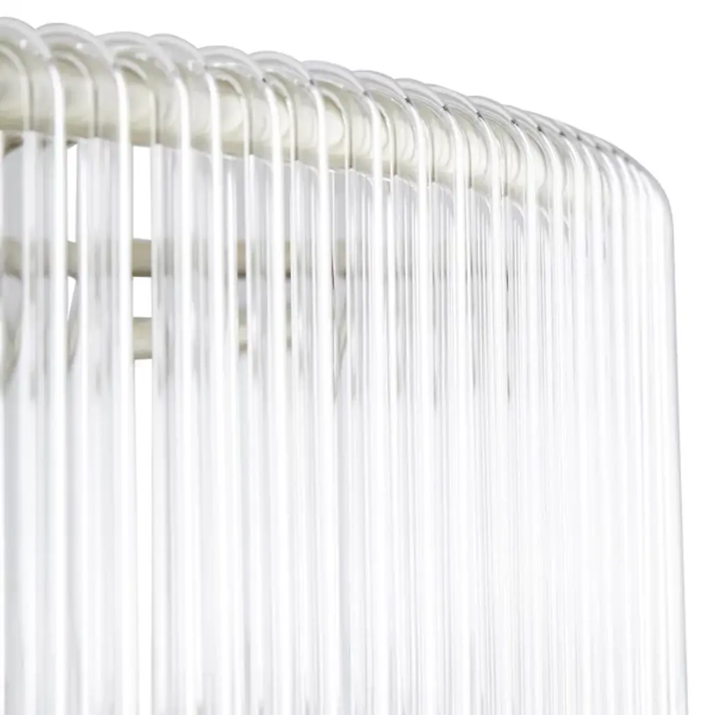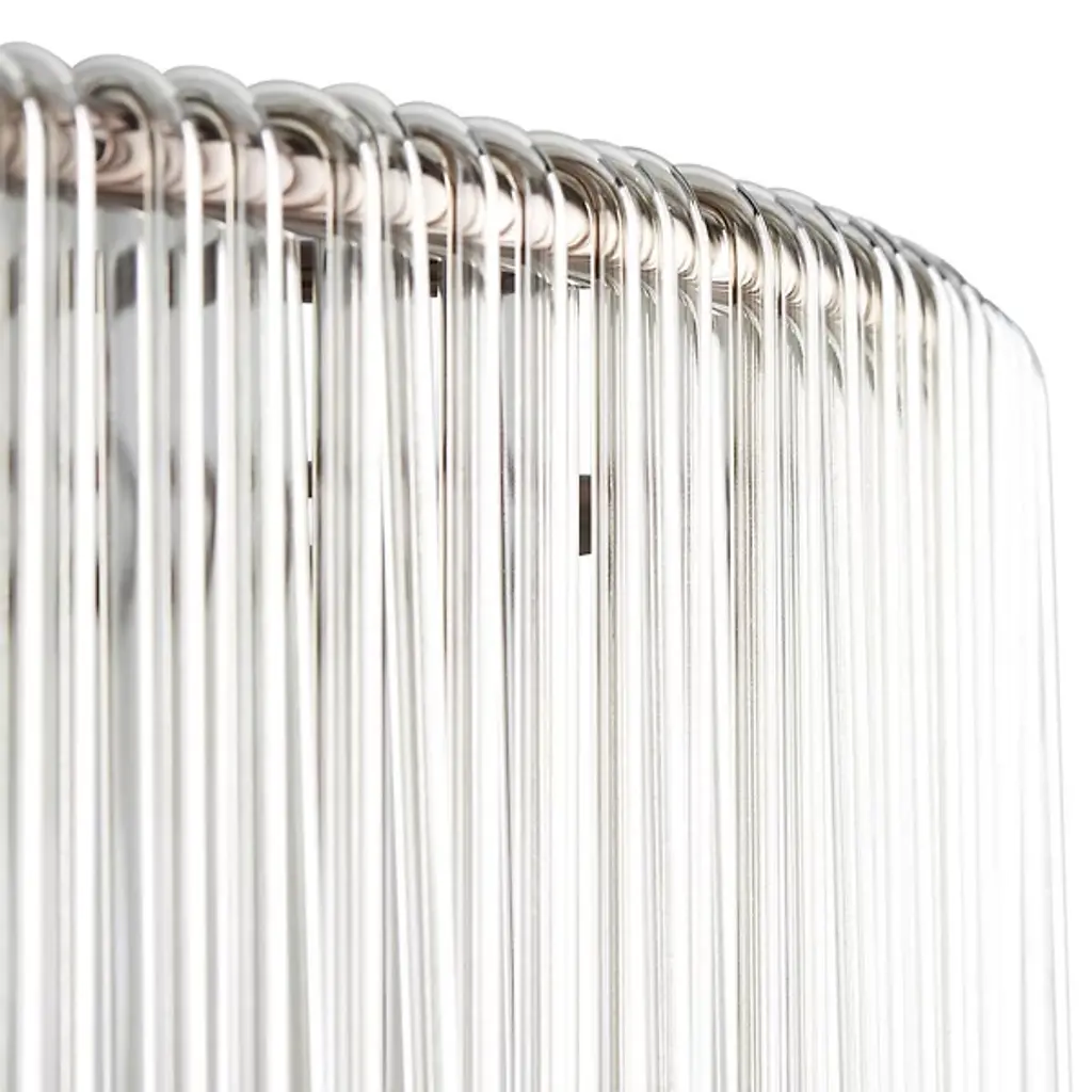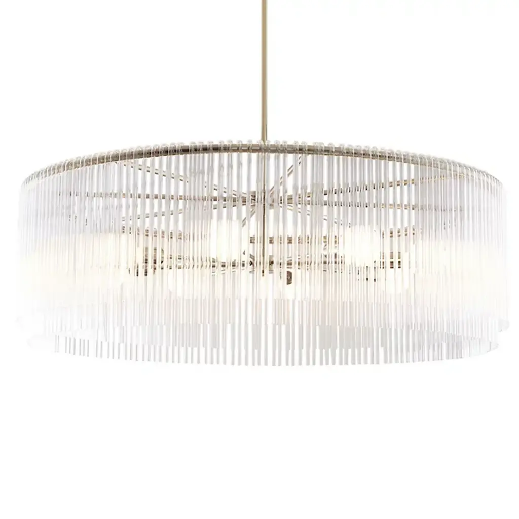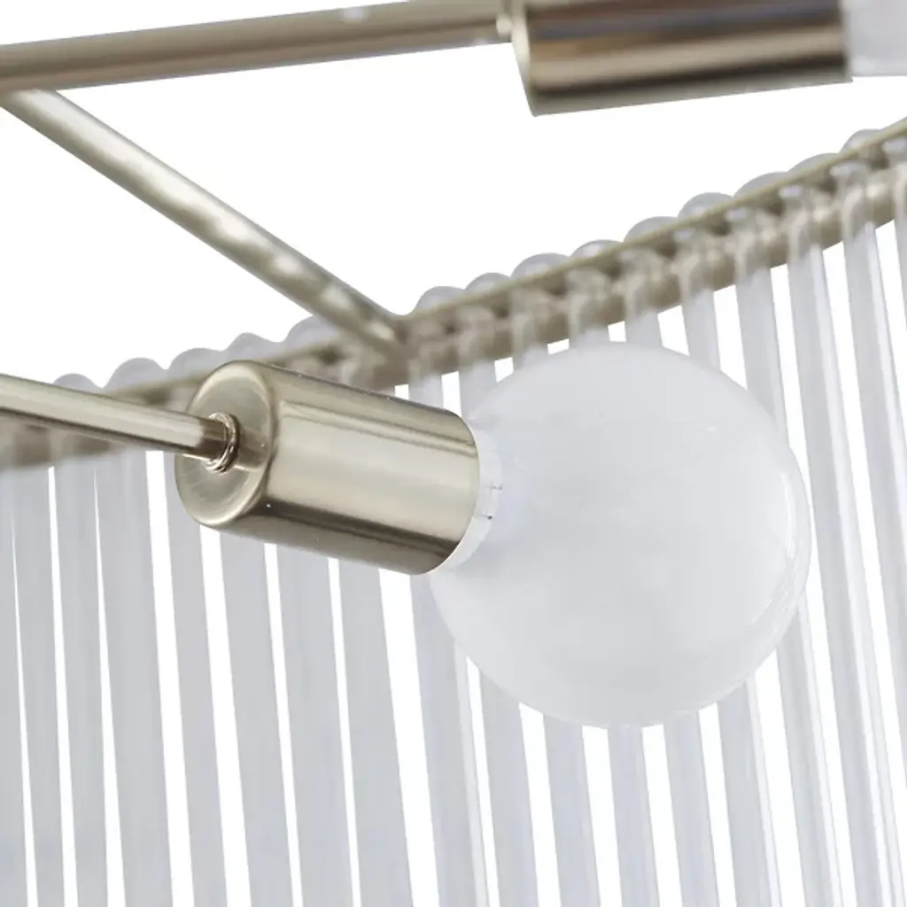 Stylishly adorn your home with a sophisticated Royalton Chandelier by Arteriors. The large steel frame is covered in vertical glass rods for a sleek design with transitional chic and spectacular sparkle. A breathtaking focal point above a living room or dining table, this large multi-light ceiling fixture is suspended from a round canopy and its downrod can be adjusted to hang at the desired height in interior spaces or covered exterior areas.